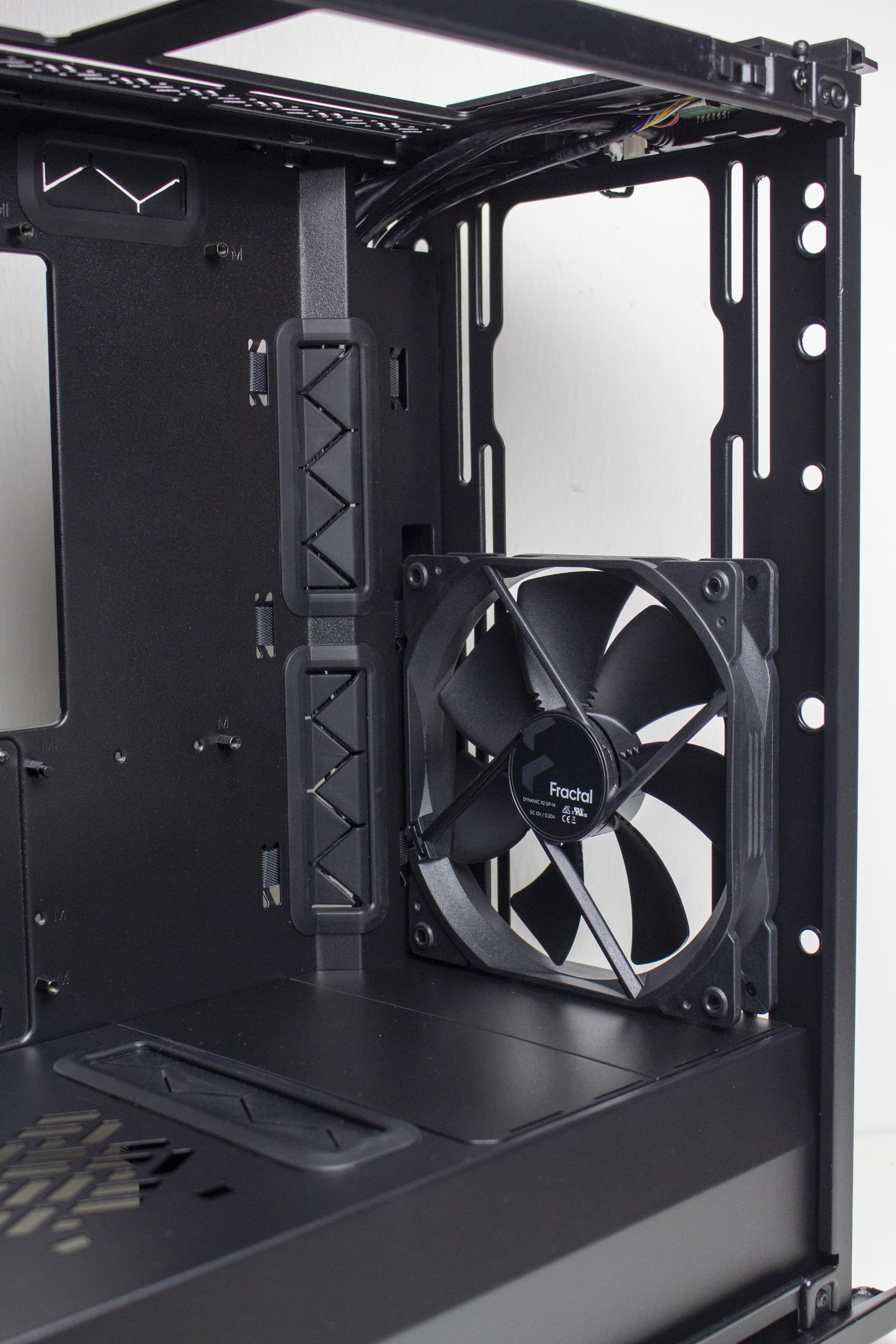 Ab Werk kommt das Fractal Design Define Mini 7 mit zwei vorinstallierten Gehäuselüftern vom Typ Fractal Design Dynamic X2. An der Front kommt ein Exemplar mit 140 Millimeter Rahmenbreite (Dynamic X2 GP-14) und am Heck die Version mit 120 Millimeter Rahmenbreite (Dynamic X2 GP-12) zum Einsatz. Beide Ventilatoren sind komplett schwarz gehalten und drehen mit maximal 1000 (Dynamic X2 GP-14) respektive 1200 (Dynamic X2 GP-12) Umdrehungen pro Minute. Der Anschluss erfolgt über ein herkömmliches 3-Pin-Kabel. Der Einsatz vom PWM-Varianten wäre bei dem Preis des Gehäuses wünschenswert gewesen.