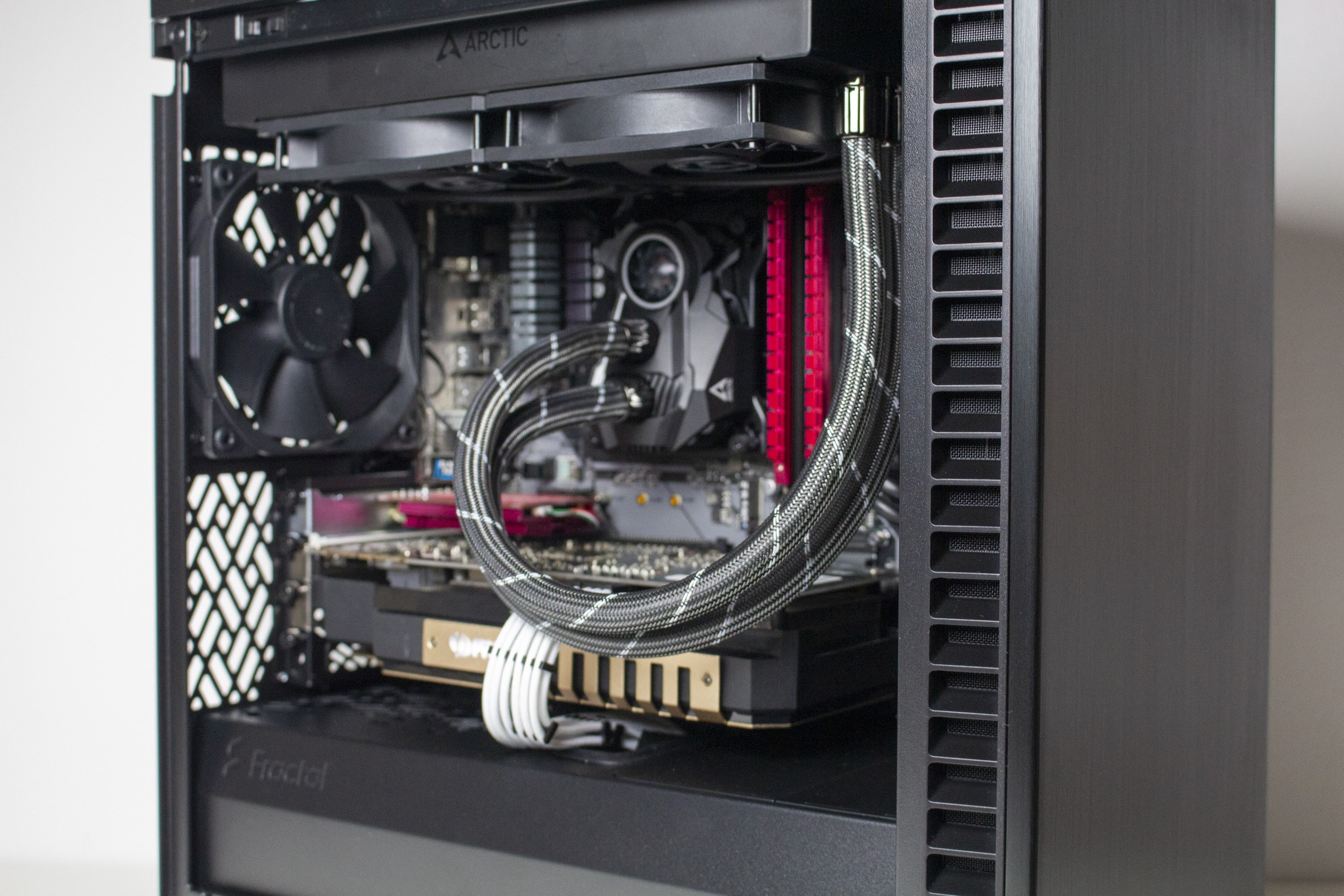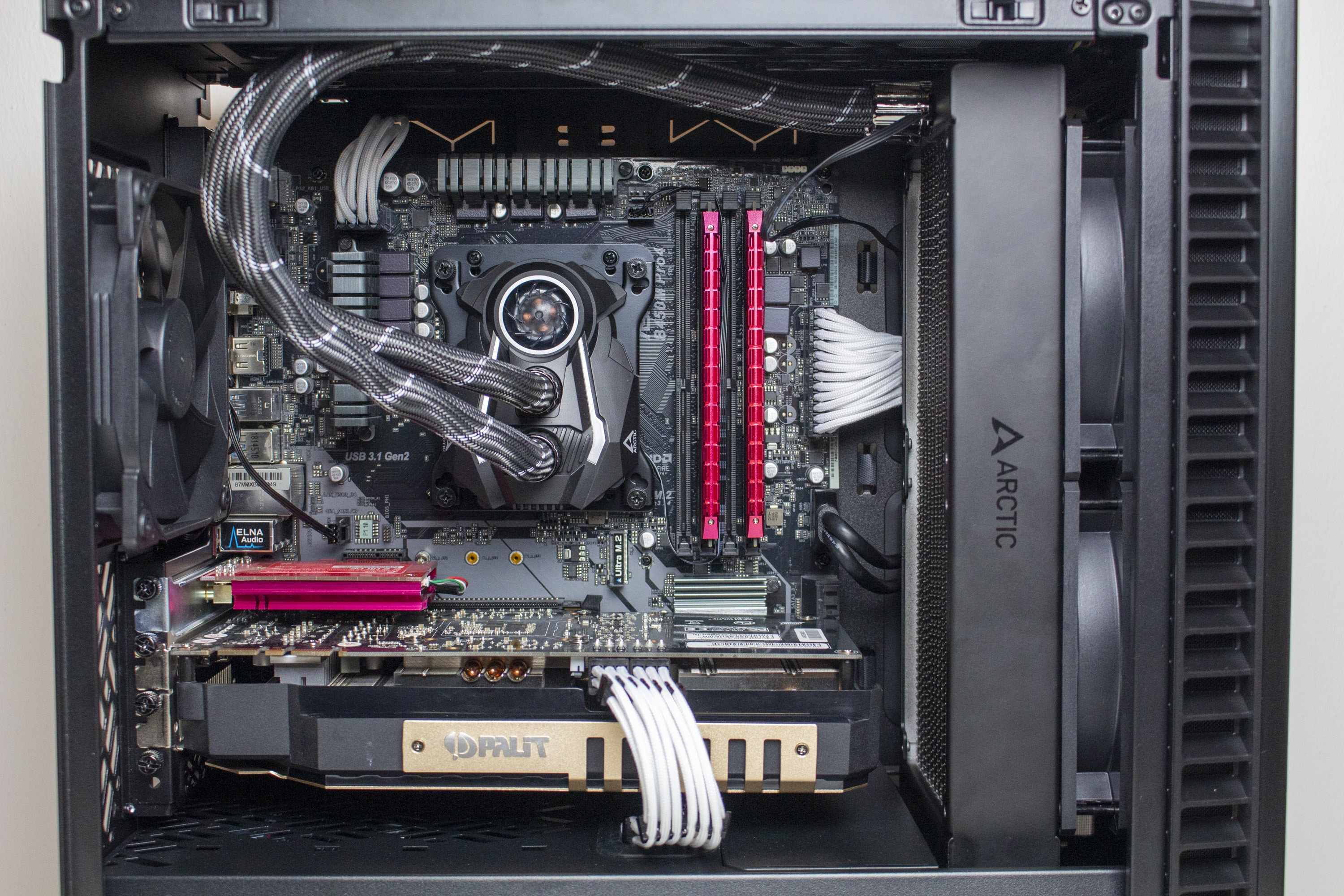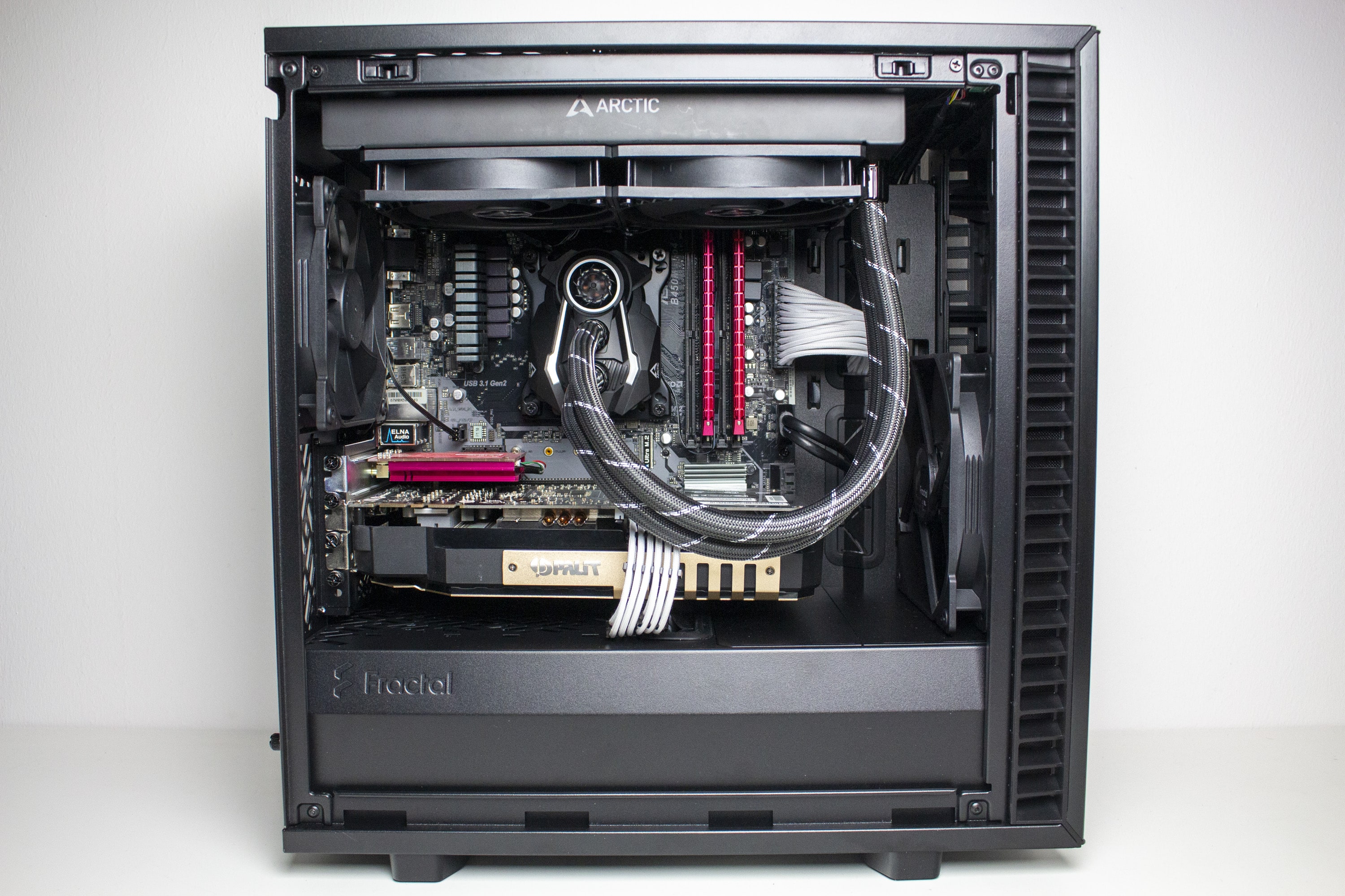 Der Einbau sowie die Verkabelung der Hardware waren grundsätzlich schnell gemacht, haben uns teilweise aber auch vor etwas größere Herausforderungen gestellt. Gut fanden wir die vorinstallierten Abstandshalter sowie den großzügig geschnittene Innenraum. Etwas Probleme hat uns die Montage der Wasserkühlung bereitet, da der Radiator der Arctic Liquid Freezer II mit 38 Millimetern besonders tief ist. Im Deckel wurde es mit den höheren Heatspreadern des RAMs sehr knapp und in der Front waren das USB- sowie das 24-Pin-ATX-Kabel fast im Weg. Weiterhin gibt es an der Rückseite eigentlich nur im Kabelkanal Platz für dickere Kabel. Mit Ehrgeiz und etwas mehr Konzentration bzw. Zeitaufwand konnten beide Szenarios aber erfolgreich umgesetzt und verkabelt werden. Weniger Tiefe Radiatoren oder ein CPU-Luftkühler sollten der Aufwand ebenfalls geringer halten.