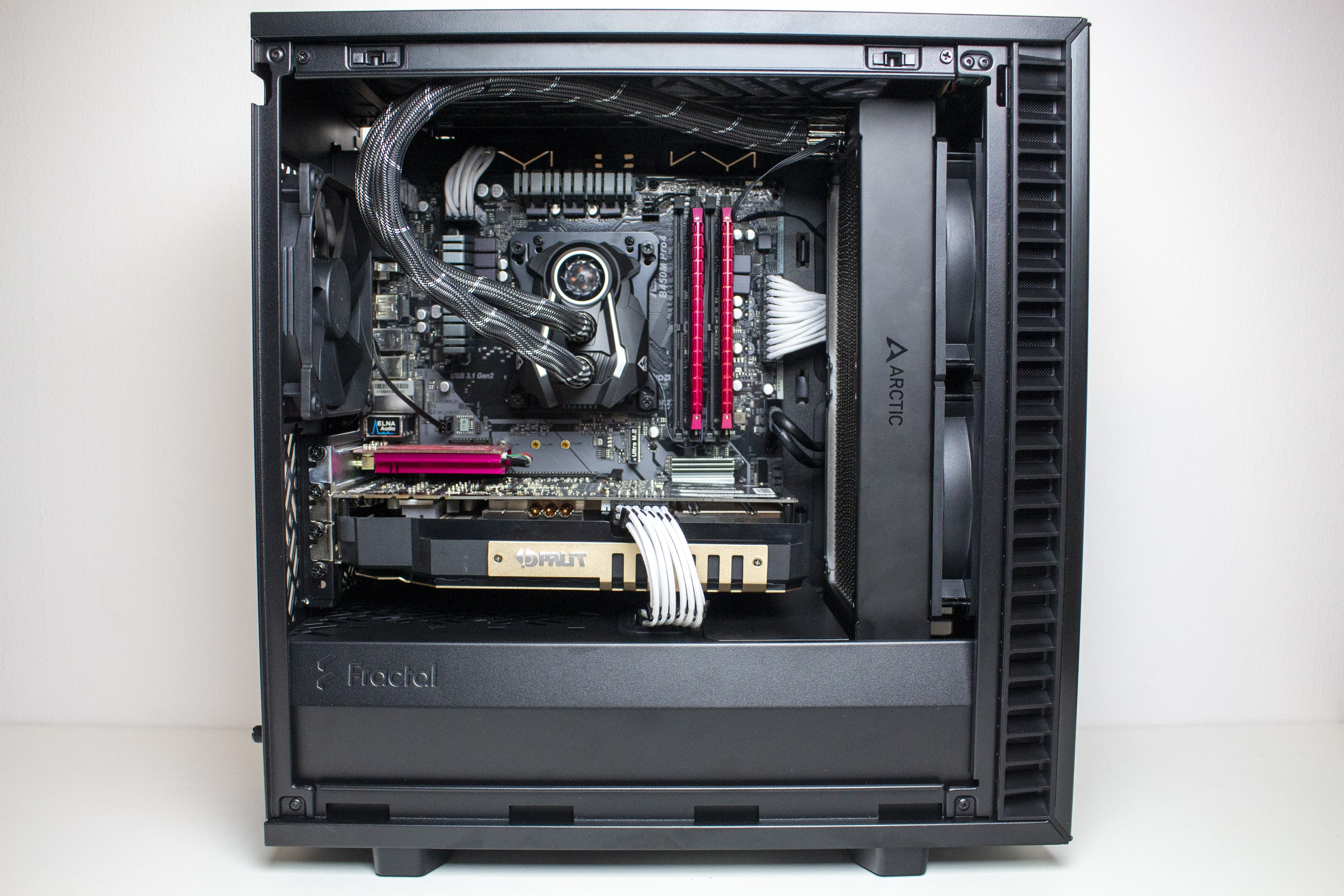 Nun kommen wir zum Systemeinbau beim Define 7 Mini Test. Als Hardware verwenden wir einen AMD Ryzen 5 5600X auf einem ASRock B450M Pro4 mit 16GB DDR4 3000 MHz. Der Ryzen wird von einer Arctic Liquid Freezer II 240* gekühlt und wird mit seinem Standardtakt betrieben. Für die Bildausgabe ist eine Palit GeForce GTX 970 JetStream zuständig. Die Stromversorgung erledigt das FSP Hyper mit 500W.