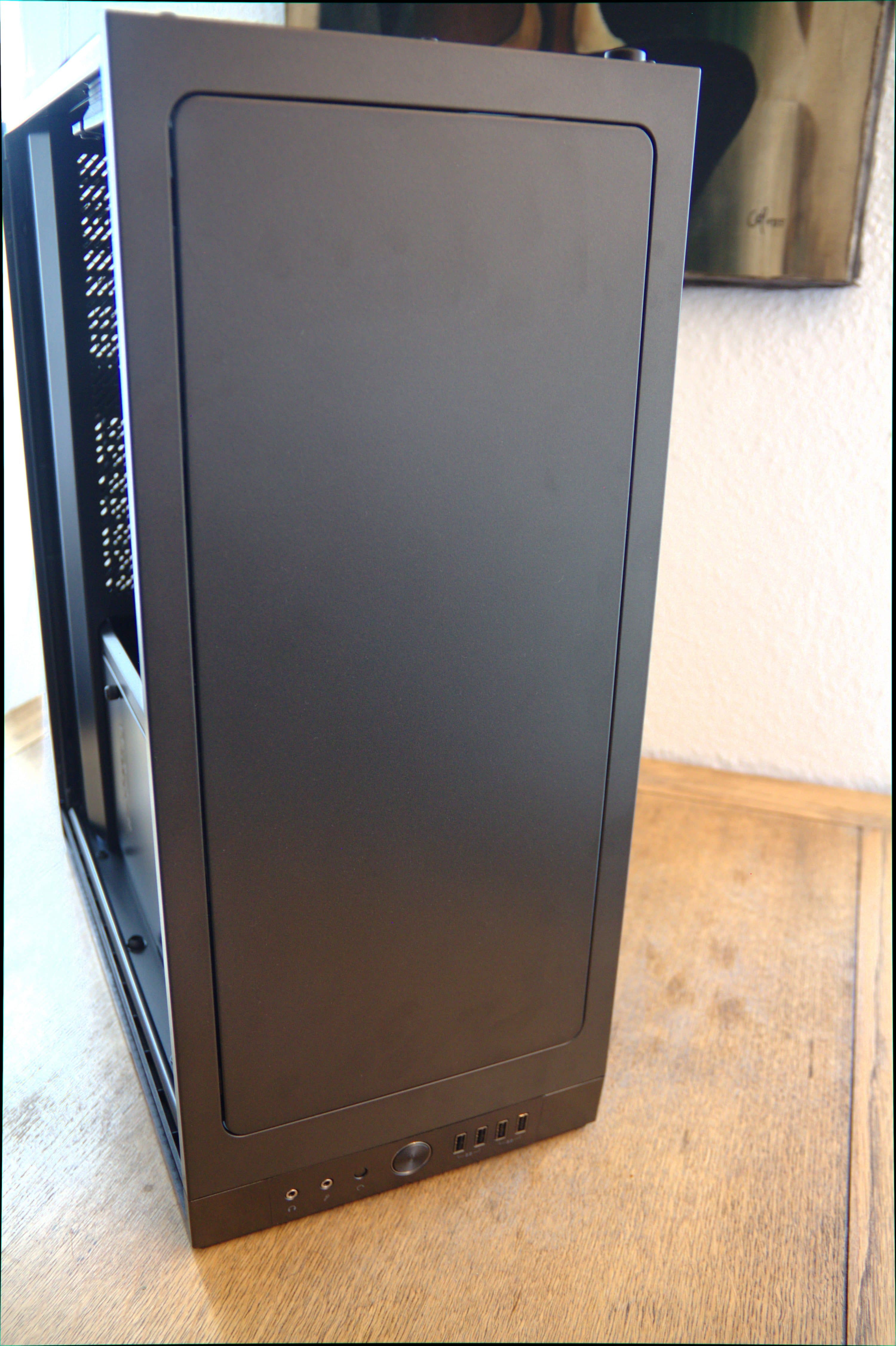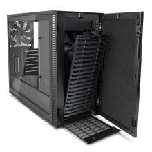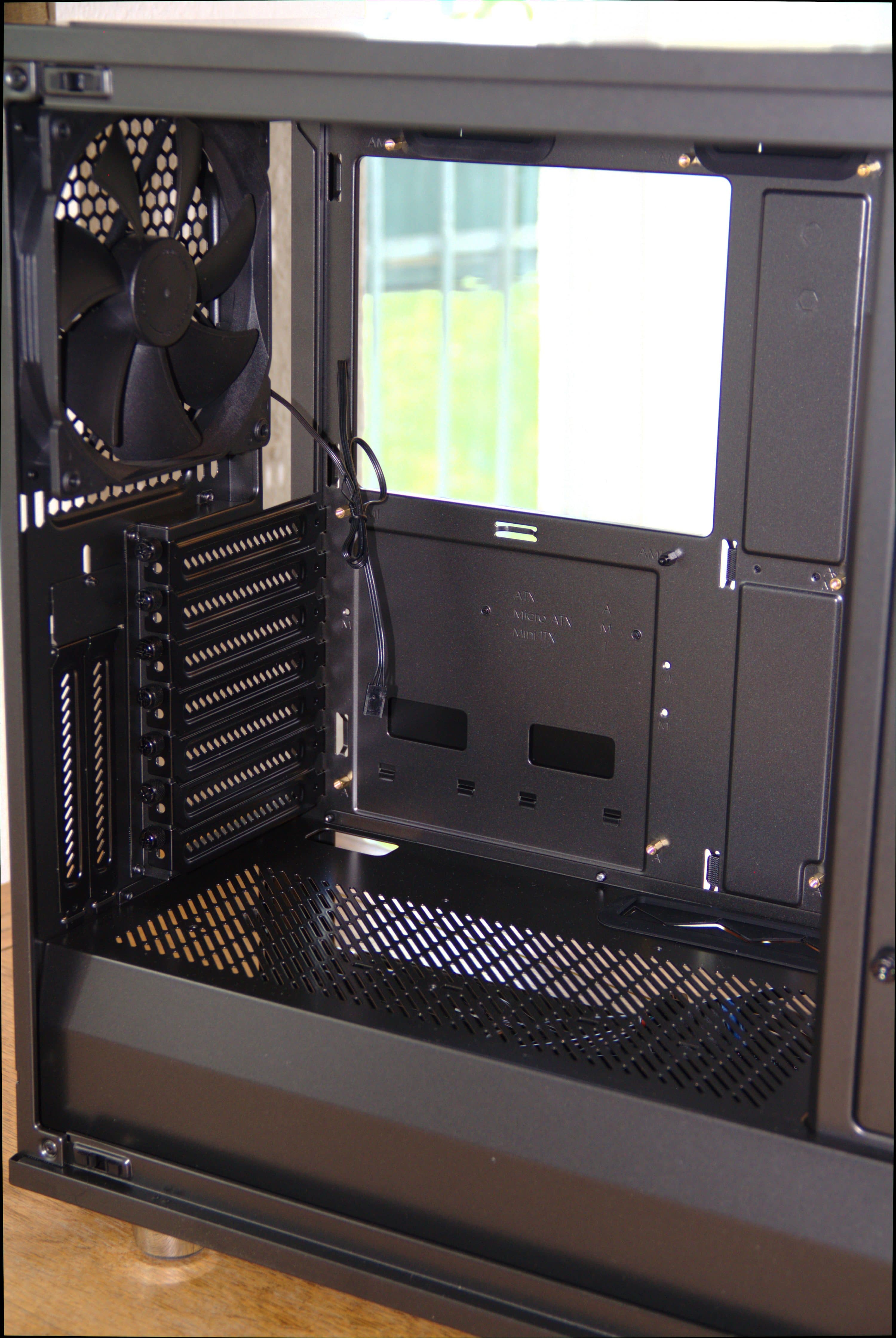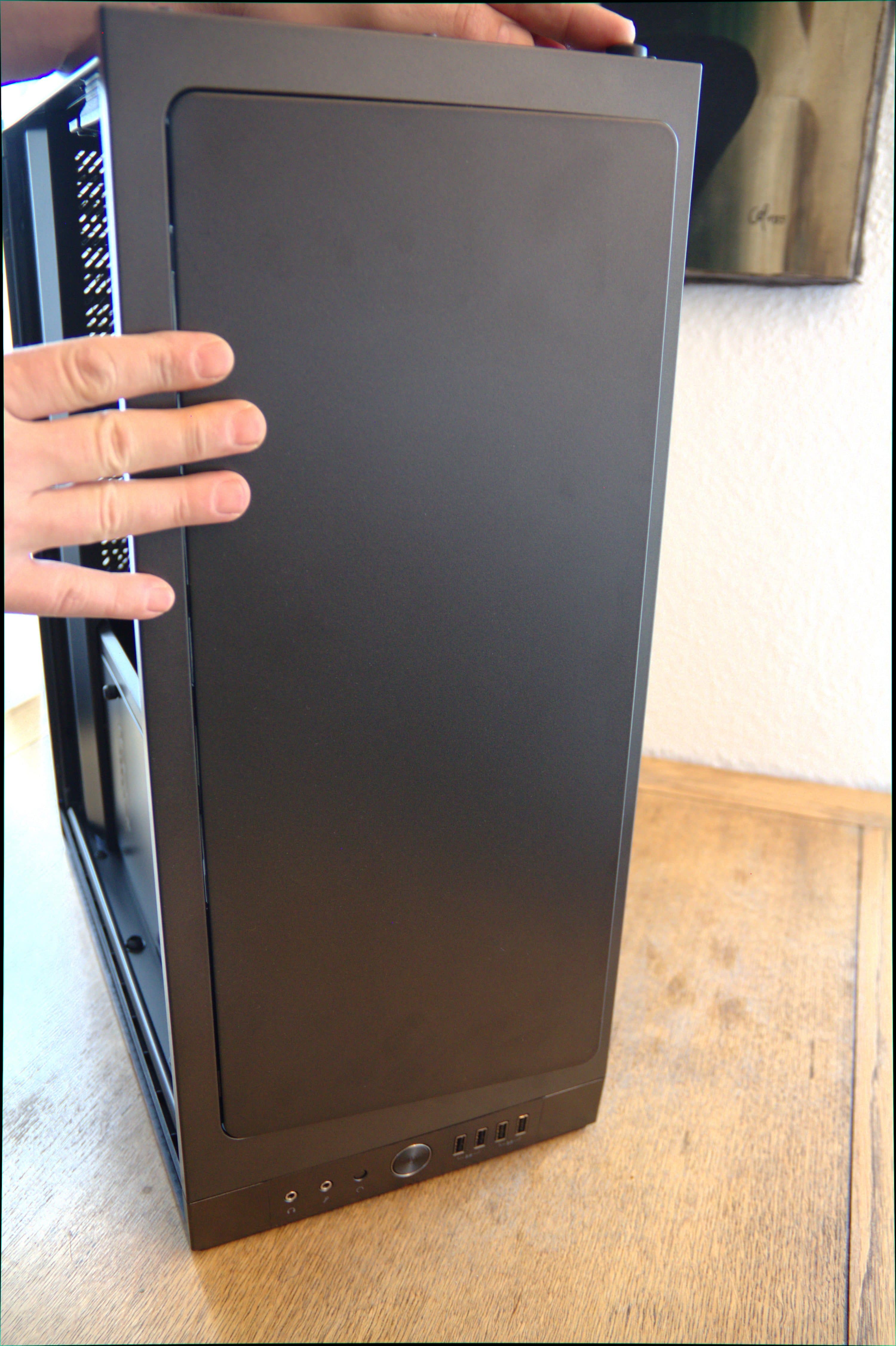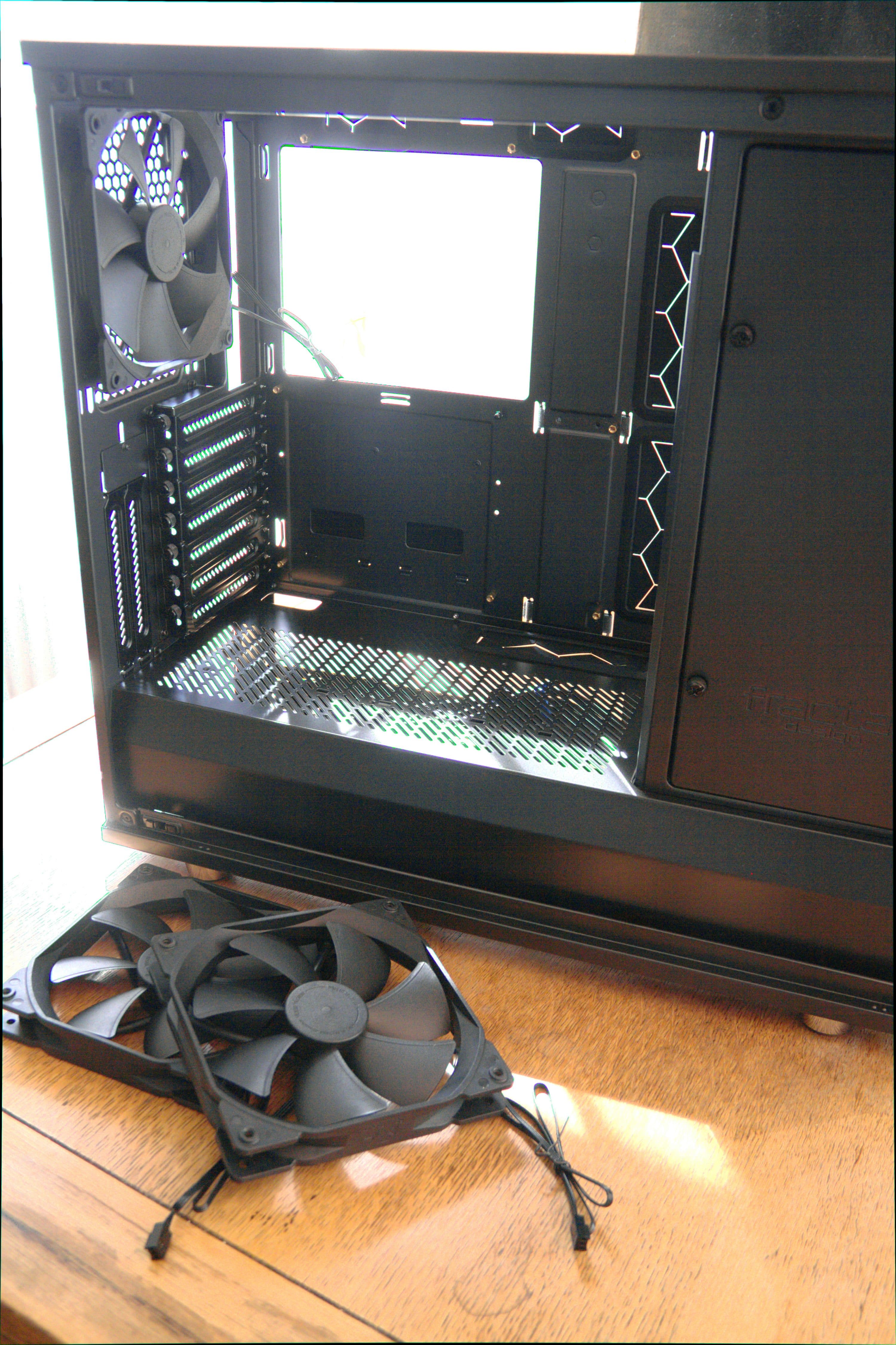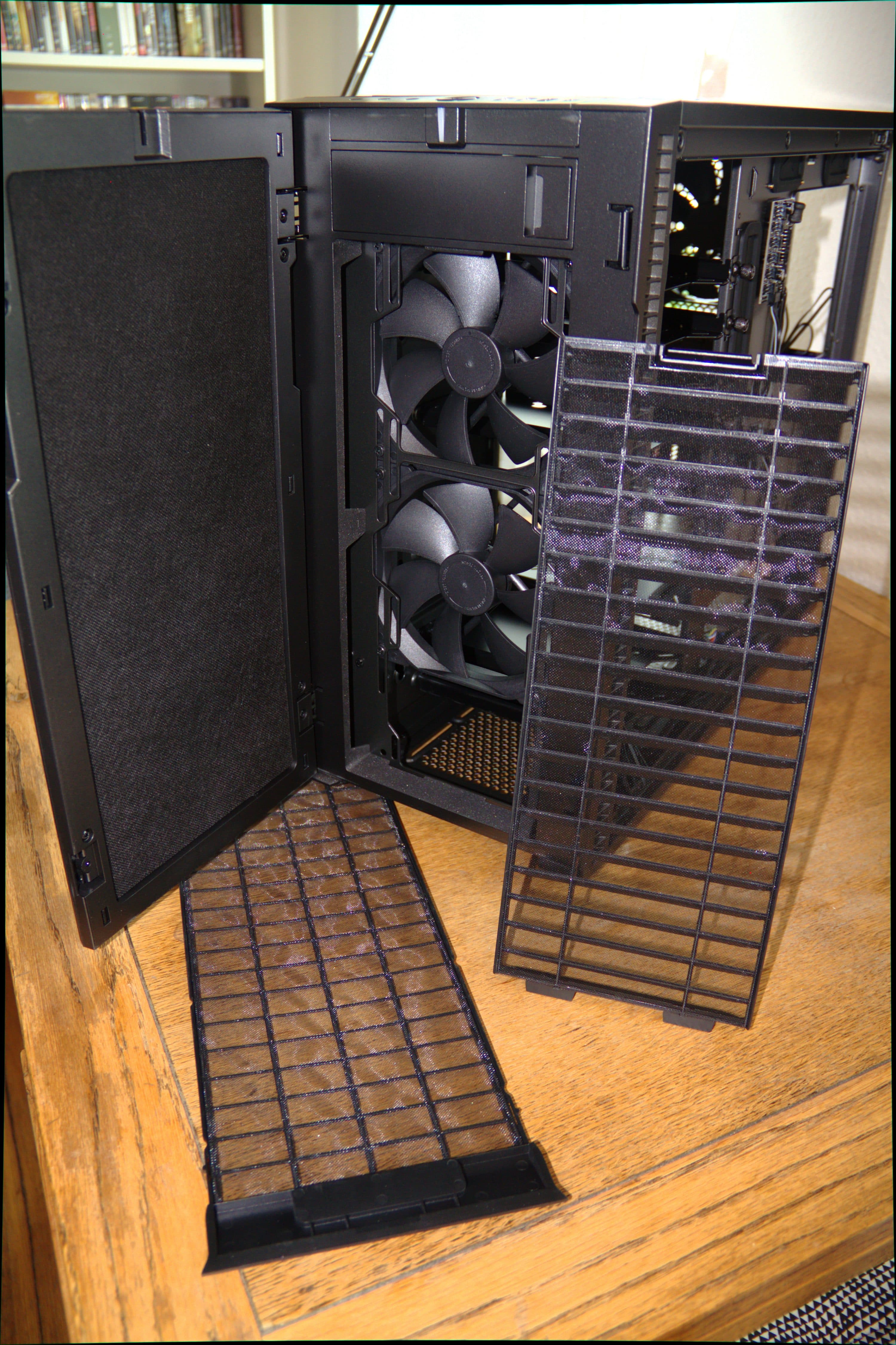 Wir beobachteten, dass die Temperatur im Inneren des Gehäuses um bis zu fünf Grad sank, wenn wir die vordere Tür öffneten und die PCI-Slot-Blenden an der Rückseite entfernten. Die Vordertür lässt sich zwar gänzlich entfernen, um die Airflow zu verbessern, die Bügel am Rahmen für die Scharniere der Tür sind aber ziemlich prominent platziert und stören dann die Optik der ansonsten ansehnlichen Vorderseite. Außerdem fällt dann natürlich die akustische Dämmung weg, die an der Rückseite der Vordertür verklebt ist.