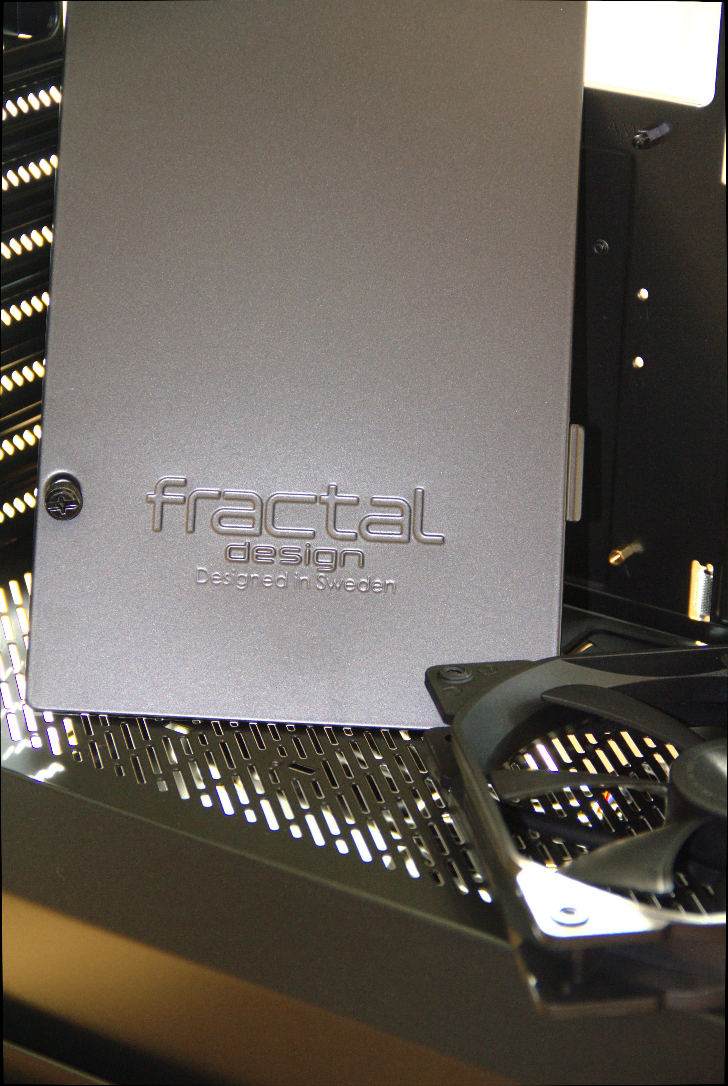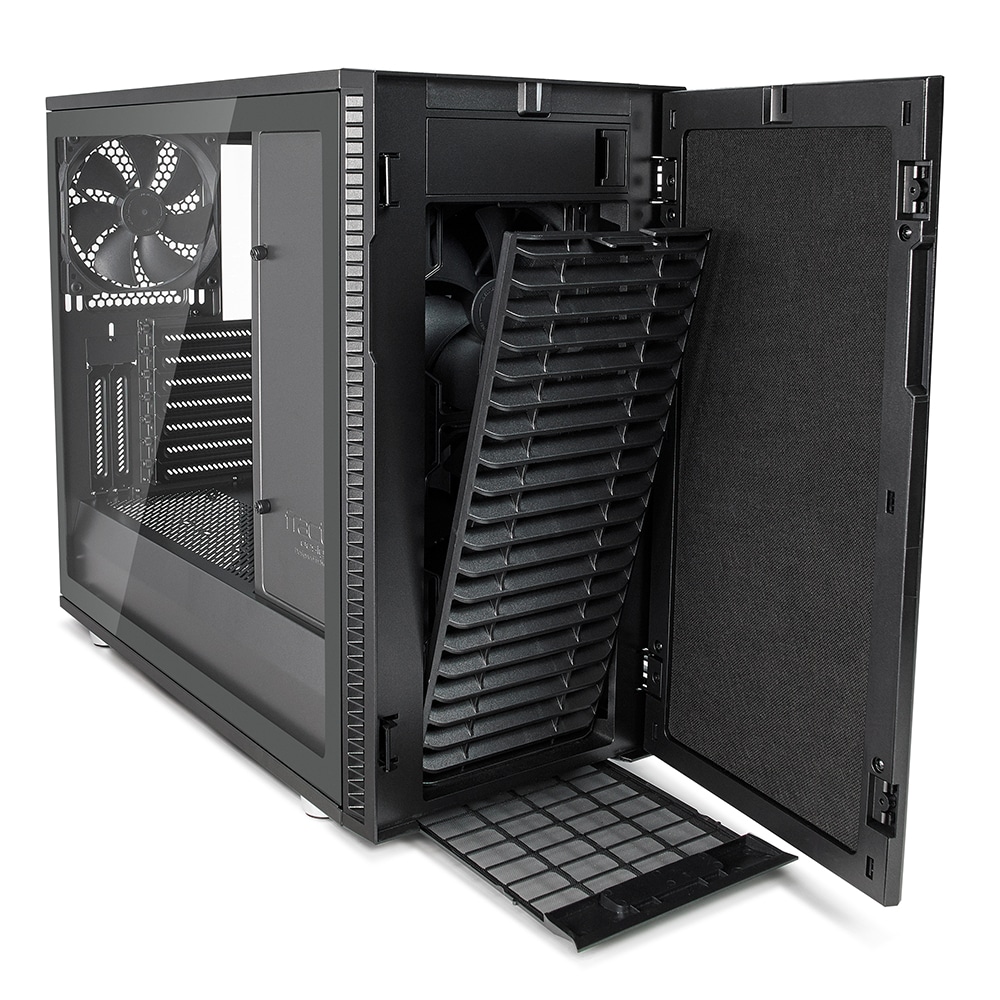 Die Vorderseite ist durchgehend aus gebürstetem Aluminium, bis auf eine kleine Aussparung oben in der Mitte, die den unteren Teil der weißen LED des Power-Buttons freigibt. Bei der Vorderseite handelt sich um eine Tür, die geöffnet den Blick auf eine Jalousie-artige Blende samt dem ersten von insgesamt drei Staubfiltern freigibt. Die Blende lässt sich durch einen Griff an der Oberseite entfernen. Dahinter befinden sich zwei der drei vorinstallierten Lüfter. Fractal Design hat sich hier für 140-mm-Lüfter entschieden, die Luft durch seitliche Einlässe ansaugen, die im Rahmen um die Vordertür eingelassen sind. Alternativ lassen sich hier drei 120er Lüfter installieren. Die Lüfter können auch mit entsprechend großen Radiatoren ersetzt werden. Der Rahmen selbst ist aus Kunststoff. Die Scharniere der innen gedämmten Tür lassen sich rechts oder links platzieren. Dazu müssen lediglich die Schrauben der Scharniere an der Tür entfernt und umgesetzt werden.