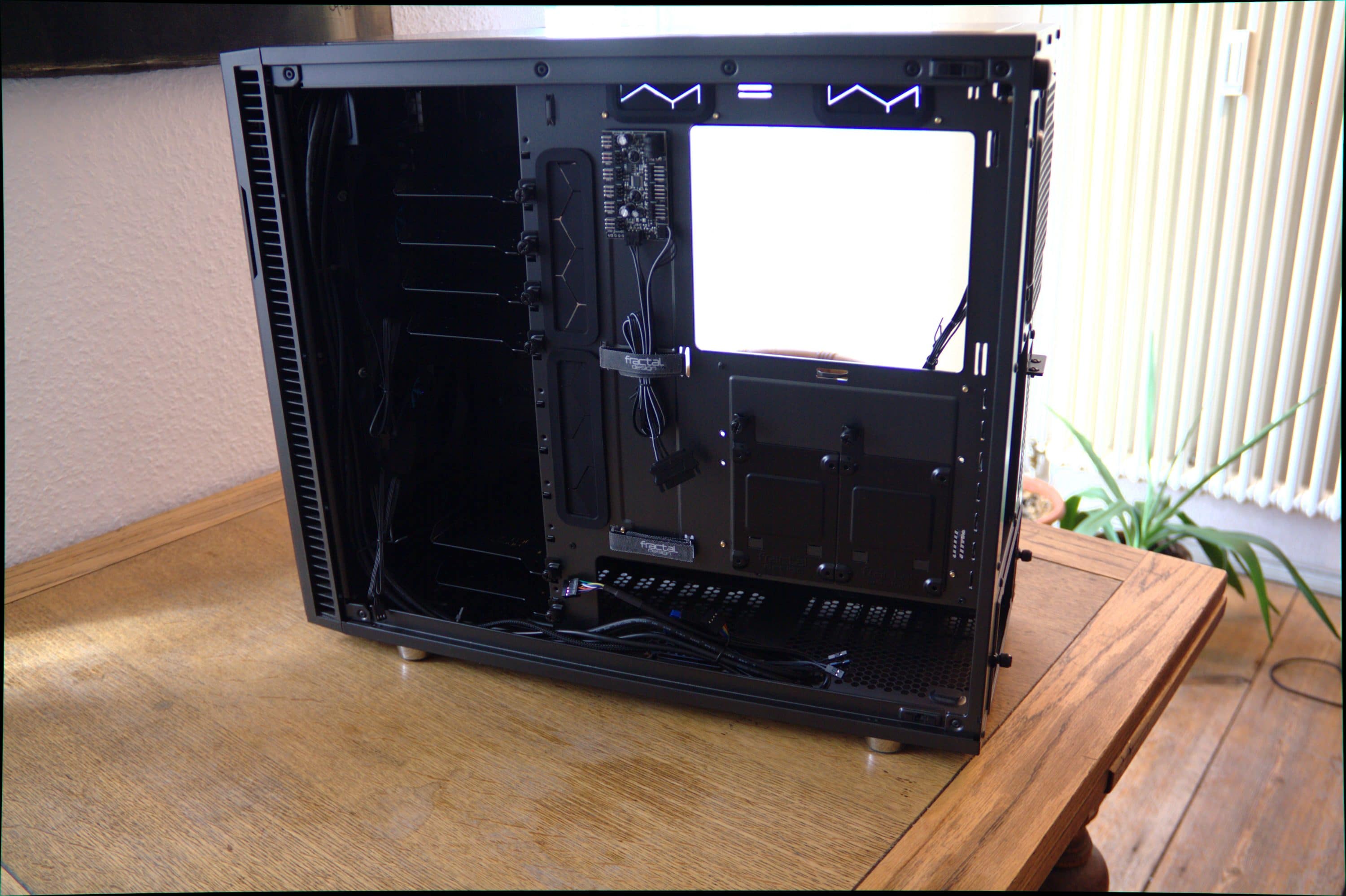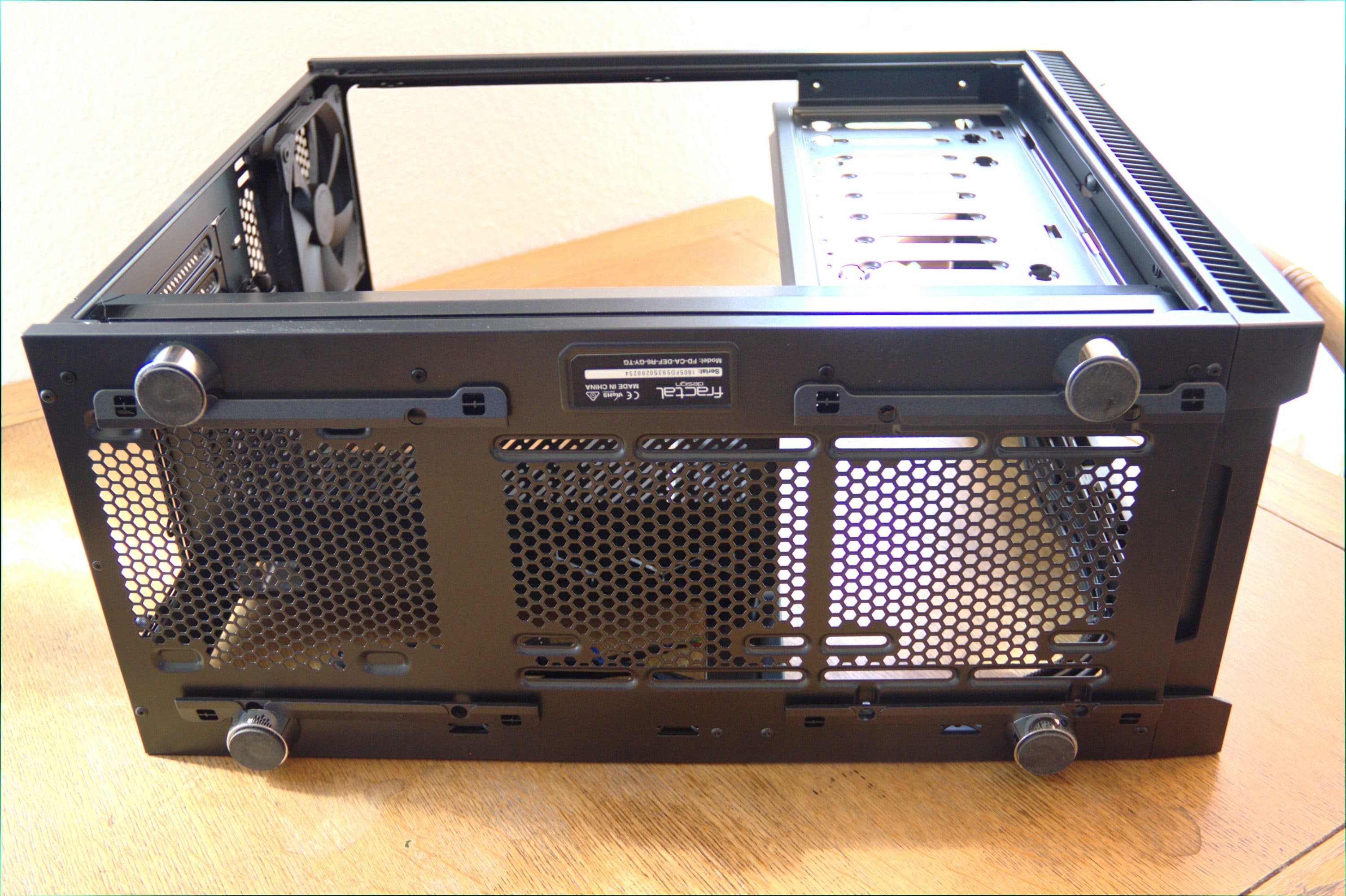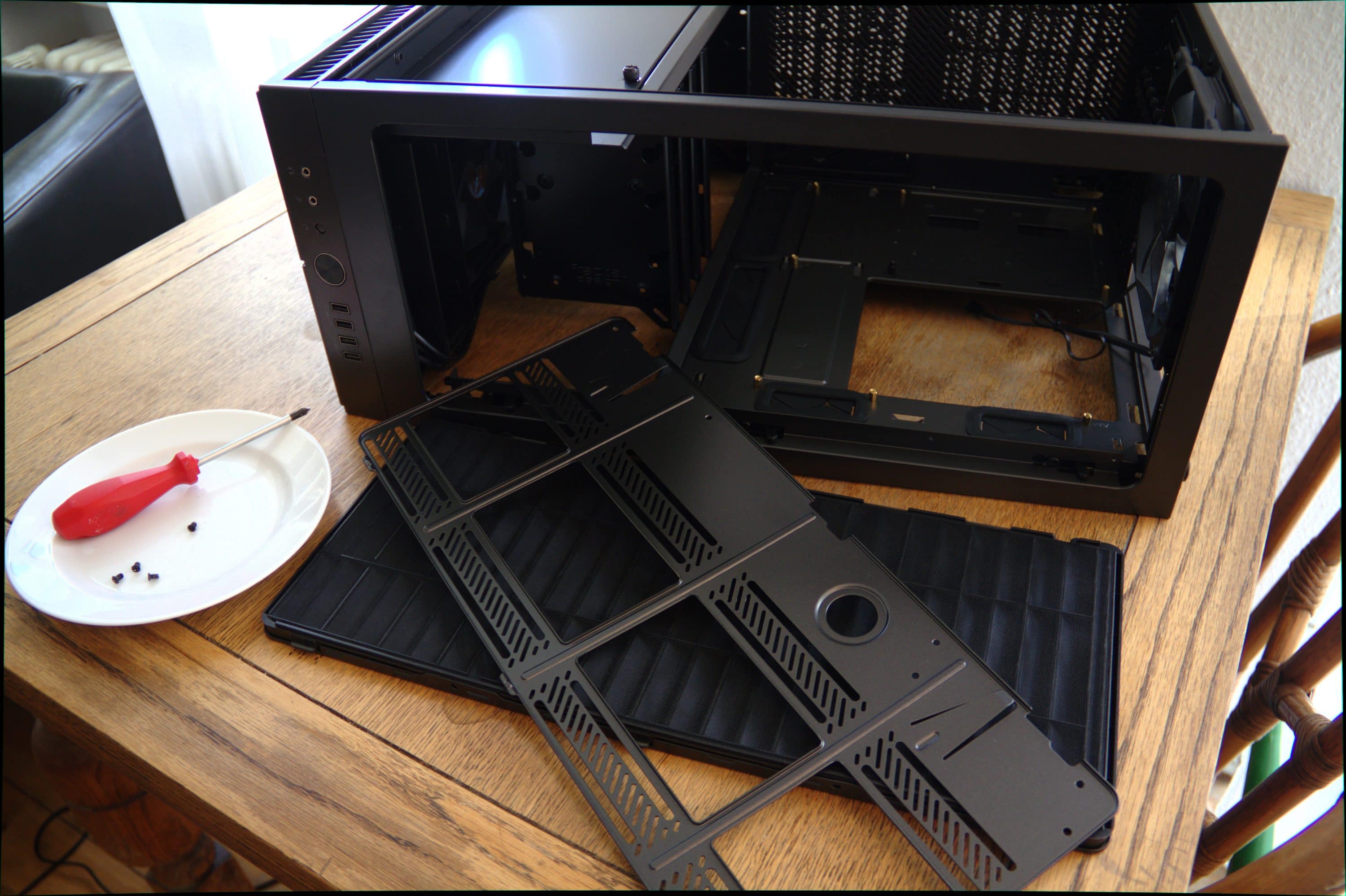 Der Umbau vom Standard- zum offenen Design besteht darin, die Stützblende des HDD-Käfigs an die Rückseite des Gehäuses zu verfrachten. Sie bildet dann eine Verlängerung des Mainboard-Trays und dem dahinterliegenden Raum für das Kabelmanagement, das mit 23 Millimeter zwar knapp gehalten ist, aber dennoch genügend Raum bietet. Beim Umbau muss das Gehäuse weitgehend auseinander genommen werden. Die vordere Tür und der dazugehörige Rahmen sowie der untere Luftfilter, der sich erfreulicherweise nach vorne herausziehen lässt und sich über die gesamte Unterseite erstreckt, müssen ebenso entfernt werden, wie der Deckel samt oberem Bracket und die kurze Halterung für das 5,25-Zoll-Laufwerk. Die Sichtblende mit dem Logo von Fractal Design muss ebenfalls abgeschraubt werden, sie verbirgt später den Blick auf die Rückseite und die dort angebrachten Datenträger und die Kabel.