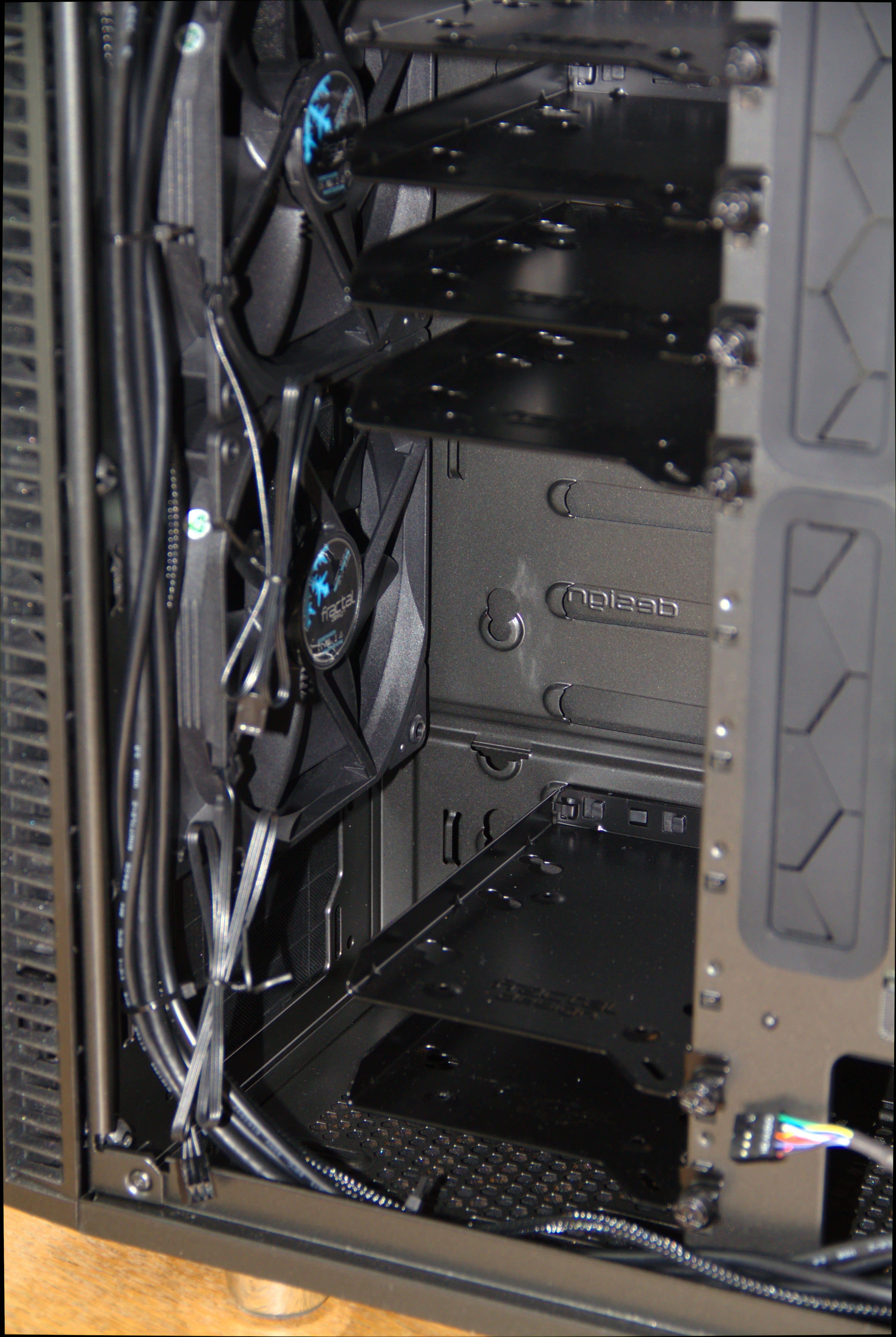 Der HDD-Käfig besteht auf der einen Seite aus der Stützblende neben dem Mainboard-Tray, die vom Deckel bis zum Boden reicht. Die rechten Schienen sind direkt am Gehäuse angebracht. Für HDD- oder SSD-Laufwerke hat Fractal Design sechs Einschübe samt Gummidämpfer und Schrauben beigelegt, insgesamt passen dort aber elf hin. An der Rückseite des Mainboard-Trays gibt es eine Halterung für zwei weitere SSDs, die Alternativ auf der Netzteilabdeckung befestigt werden können. Die gesamte Vorderseite des HDD-Käfigs ist mit einer verschraubten Sichtblende versehen, die mit einem unauffälligen eingestanzten Fractal-Design-Logo verziert ist.