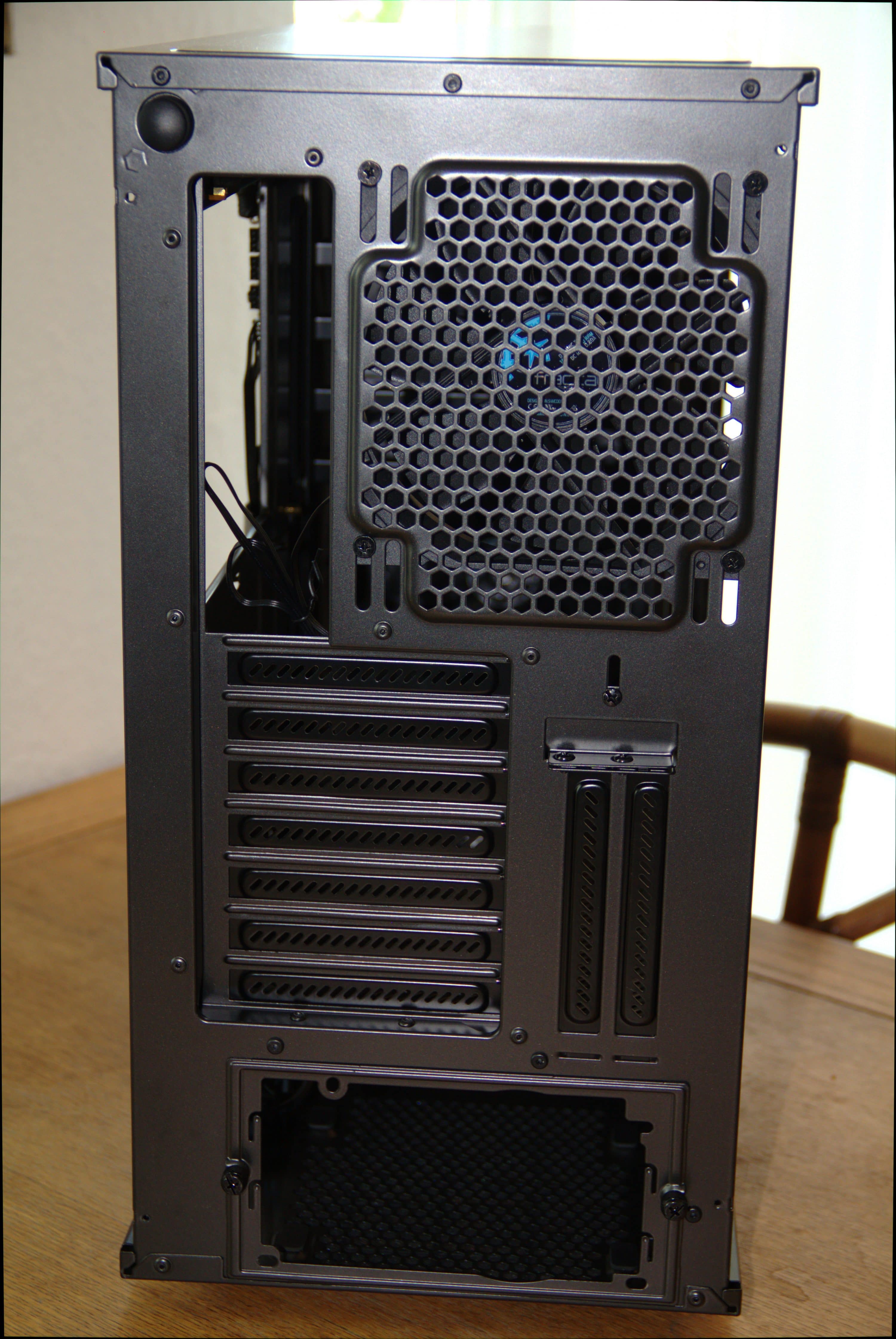 An der Rückseite ist ein weiterer 140-mm-Lüfter vorinstalliert. Darunter befinden sich die üblichen sieben PCI-Slots. Daneben sind zwei weitere vertikale Slots, an denen sich eine Grafikkarte anbringen lässt. Das dazu benötigte Riser-Kabel liegt dem Gehäuse nicht bei. Der Abstand zu dem linken Seitenteil aus Tempered Glass ist groß genug, dass im vertikalem Einbau auch eine 2,5-Slot große Grafikkarte hinpasst. Für den CPU-Lüfter istr mit 185 Millimeter ebenfalls viel Platz vorhanden. Grafikkarten dürfen insgesamt 400 Millimeter lang sein, selbst wenn an der Vorderseite Lüfter werkeln. Im Standard-Layout steht der hohe HDD-Käfig etwas im Weg, der sich zwischen Mainboard-Tray und Vorderseite befindet. Grafikkarten, die länger sind als 300 Millimeter, dürfen samt Kabelanschlüsse dann nicht breiter sein als 155 Millimeter.