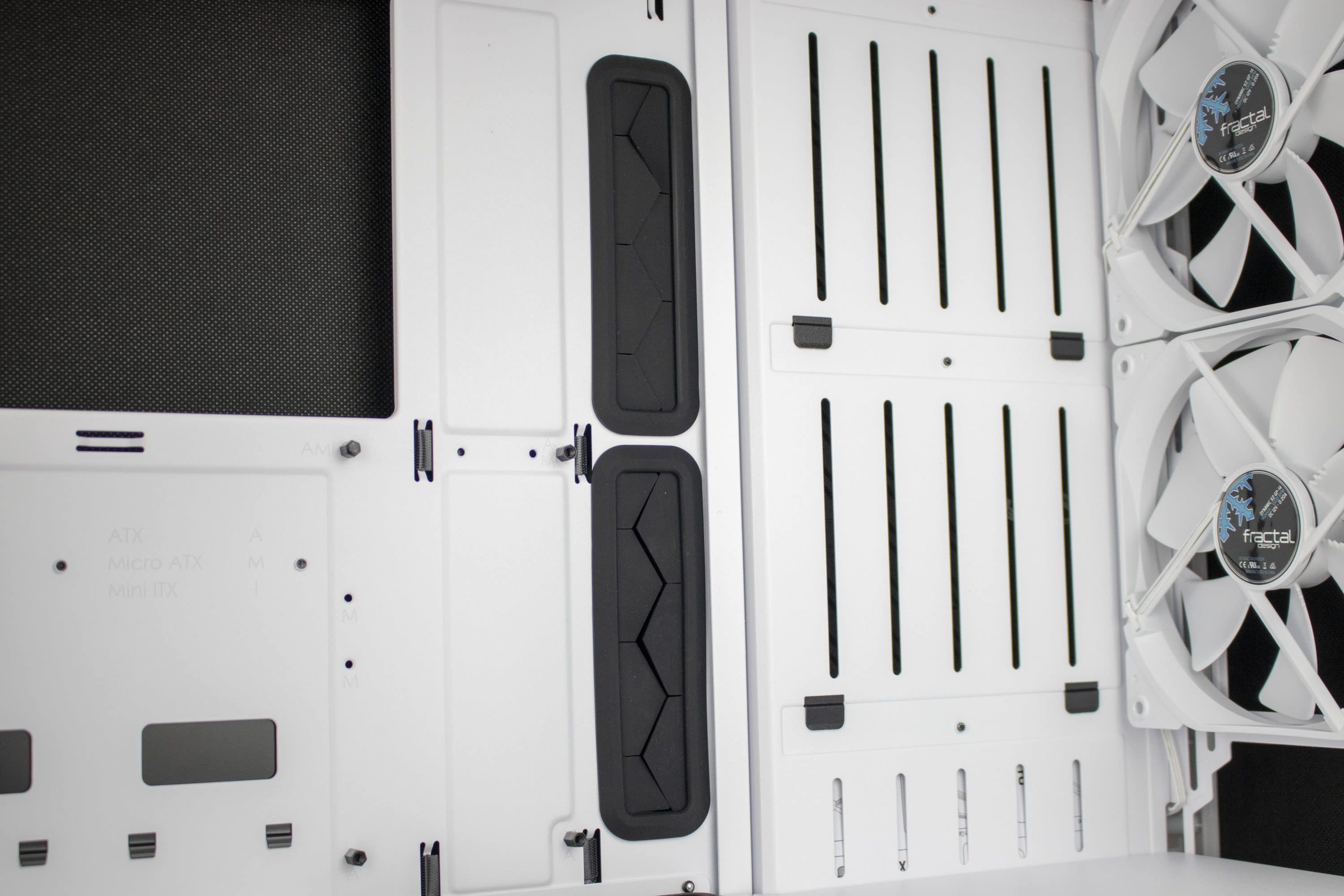 Äußerlich ist das Gehäuse schlicht gehalten. Farblich bleibt die Wahl zwischen Black, Blackout, Gunmetal und White. Während das Black-Modell im Innenraum auf weiße Akzente setzt, ist das Blackout-Modell komplett schwarz. Der Deckel ist abnehmbar und ein Seitenfenster aus temperiertem Glas gibt den Blick auf die im Inneren verbaute Hardware frei. Bereits hier findet sich die erste Neuerung. Ließ sich das Blickfenster beim Vorgänger nur per Schraube öffnen und schließen, verfügt es nun über einen schraubenlosen Schließmechanismus. Ein Blick ins Innere verrät, dass der offene Gehäuseaufbau, der mit dem Define S eingeführt wurde, mit dem Nachfolger fortgeführt wird. Ansonsten unterschiedet der Aufbau des Gehäuses sich jedoch deutlich von dem des Vorgängers. So verfügt das Define S2 über eine Netzteilabdeckung, eine neue Deckelkonstruktion und einige weitere Extras – Näheres hierzu findet sich im zweiten Abschnitt „Ausstattung und Modulbau“.