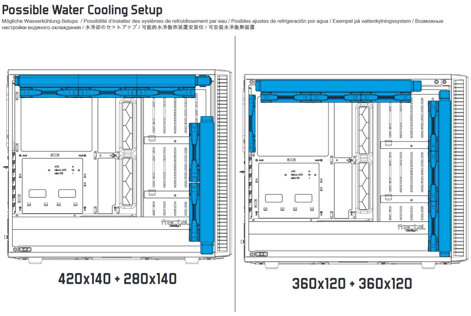 Im Vergleich zum Vorgängermodell erweitert Fractal Design das Platzangebot also und schafft so mehr Freiheiten für den Nutzer. Fractal Design stellte im Rahmen der Veröffentlichung des neuen Modells eine Skizze vor, die die verschiedenen Kombinationsmöglichkeiten in Bezug auf die Anbringung der einzelnen Kühlelemente aufzeigt.