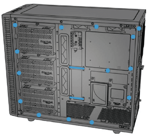Das Gehäuse bietet Platz für neun 120- oder 140-mm-Lüfter und drei Radiatoren. Hierbei kann ein 420-mm-Radiator im Deckel und ein kleinerer 360-mm-Radiator in der Front angebracht werden. Weiteren Platz für Lüfter oder Radiatoren finden Nutzer am Heck und am Boden in der Netzteilkammer. Dort ist Raum für einen weiteren 280-mm-Radiator.