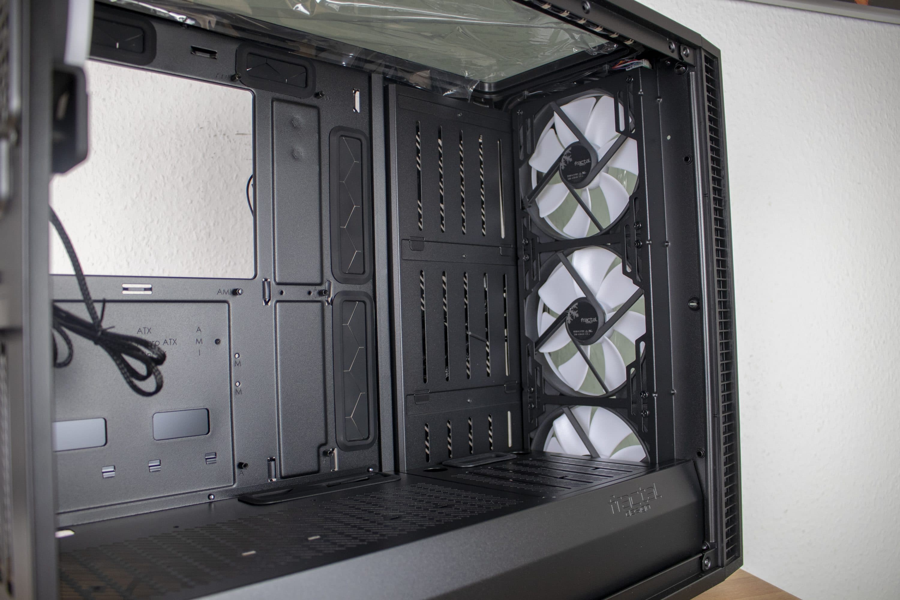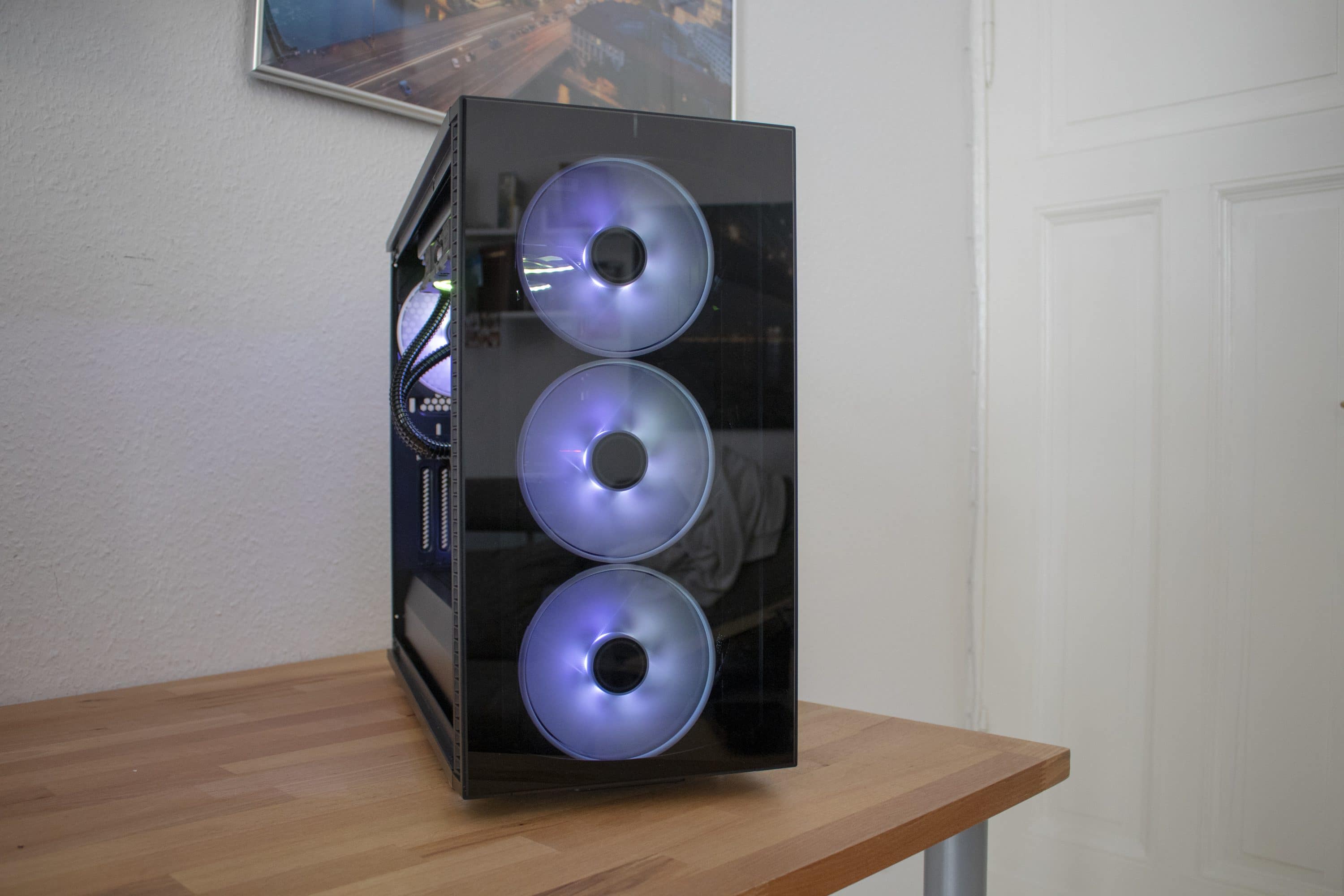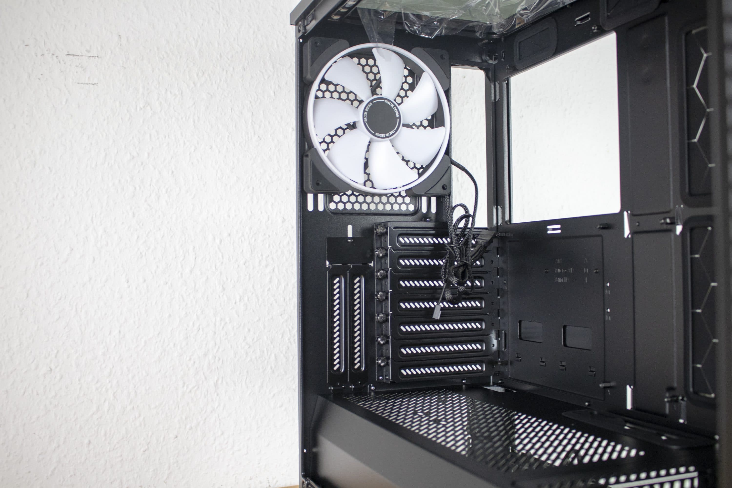 Man könnte natürlich denke, dass aufgrund der Glasflächen die Kühlung leidet, doch das ist glücklicherweise nicht der Fall. Fractal Design hat für einen ordentlichen Abstand der Frontlüfter zur Glasfläche gesorgt, wodurch diese durch die seitlichen Öffnungen genug Luft ziehen können.
