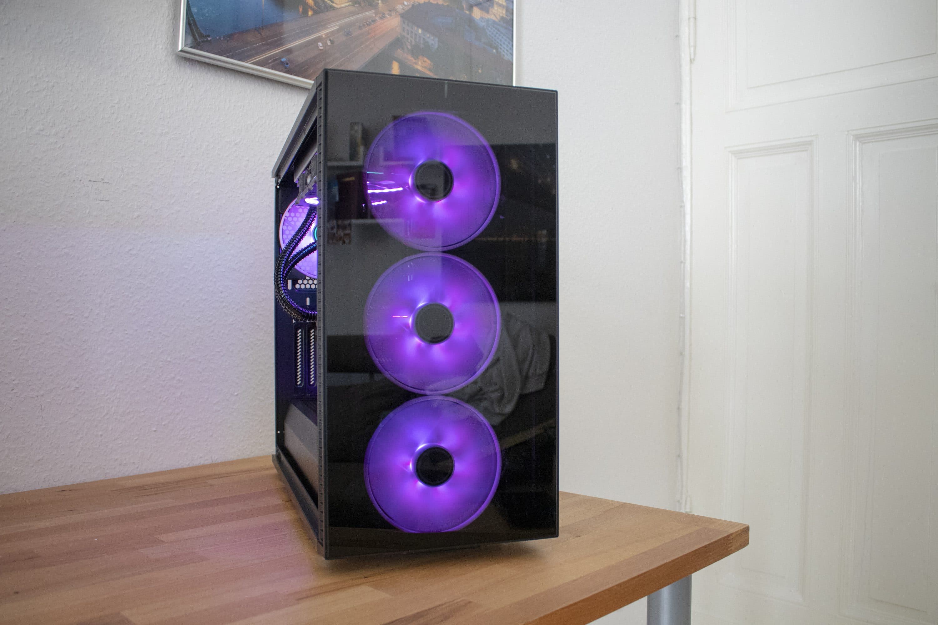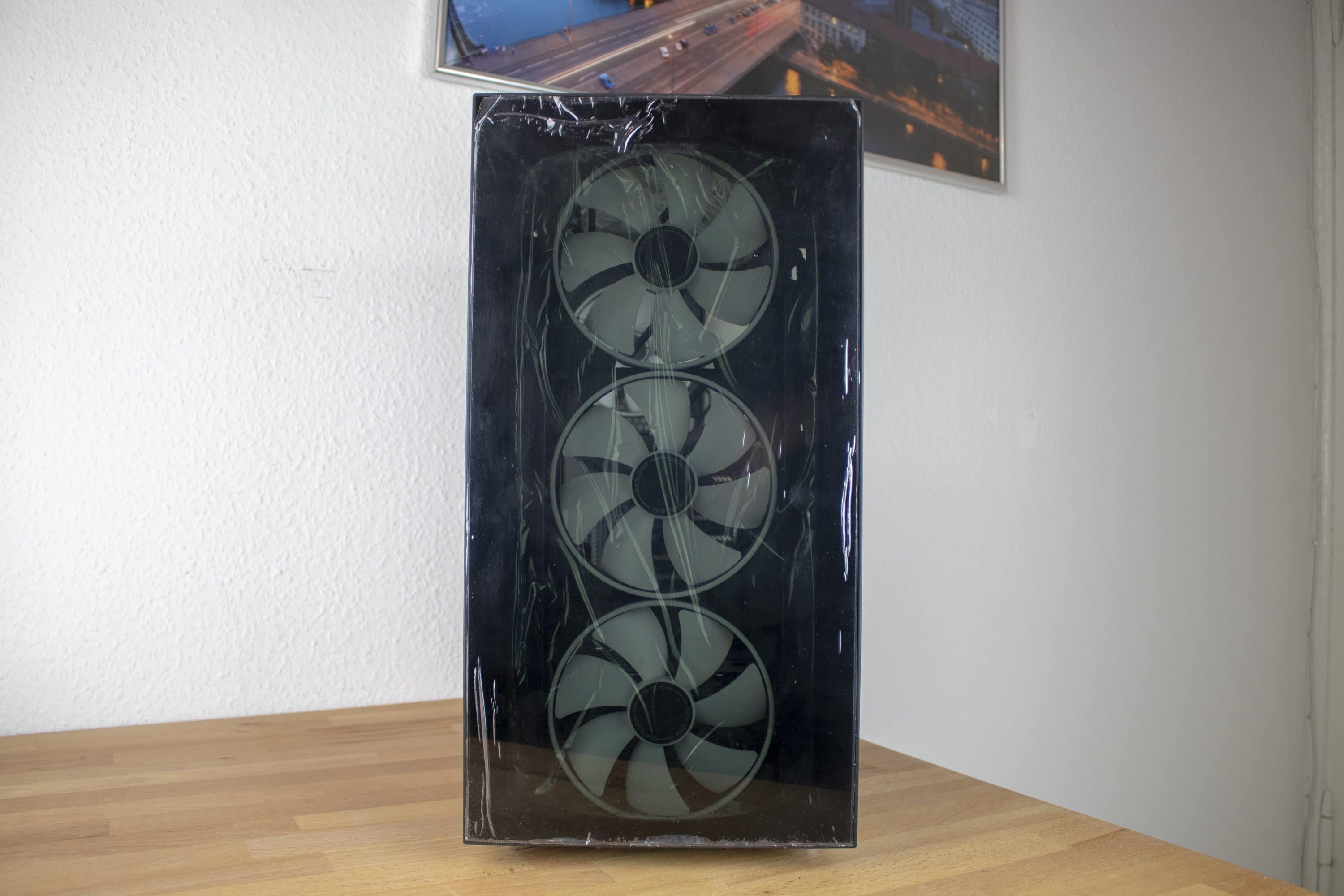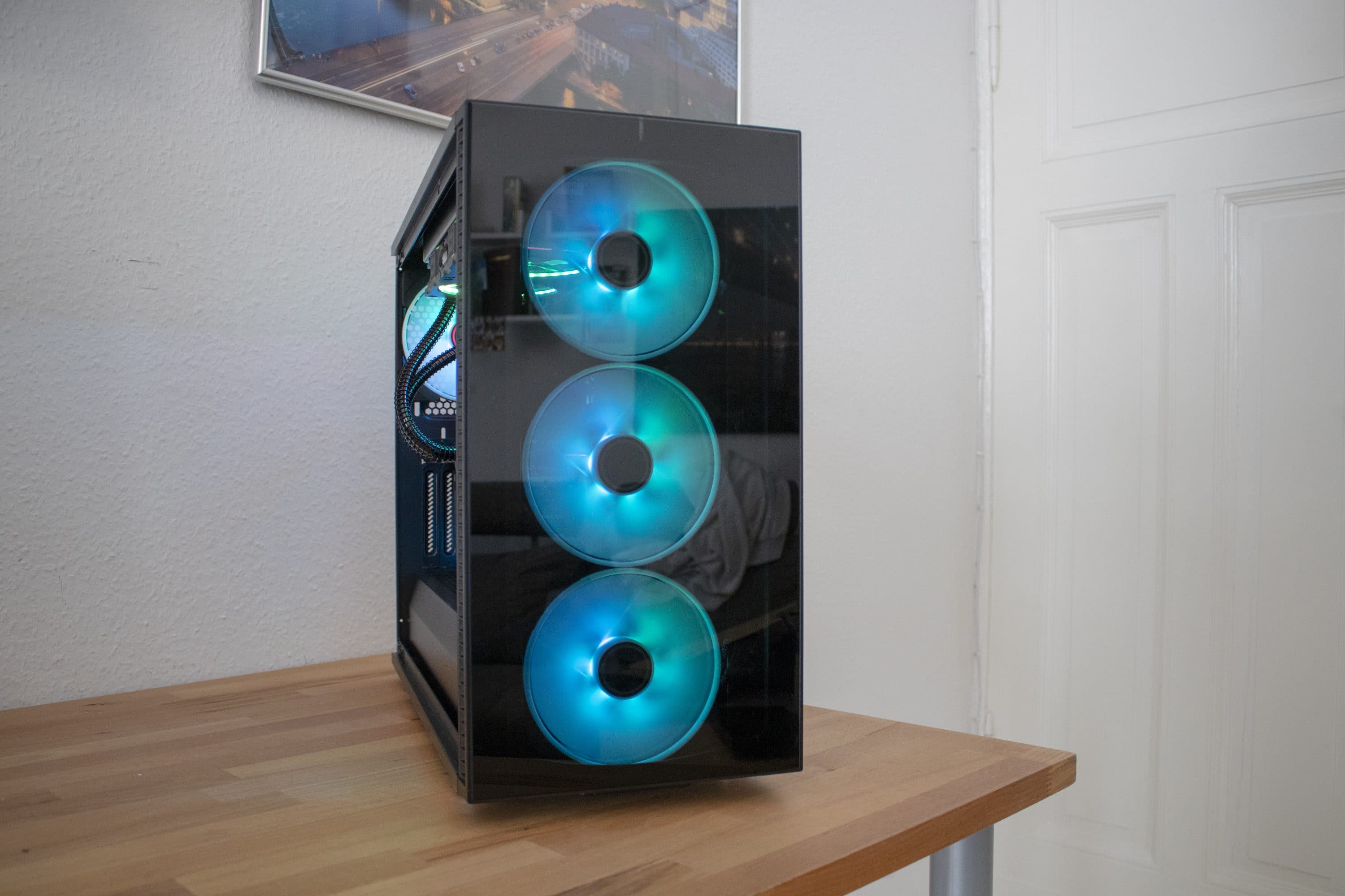 Man könnte natürlich denke, dass aufgrund der Glasflächen die Kühlung leidet, doch das ist glücklicherweise nicht der Fall. Fractal Design hat für einen ordentlichen Abstand der Frontlüfter zur Glasfläche gesorgt, wodurch diese durch die seitlichen Öffnungen genug Luft ziehen können.