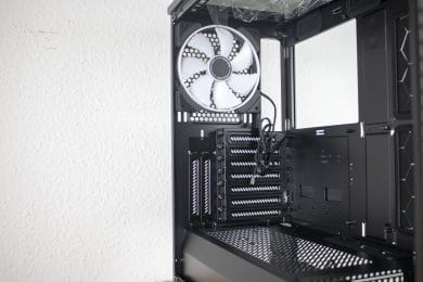 Die Kühlungsmöglichkeiten sind also sehr weitreichend, sodass auch leistungsstarke Hardwarekomponenten, die eine sehr ausgefeilte Kühlung erfordern, problemlos eingesetzt werden können. Dank mitgelieferter Halterung für eine Wasserpumpe stehen auch Custom-Wasserkühlungen nichts im Wege.
