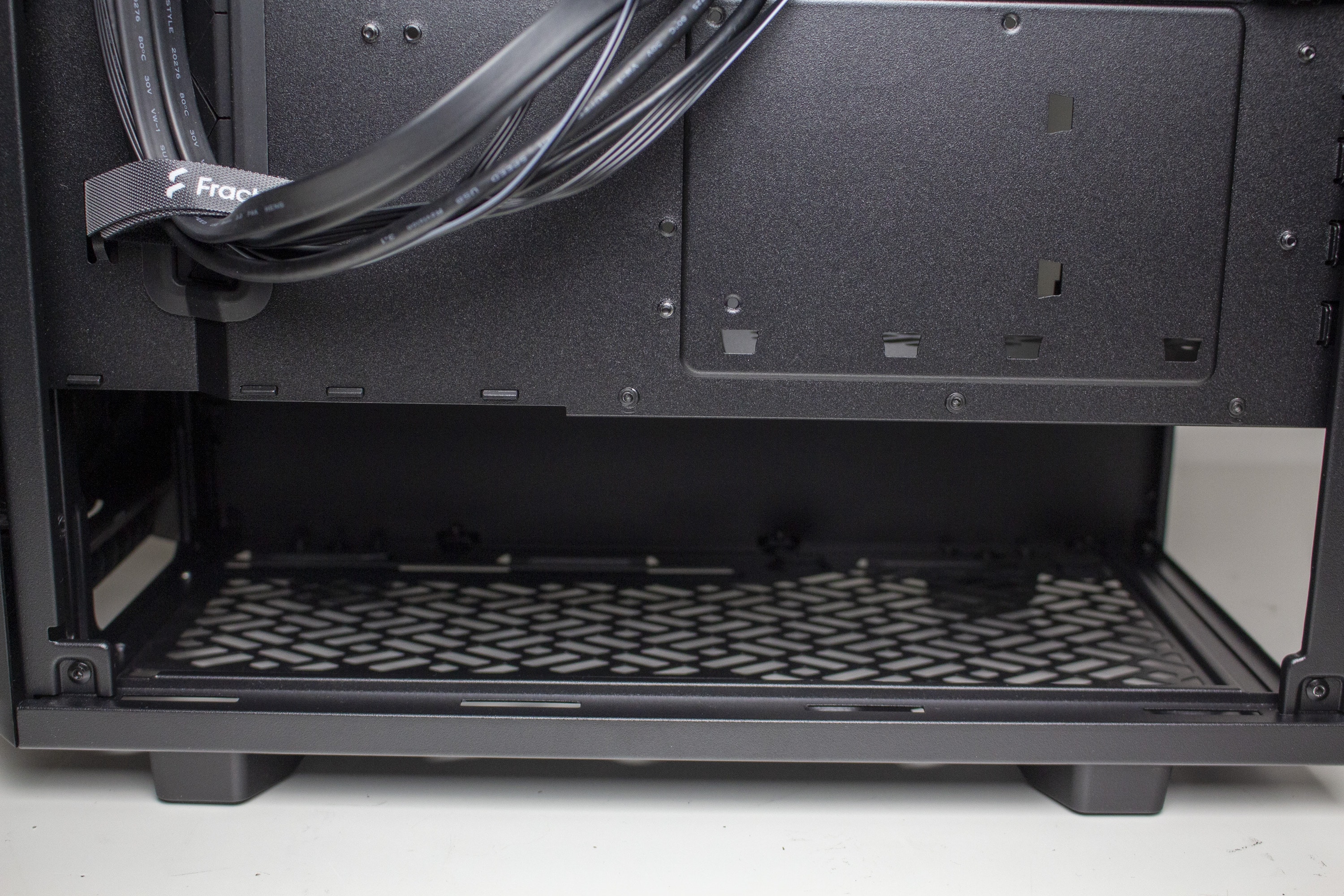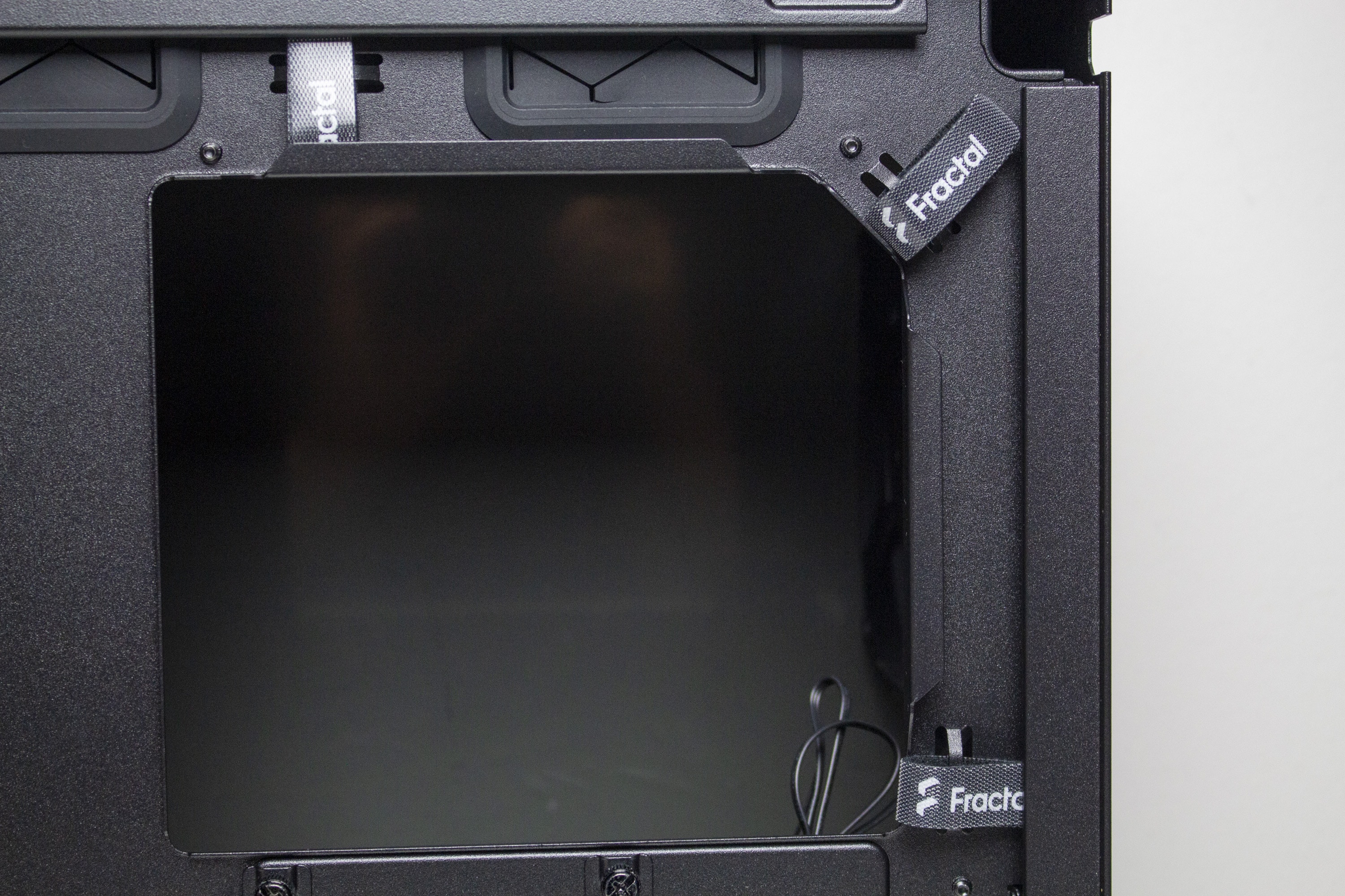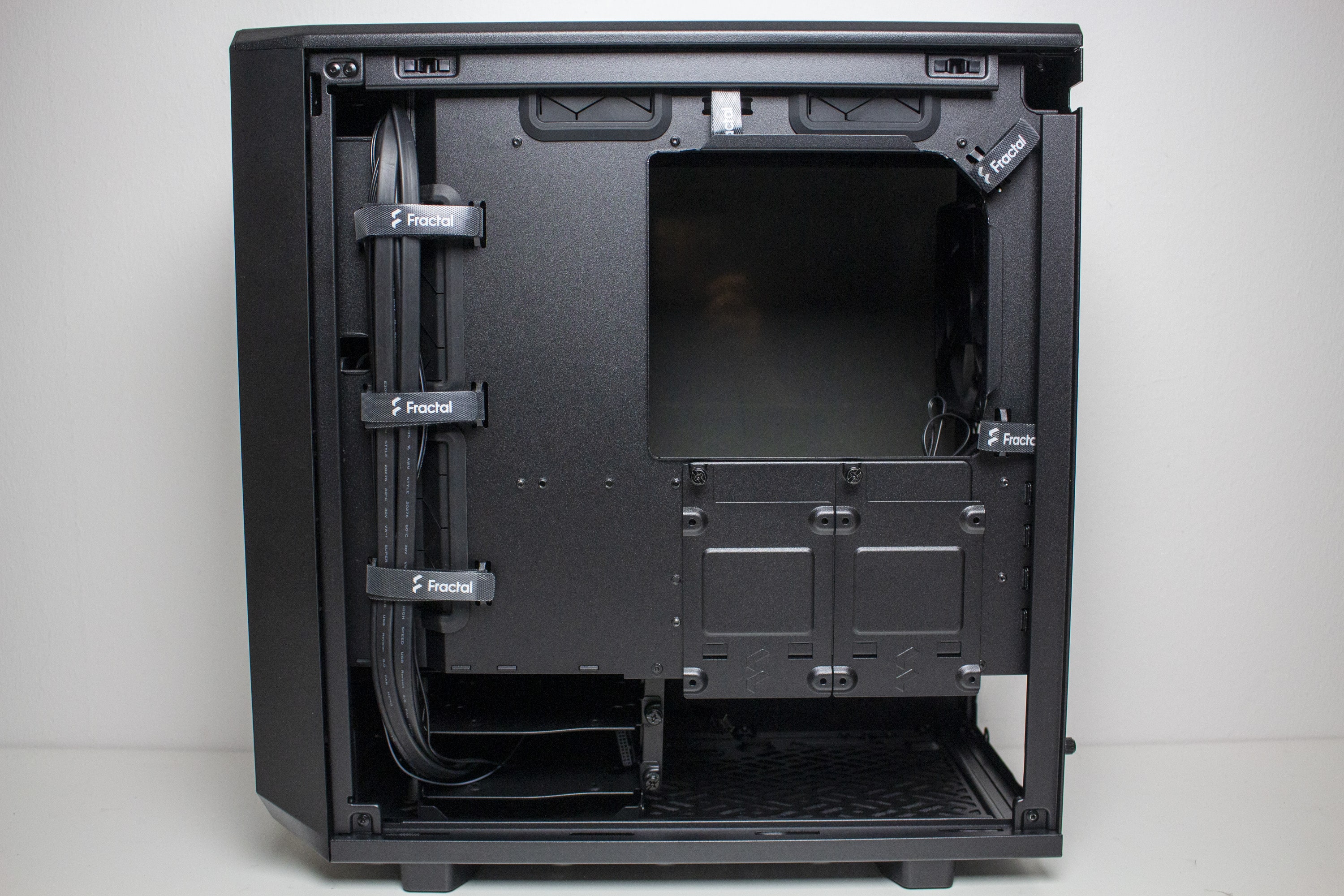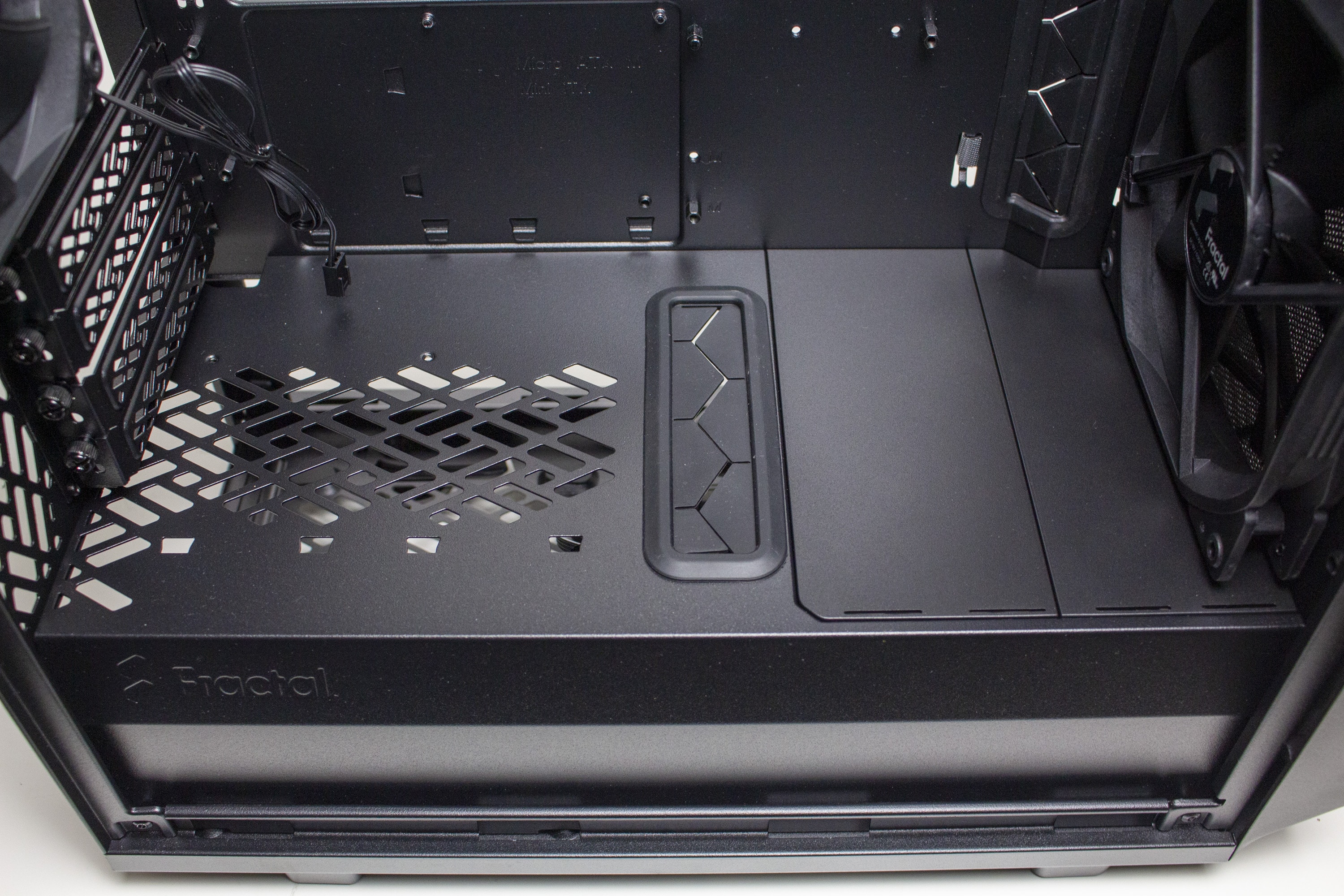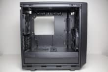 So finden wir hier auch eine große Hauptkammer mit Platz für µATX-Mainboards sowie eine kleinere Netzteilkammer vor. Das Mainboard-Tray ist, mit Ausnahme des Kabelkanals auf der rechten Seite, plan gestaltet und verfügt über vier gummierte Kabelmanagementöffnungen. Des Weiteren gibt es im vorderen Bereich keine HDD-Käfige, sodass der Frontlüfter ungehindert Luft ins Innere befördern kann. Auch den obligatorischen Ausschnitt für Backplates bringt Fractal Design hier wieder zum Einsatz.