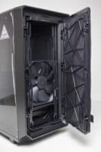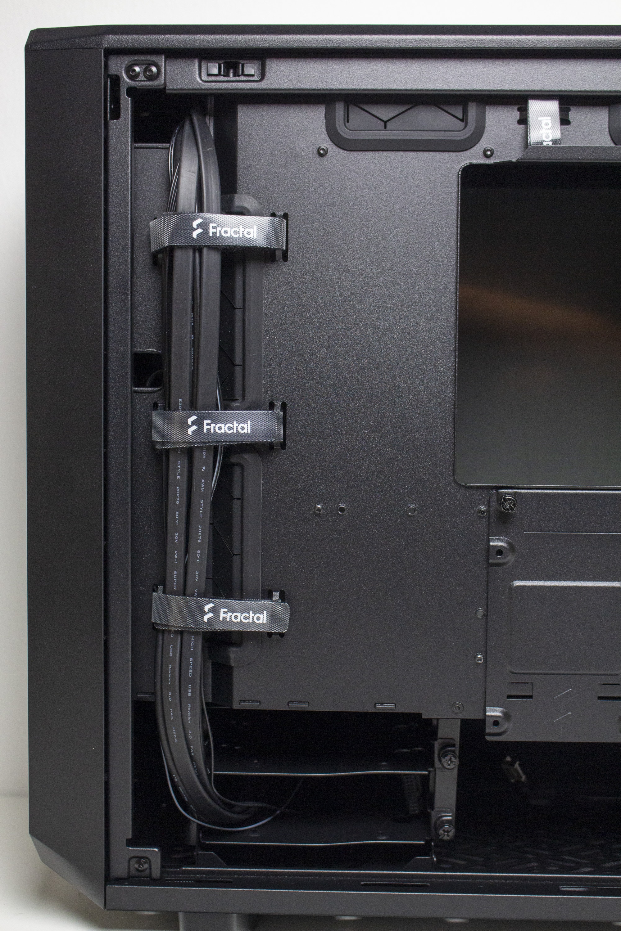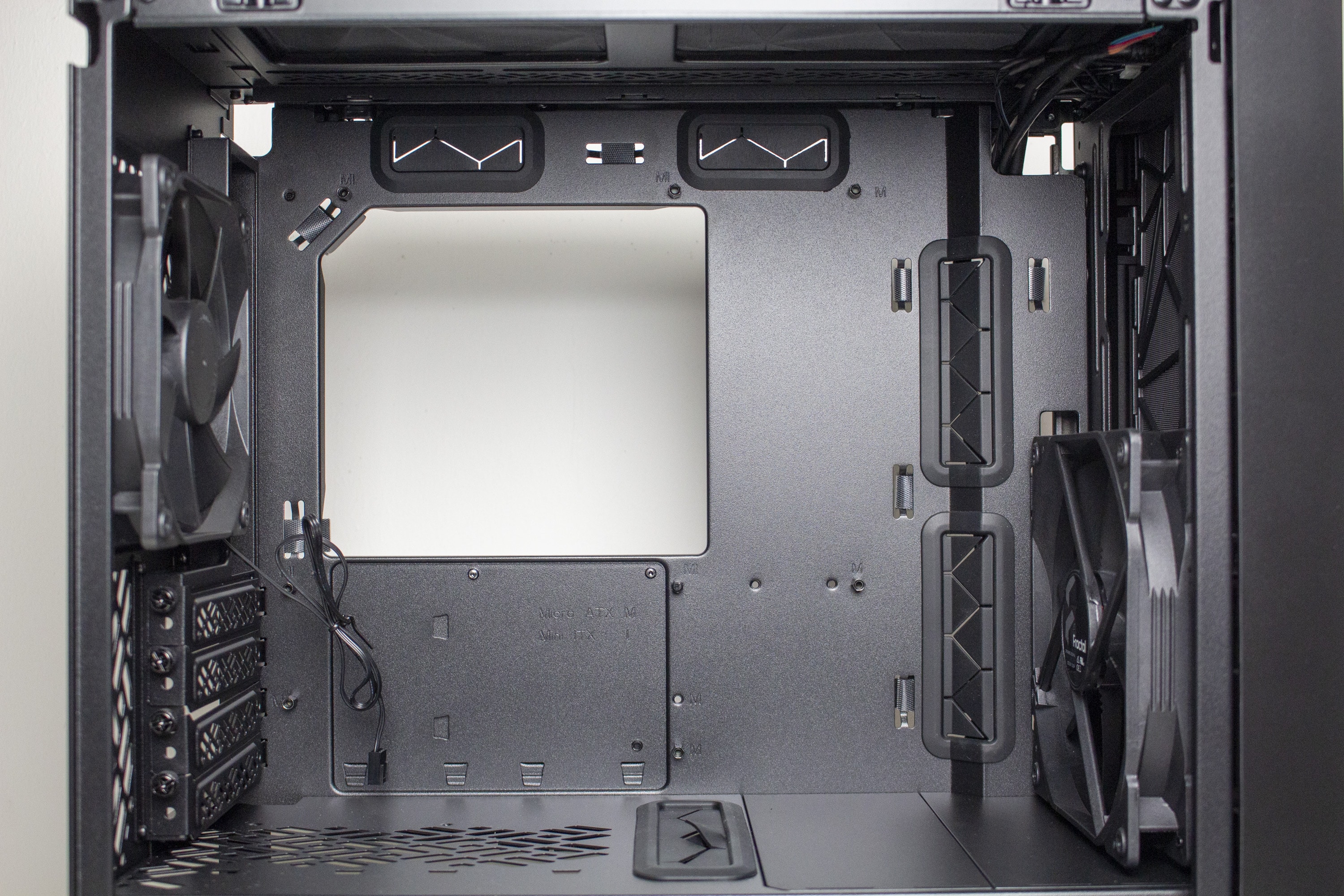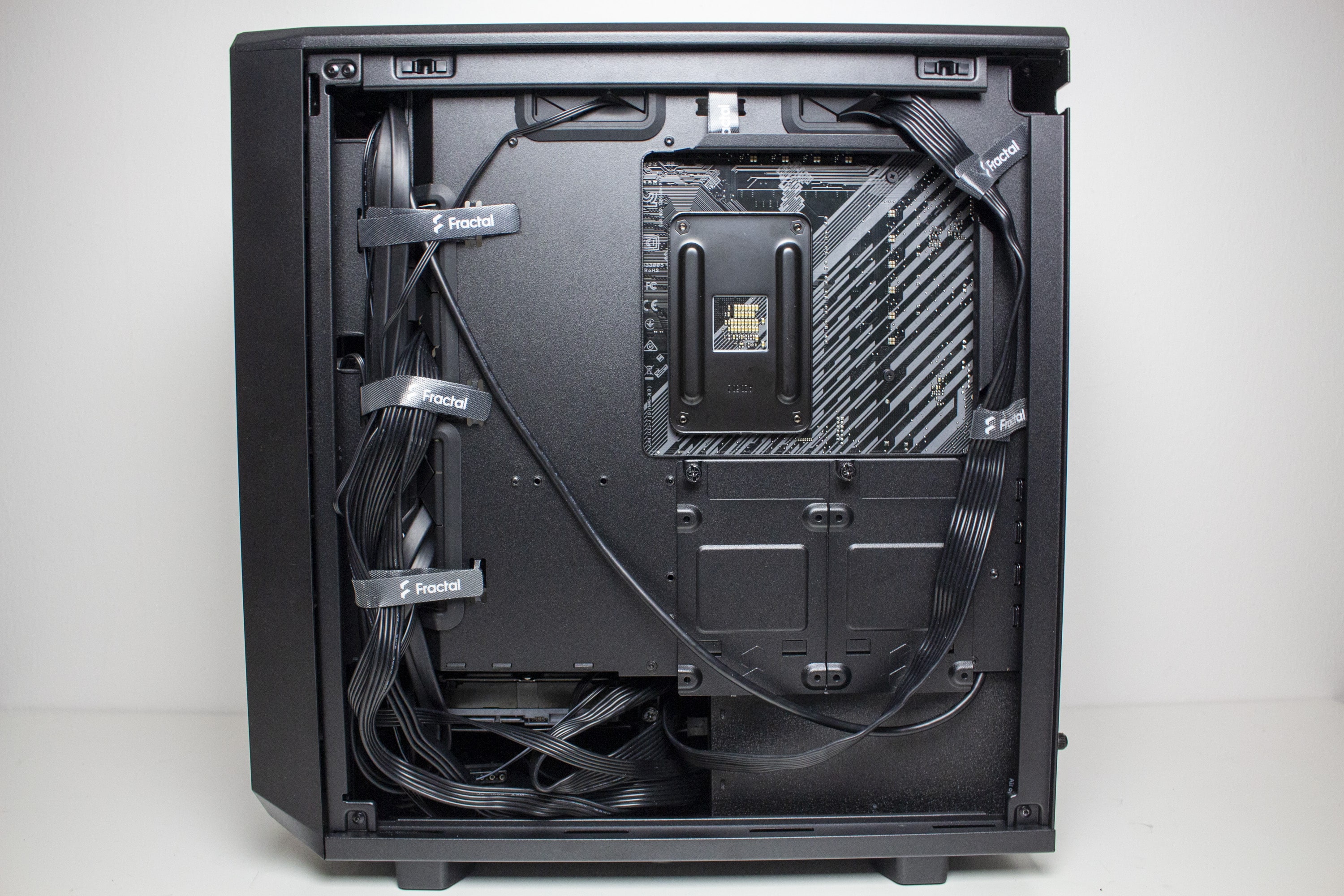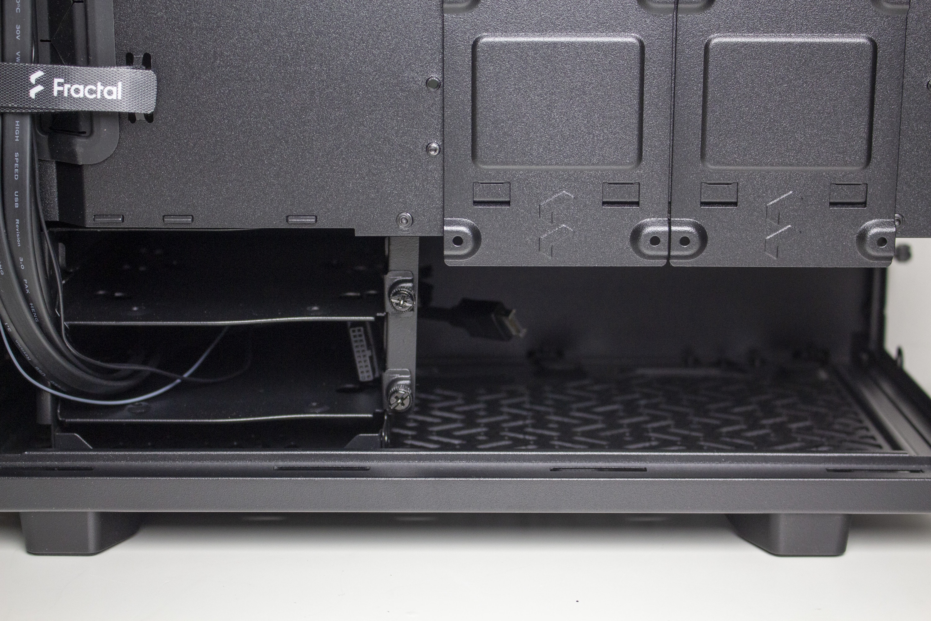So finden wir hier auch eine große Hauptkammer mit Platz für µATX-Mainboards sowie eine kleinere Netzteilkammer vor. Das Mainboard-Tray ist, mit Ausnahme des Kabelkanals auf der rechten Seite, plan gestaltet und verfügt über vier gummierte Kabelmanagementöffnungen. Des Weiteren gibt es im vorderen Bereich keine HDD-Käfige, sodass der Frontlüfter ungehindert Luft ins Innere befördern kann. Auch den obligatorischen Ausschnitt für Backplates bringt Fractal Design hier wieder zum Einsatz.