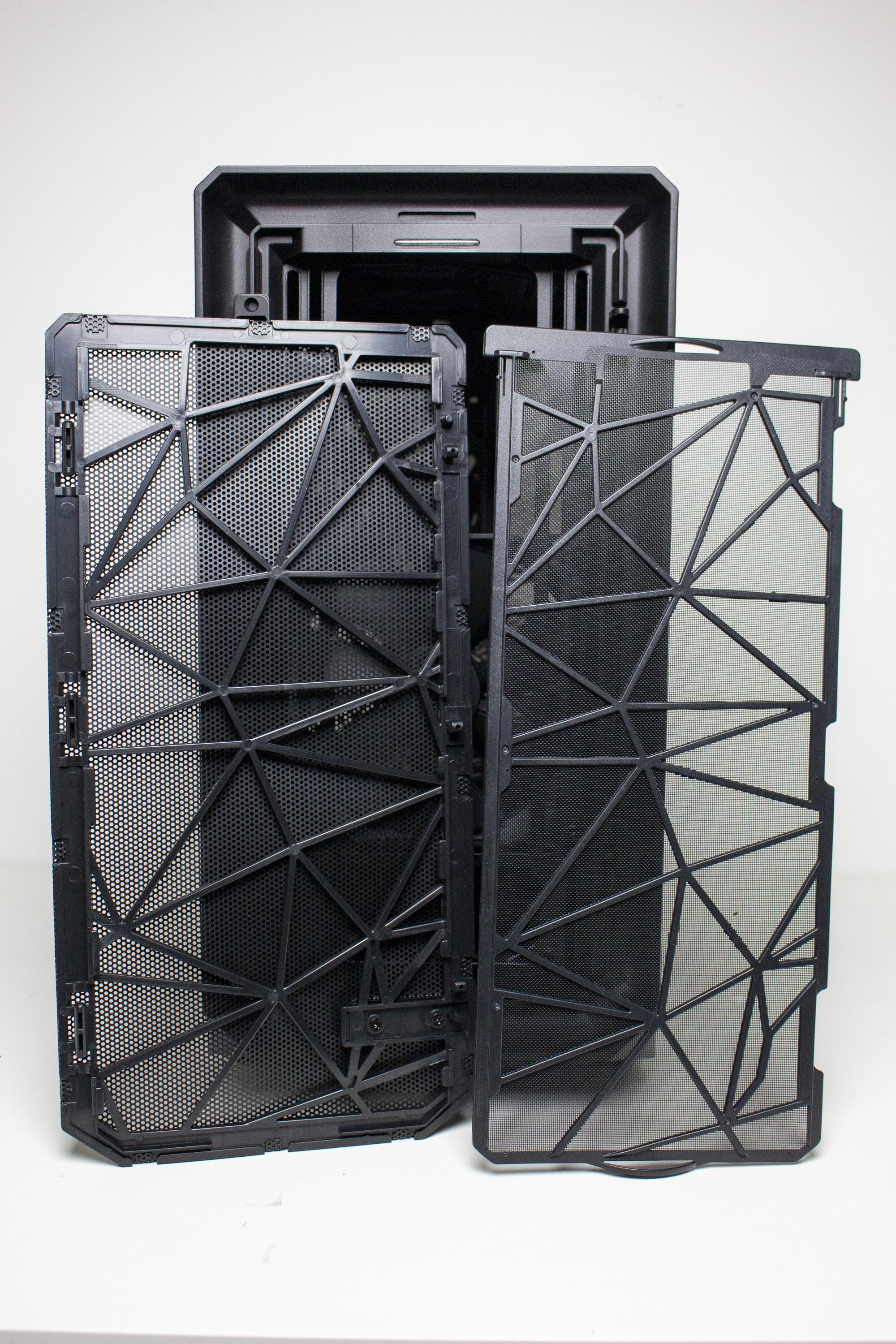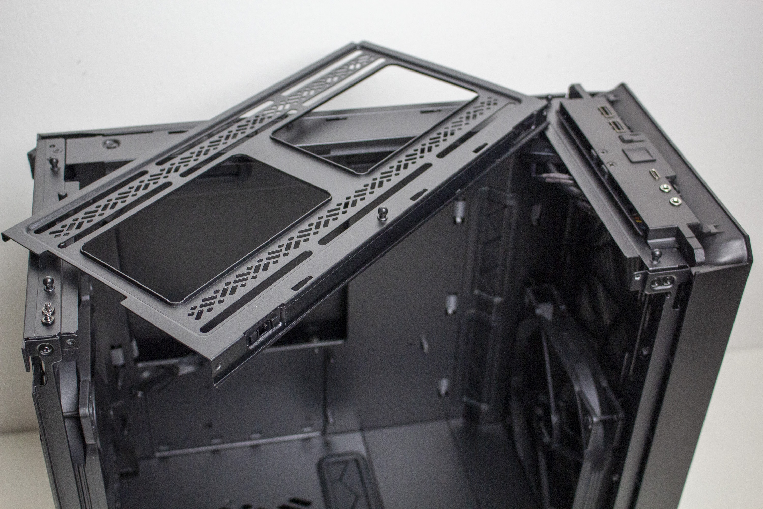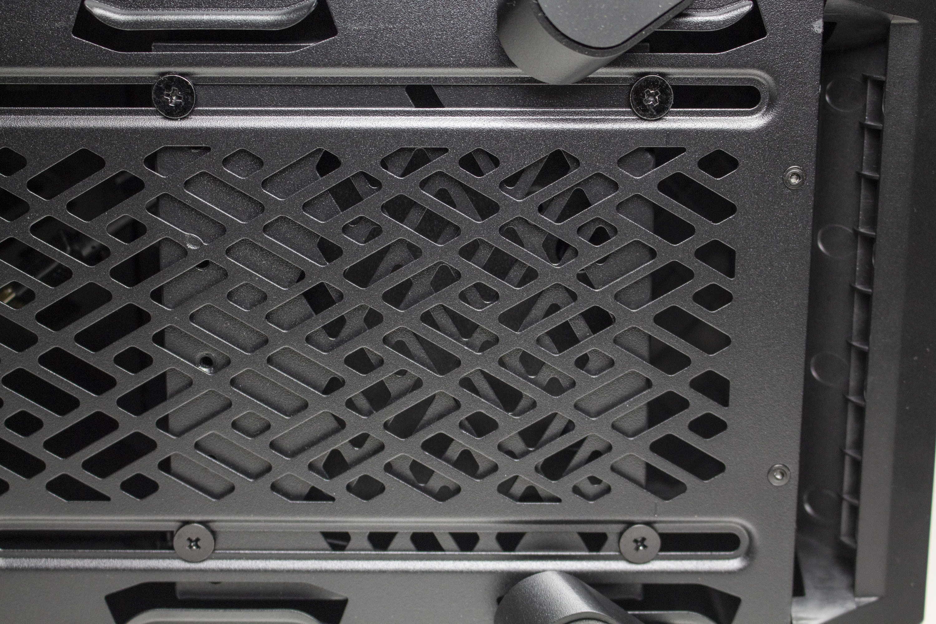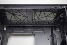 Wie es sich für ein Meshify-Gehäuse gehört, verfügt der Deckel natürlich ebenfalls über ein großes Meshgitter. Der restliche Teil der Deckelplatte besteht aus Stahl und kann bei Bedarf nach oben abgezogen werden. Die Arretierung erfolgt dabei über einen Push-Pin-Mechanismus. Ohne Deckel hat man freie Sicht auf den feinen Textilfilter sowie den Montagebereich für Lüfter oder Radiatoren. Zur Vereinfachung der Montage kann dieser Rahmen mittels zweier Schrauben auch komplett entfernt werden.