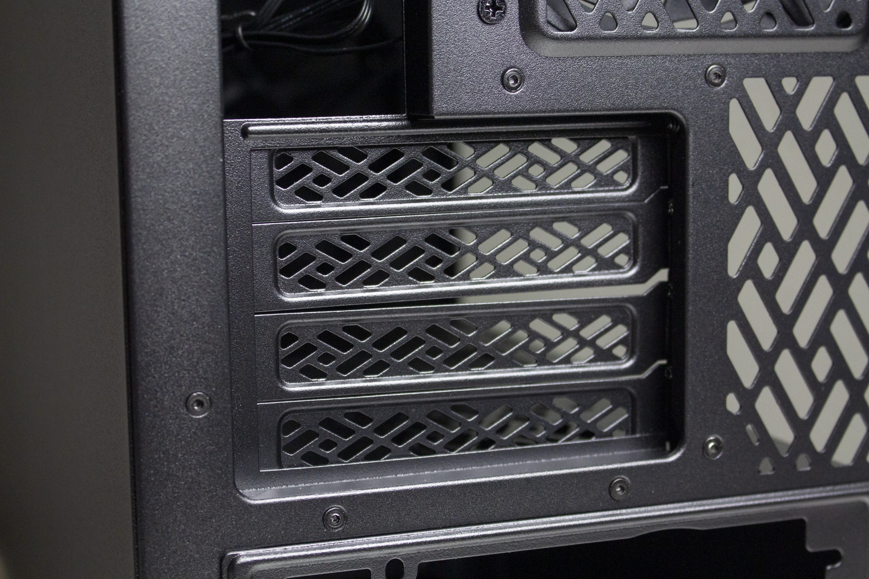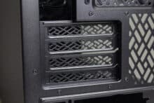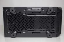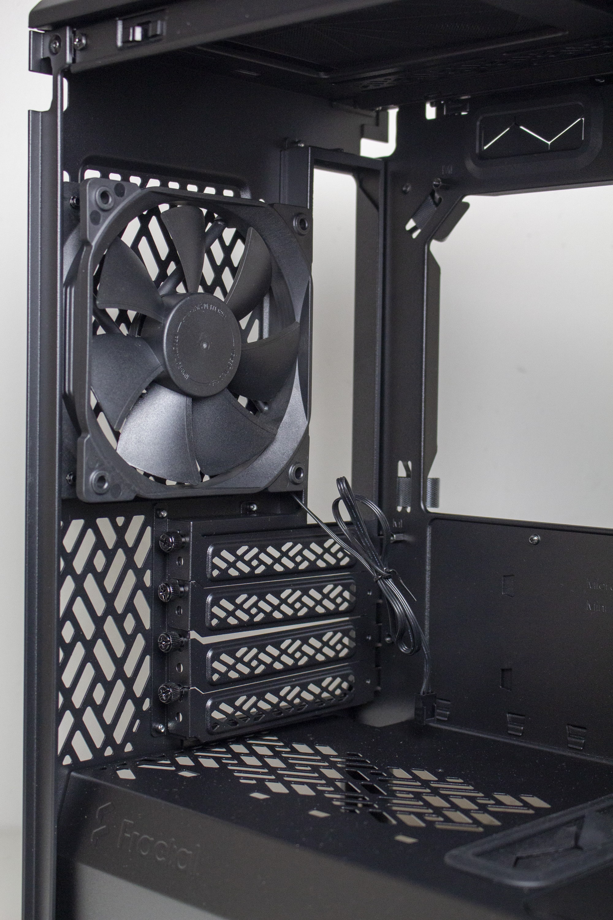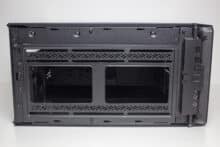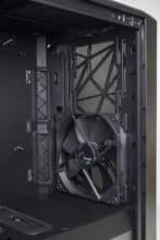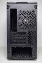 An der Rückseite des Meshify 2 Mini zeigt sich ein typisches Erscheinungsbild für einen aktuellen Mini-Tower. Das Netzteil wird unten platziert und über einem modularen Stahlrahmen von hinten in den Korpus geschoben. Darüber finden wir vier belüftete PCI-Slotblenden und rechts neben den Blenden eine weitere Belüftungsöffnung. Im oberen Bereich der Rückseite lässt sich zudem der zweite Gehäuselüfter mit einer Rahmenbreite von 120 Millimetern entdecken.