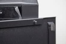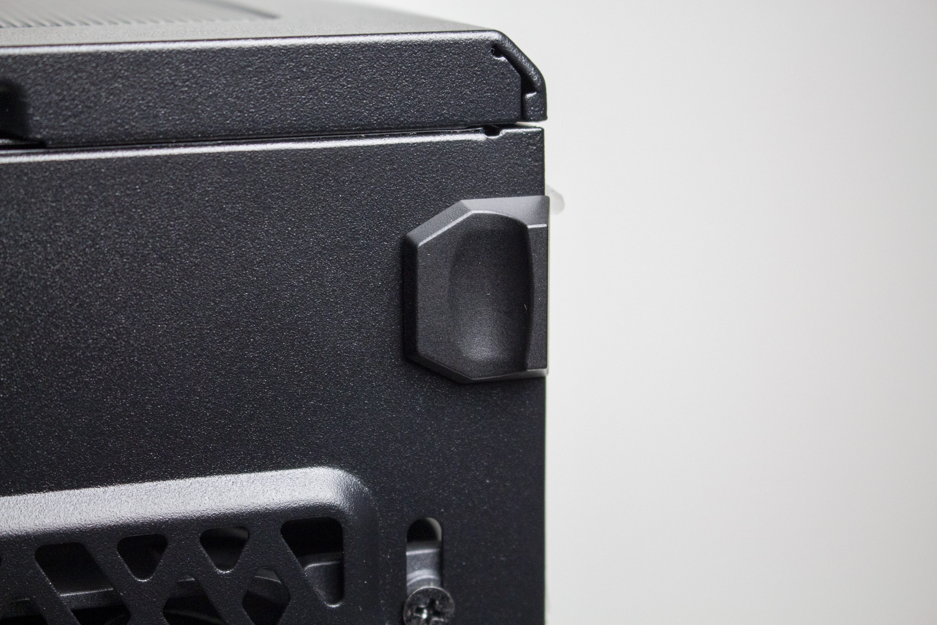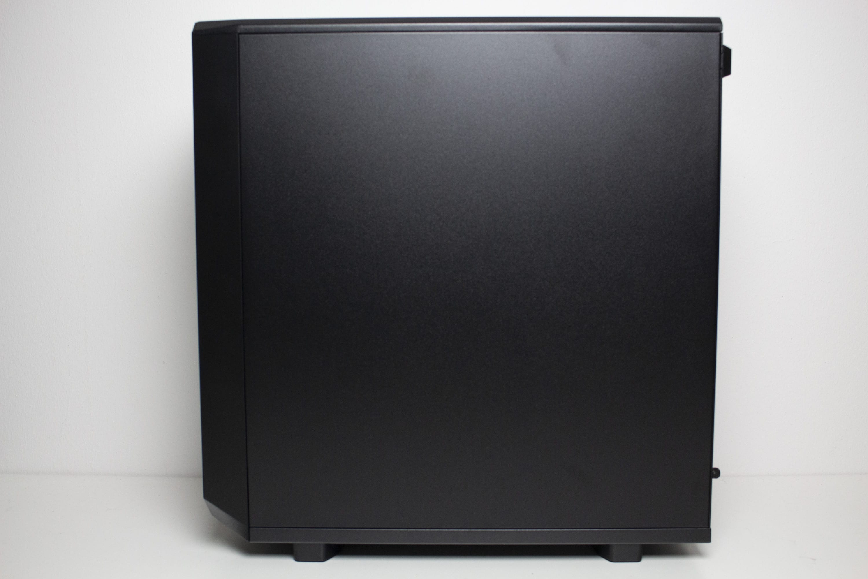 Das linke Seitenteil des Meshify 2 Mini besteht aus einem getönten Tempered Glass mit einer Stärke von 2,9 Millimetern. Auch hier erfolgt die Befestigung am Korpus über Push-Pins. Ein kleiner Griff an der oberen Rückseite ermöglicht dennoch eine problemlose Demontage. Über eine Schraube an der Vorderseite kann das Panel für den Transport zusätzlich gesichert werden. Das rechte Seitenteil besteht aus einem 0,8 Millimetern dicken Stahl und besitzt ebenfalls Push-Pins sowie den Griff an der Rückseite.