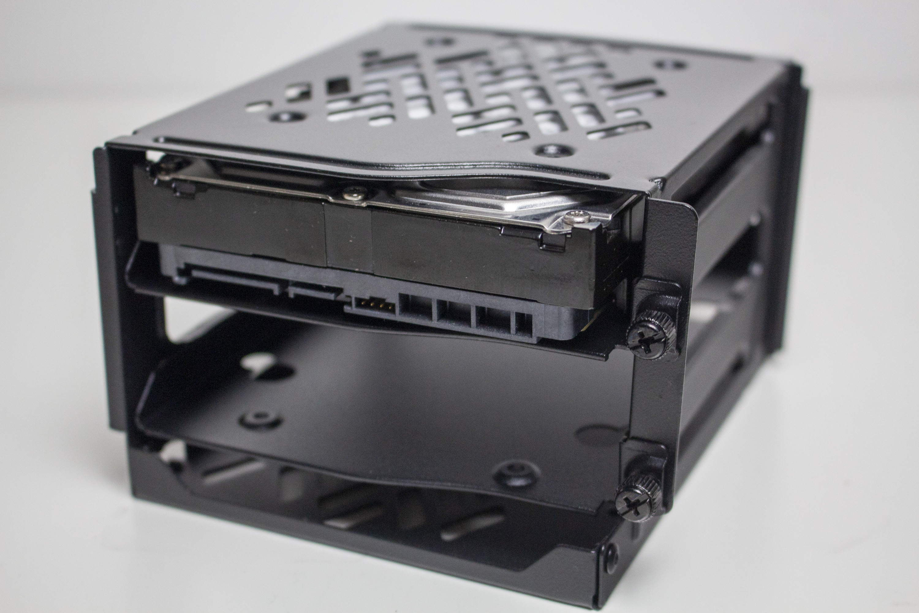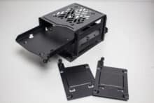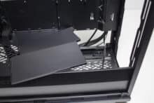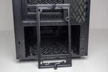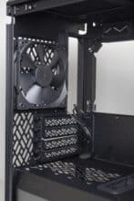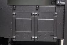 Wie beim Define 7 Mini können auch im Meshify 2 Mini bis zu vier Datenträger montiert werden. Dazu finden wir an der Rückseite des Mainboard-Trays zwei 2,5″-Rahmen für SSDs. Weiterhin bietet der HDD-Käfig über größere Rahmen Platz für zwei 3,5″- oder zwei 2,5″-SSDs. In allen Fällen ist Werkzeug notwendig und nur die 3,5″-Datenträger werden entkoppelt. Optional bietet die Oberseite der Netzteilblende zwei weitere Montagepunkte für 2,5″-SSDs. Entsprechende Rahmen müssen aber zusätzlich erworben oder von der Rückseite nach vorne verfrachtet werden.