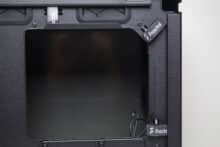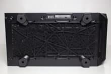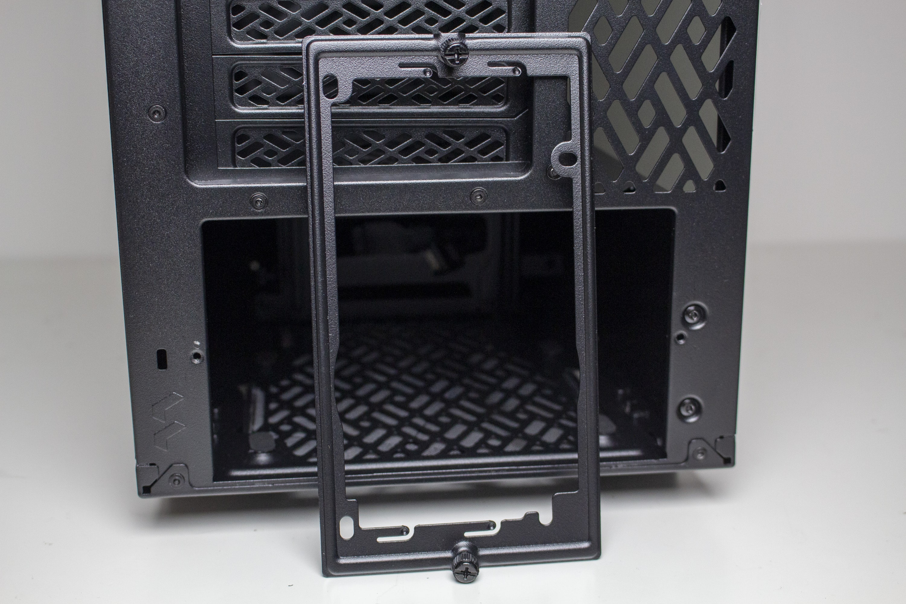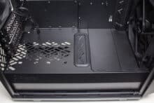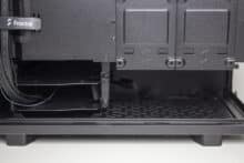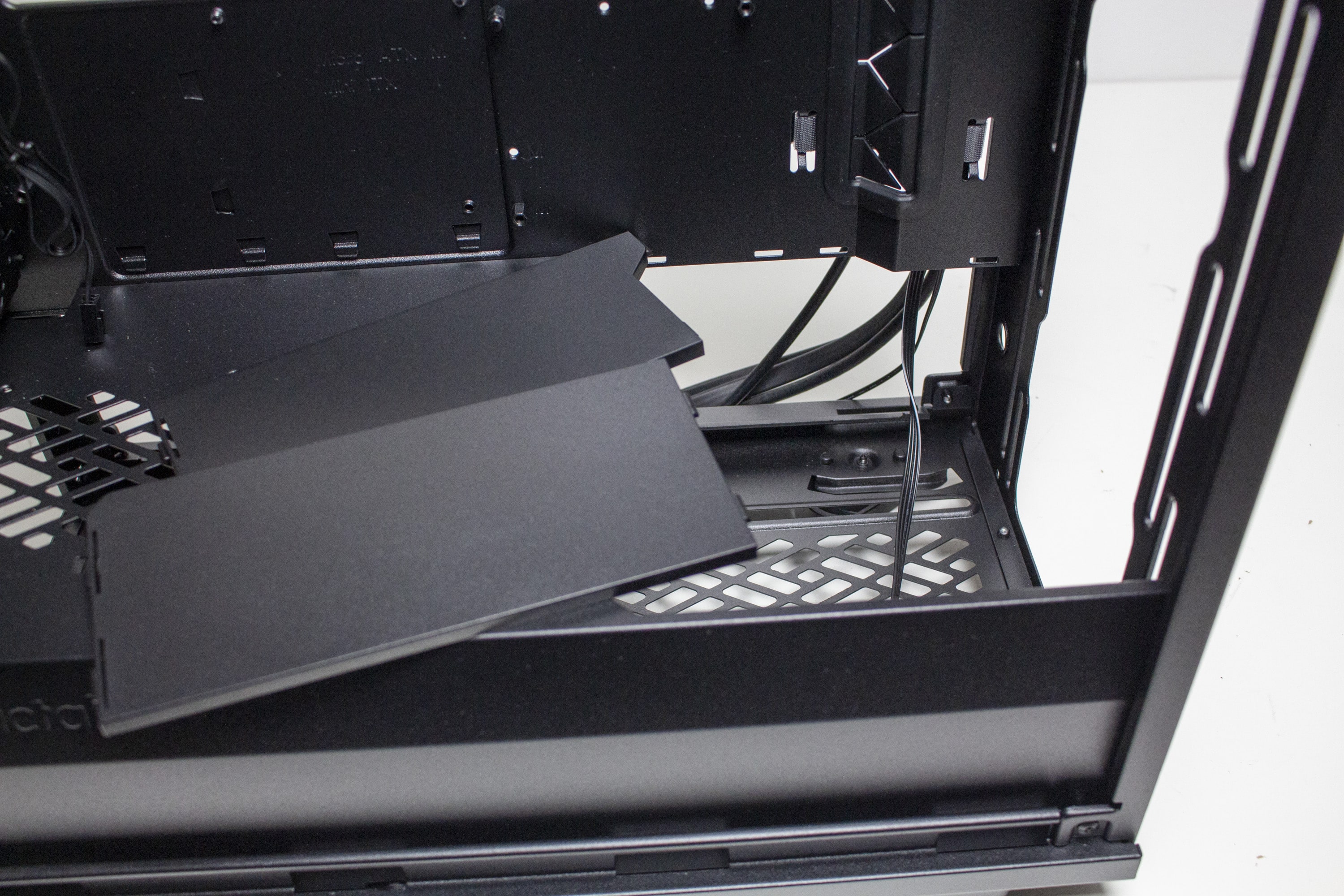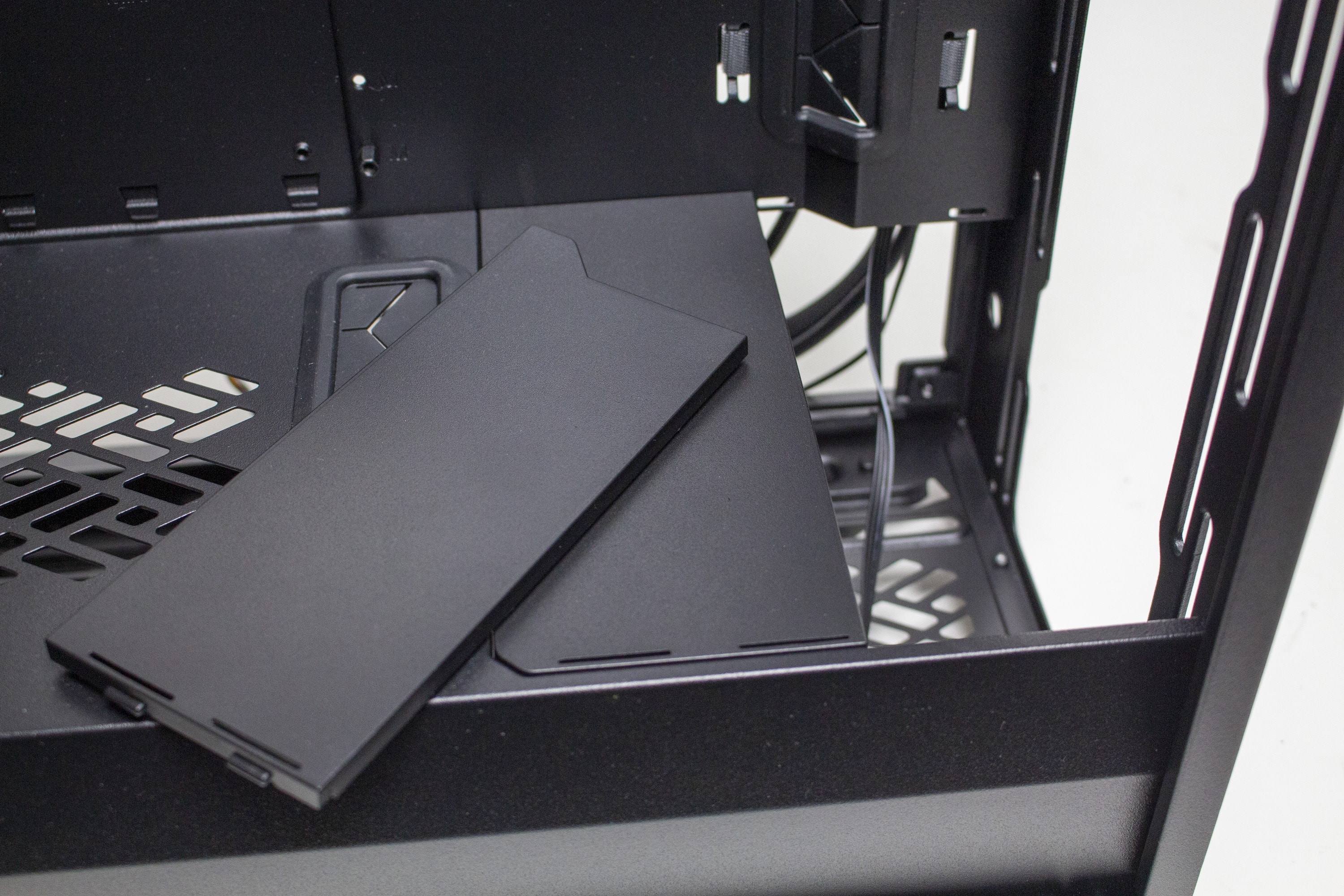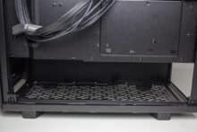 Die Netzteilkammer im unteren Bereich wird durch eine Stahlblende von der Hauptkammer abgetrennt. Neben einem eingestanzten Herstellerlogo verfügt die Blende über zwei weitere Kabelmanagementöffnungen, eine davon mit Gummimanschette, und weitere Belüftungsöffnungen. Letztere erlauben eine Orientierung des Netzteils mit dem Lüfter nach oben. Der vordere Bereich der Blende besteht nicht aus Stahl, verfügt dafür aber über zwei modulare Kunststoffplatten, die entfernt werden können. Das ist zum Beispiel nötig, wenn in der Front ein Radiator befestigt werden soll.