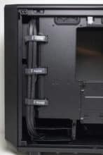 An der Rückseite des Mainboards-Trays verzichtet der Hersteller vollständig auf Ösen für Kabelbinder. Dafür kommen aber sechs Klettkabelbinder zum Einsatz. Diese sind wiederverwendbar und schonen somit Umwelt und die Nerven, falls man doch mal einen Kabelstrang vergessen haben sollte. Auf der linken Seite finden wir zudem eine Vertiefung, welche als Kabelkanal für das 24-Pin-ATX- und die I/O-Panel-Kabel dienen soll.