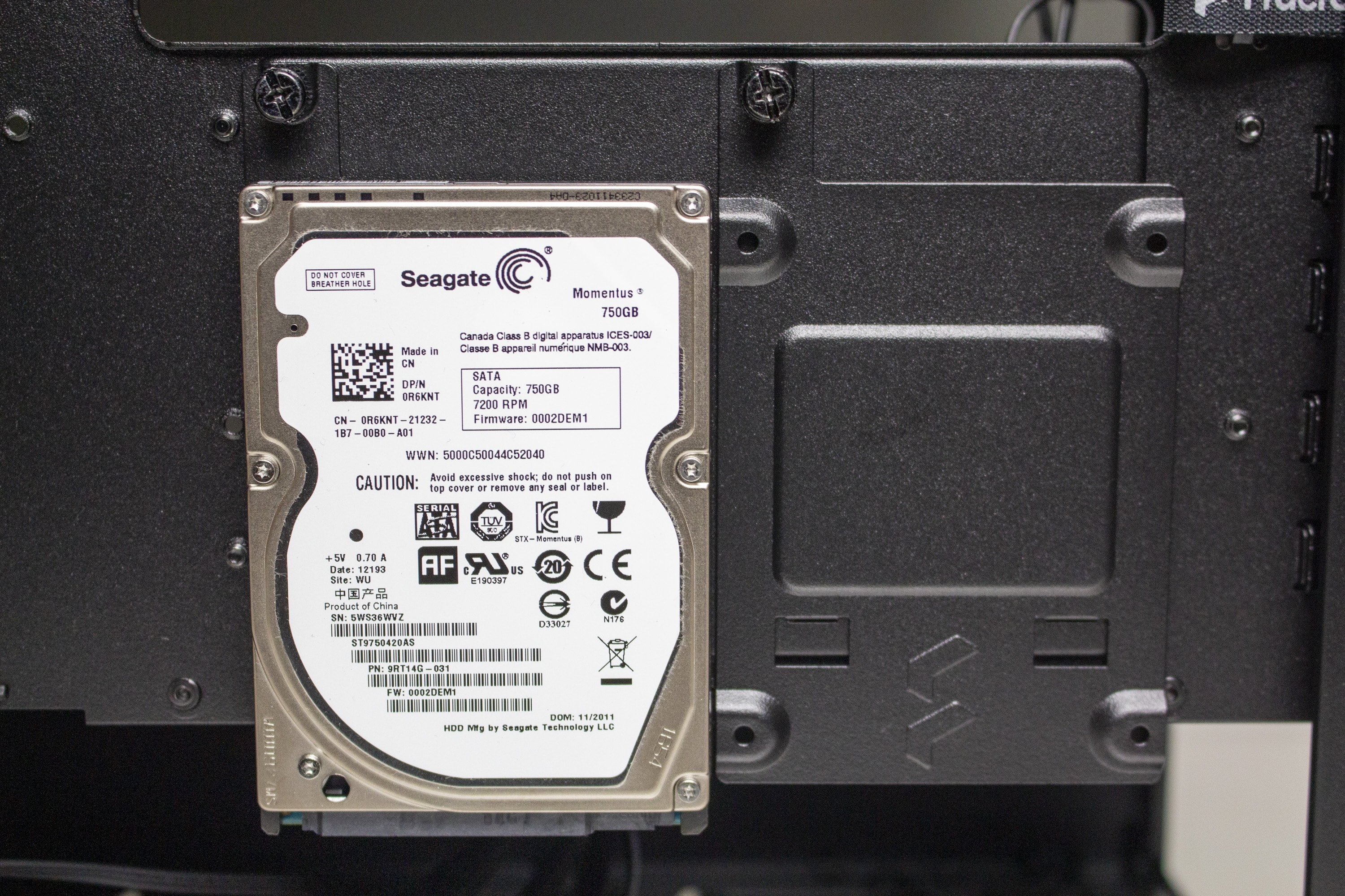 Unterhalb der Abdeckung im Netzteiltunnel finden wir logischerweise den Montageplatz für das Netzteil. Die Montage des Netzteils erfolgt jedoch von der Rückseite über den modularen Montagerahmen. Zusätzlich stattet der Hersteller die Auflageflächen mit kleinen Gummielementen aus, um einen Entkopplungseffekt zu erzielen. Weiterhin kann man einen modularen HDD-Käfig aus Stahl erkennen, in dem zwei Stahlrahmen befestigt wurden.