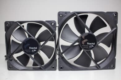 Ab Werk kommen auch beim Fractal Design Meshify 2 Mini zwei vorinstallierten Gehäuselüfter vom Typ Fractal Design Dynamic X2 zum Einsatz. An der Front wurde ein Exemplar mit 140 Millimeter Rahmenbreite (Dynamic X2 GP-14) und am Heck die Version mit 120 Millimeter Rahmenbreite (Dynamic X2 GP-12) platziert. Beide Ventilatoren sind komplett schwarz gehalten und drehen mit maximal 1000 (Dynamic X2 GP-14) respektive 1200 (Dynamic X2 GP-12) Umdrehungen pro Minute. Der Anschluss erfolgt über ein herkömmliches 3-Pin-Kabel. Der Einsatz vom PWM-Varianten wäre bei dem Preis des Gehäuses wünschenswert gewesen.