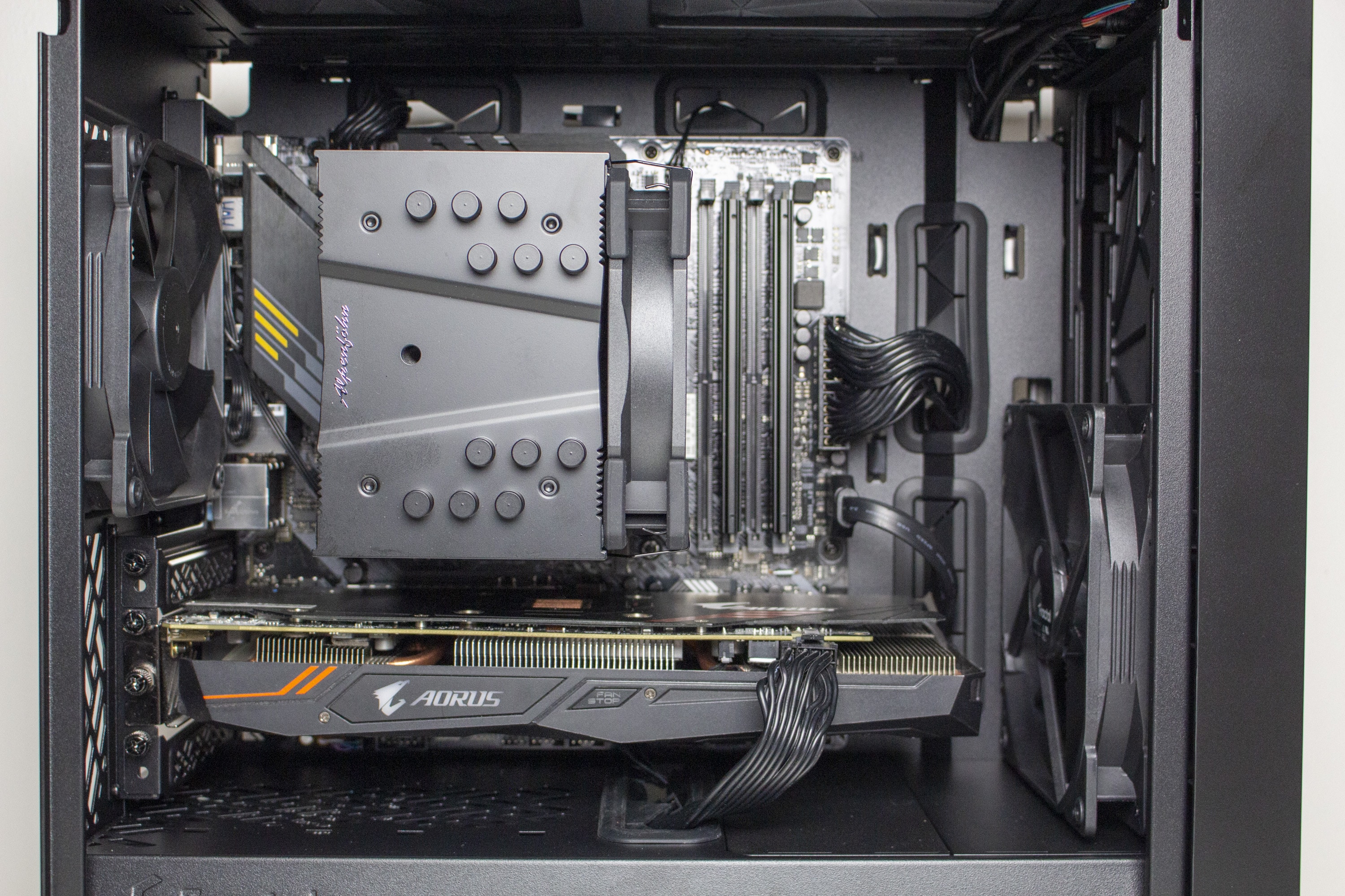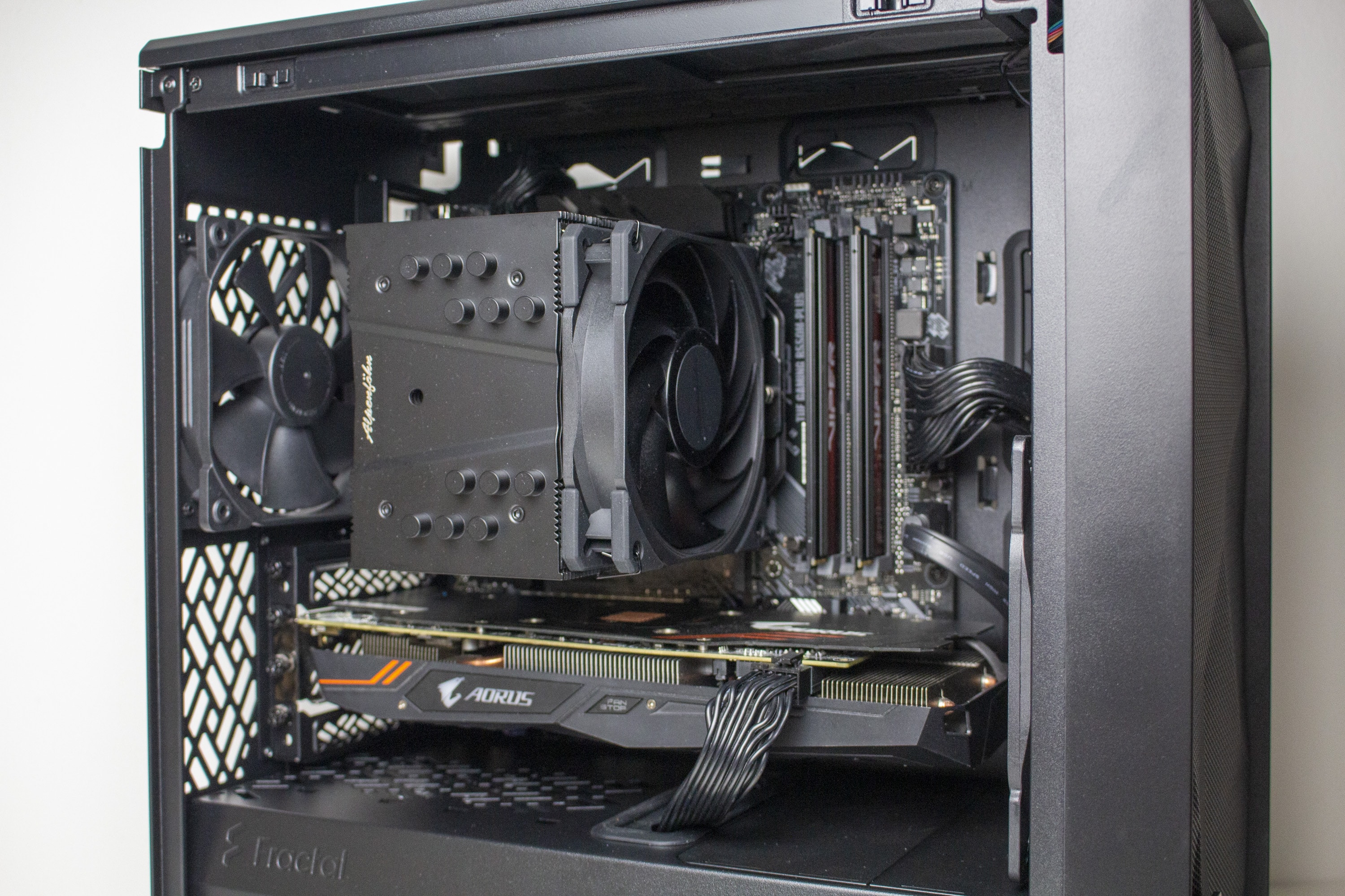Nun kommen wir zum Systemeinbau beim Fractal Design Meshify 2 Mini Test. Als Hardware verwenden wir einen AMD Ryzen 5 1400 auf einem ASUS TUF Gaming B550M-Plus* mit 16GB Crucial Ballistix Sport LT grau DDR4-2666. Der Ryzen wird von einem Alpenföhn Brocken 4*gekühlt und ist auf 3,8 GHz (1,175 V) übertaktet. Für die Bildausgabe ist eine GTX 1060 6GB von Gigabyte AORUS zuständig. Die Stromversorgung erledigt das vollmodulare LC-Power LC550 V2.31 Platinum.