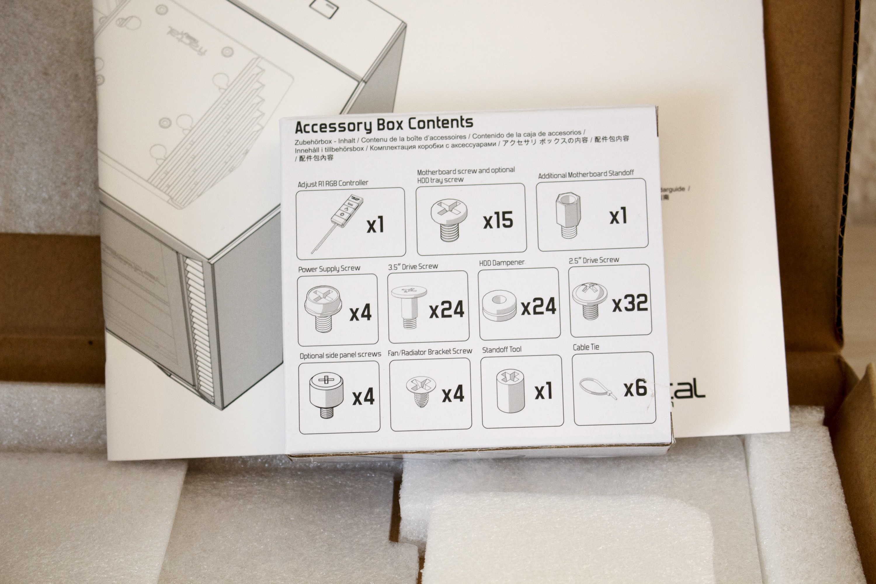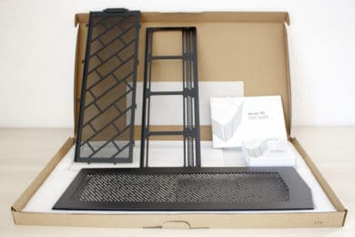 Das Fractal Design Vector RS kommt gut und sicher verpackt in einem braunen Karton mit schwarzer Schrift und ist von normalem Styropor und einer Kunststofffolie umhüllt. Das mitgelieferte Zubehör kommt in einem separaten und großen braunen Karton, der sich mit im Gehäusekarton befindet. Die Zubehör-Box beinhaltet eine weitere Box mit allen wichtigen Schrauben, dem RGB-Controller, Kabelbindern und einem Mikrofasertuch, eine sehr ausführliche Bedienungsanleitung und ein Airflow-Top-Cover inklusive Lüfterrahmen und Gewebe-Staubfilter. Alle Schrauben sind in ihrer Anzahl angeben und direkt auf dem Karton mit dem jeweiligen Verwendungszweck versehen. Mitgeliefert, aber bereits verbaut, werden außerdem drei Gehäuselüfter mit einer Rahmenbreite von 140 Millimetern, sechs Festplattenschlitten für 2,5/3,5″-HDDs, zwei Rahmen für 2,5″-SSDs und eine PWM-Lüftersteuerung für bis zu neun Lüfter.