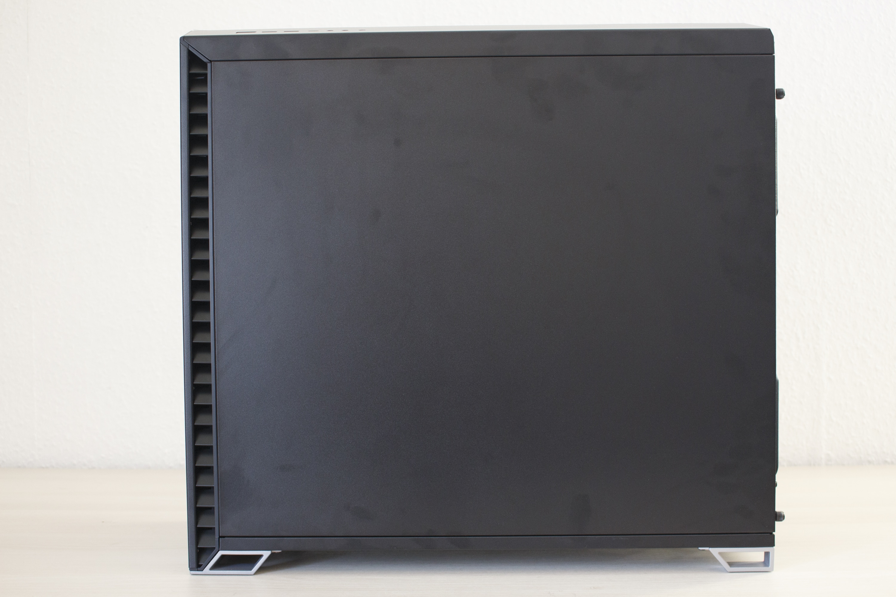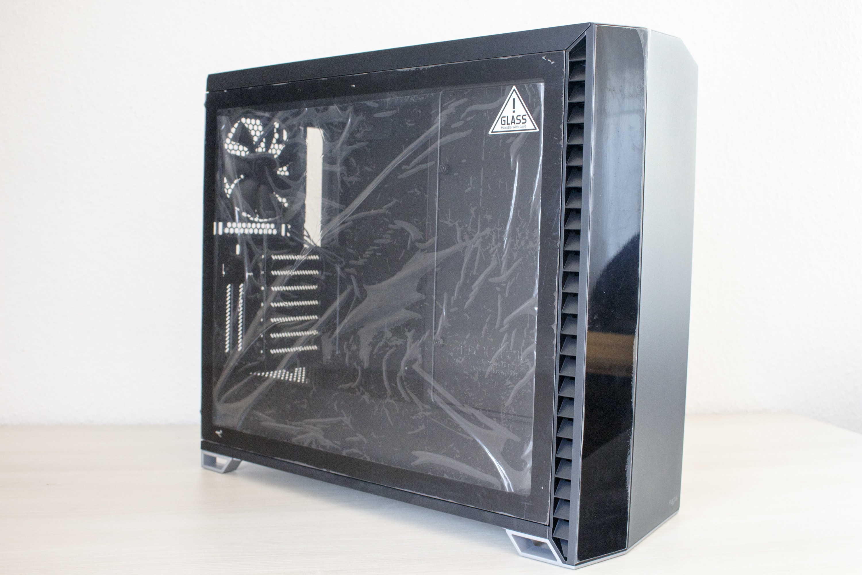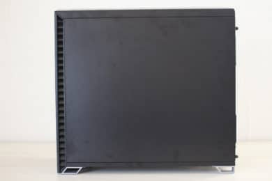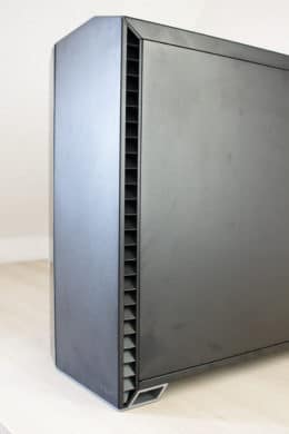 Packt das man das Vector RS aus seinem Karton, dürfte man vor allem erstmal von den wuchtigen Abmessungen und dem soliden Gewicht von fast 13 Kilogramm beeindruckt sein. Allerdings sieht man direkt bei der Betrachtung der Front, dass Fractal Design diesmal eine andere Optik als bei den typischen Define-Gehäusen im Kopf hatte. Das Frontelement ist zweigeteilt. Das linke Drittel besteht aus einem vollständig geschwärzten Glaselement, welches mit einer Schutzfolie beklebt wurde. Die anderen zwei Drittel der Frontpartie zeichnen sich durch eine schwarze Stahlplatte aus, welche unten rechts mit dem Hersteller-Logo versehen wurde. An der linken und rechten Seite gibt es zudem abgewinkelte Lüftungsschlitze für die vorinstallierten Frontlüfter.