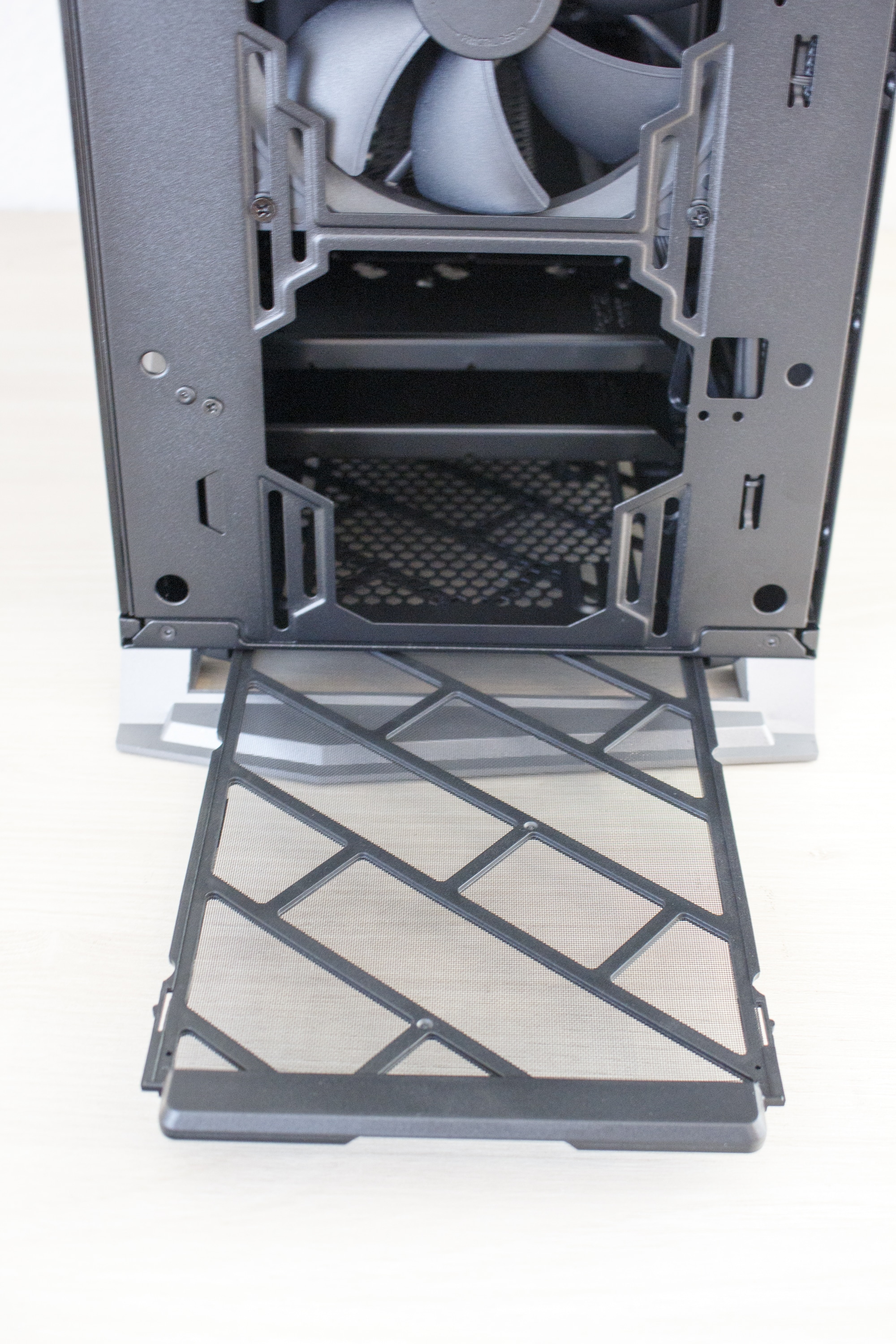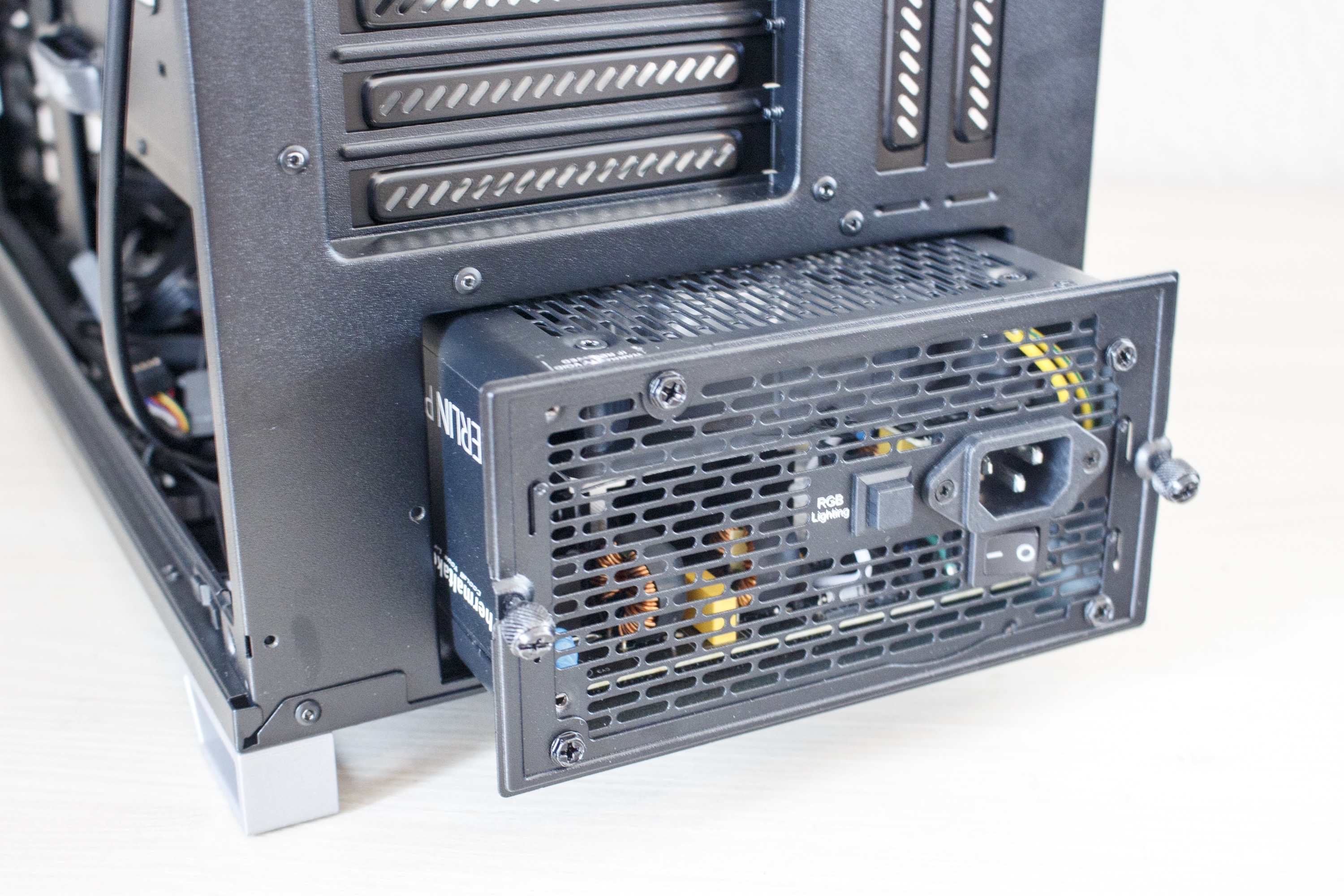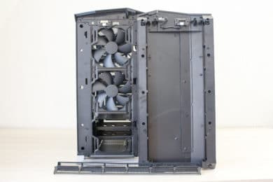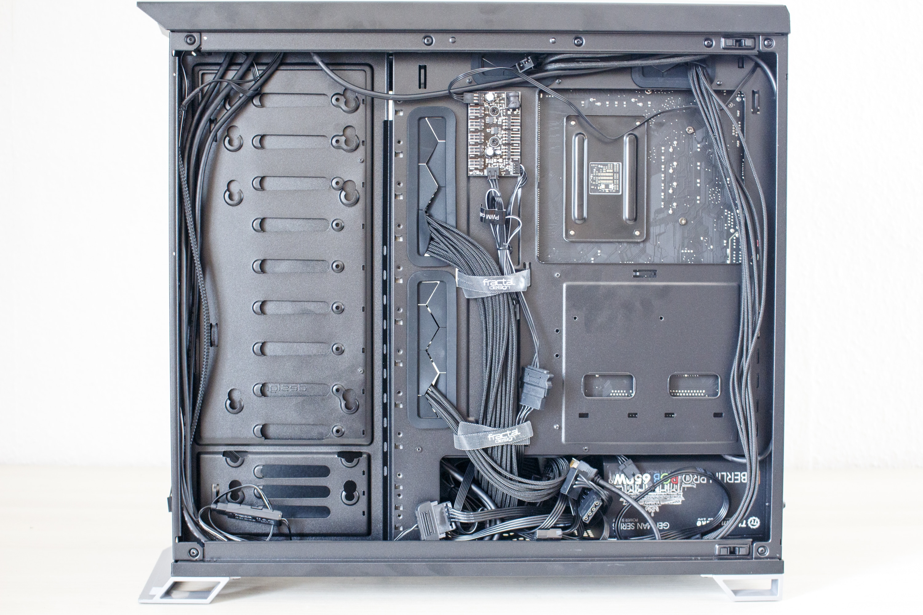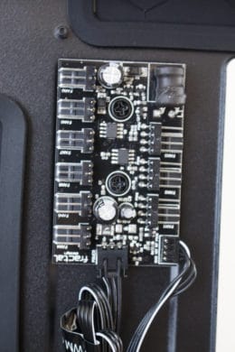 Zuletzt werfen wir noch einen Blick auf die Rückseite. Direkt hinter dem Mainboard-Tray gibt es zwei Stahlrahmen zur Montage von SSDs oder kleinen Festplatten. Rechts daneben hat der Hersteller die PWM-Lüftersteuerung für bis zu neun Lüfter angebracht. Die Stromversorgung der Platine erfolgt über einen SATA-Stromanschluss. Im Bodenbereich ist dann zuletzt noch der Montageplatz des Netzteils zu finden. Dieses liegt zur Entkopplung auf weichen Gummipuffern. Zuletzt kann noch angemerkt werden, dass der gesamte Boden perforiert ist und zudem mit Montageschienen für Lüfter oder Radiatoren ausgestattet wurde.