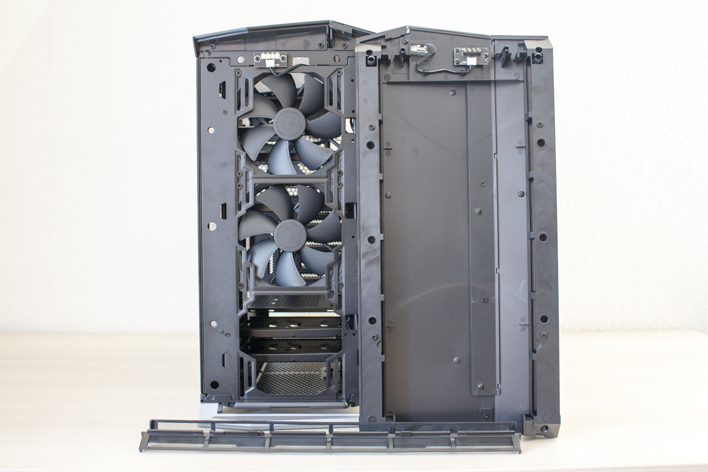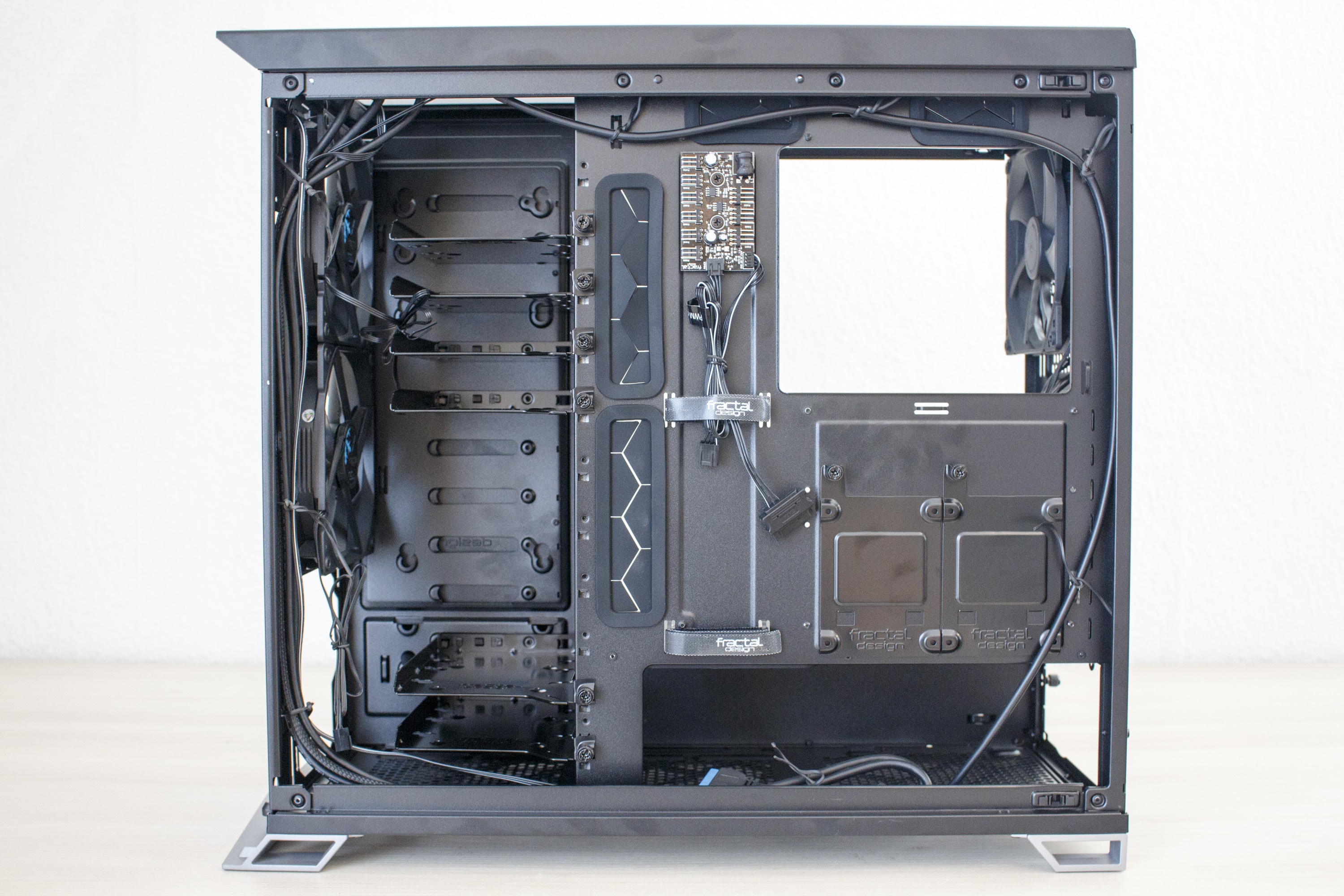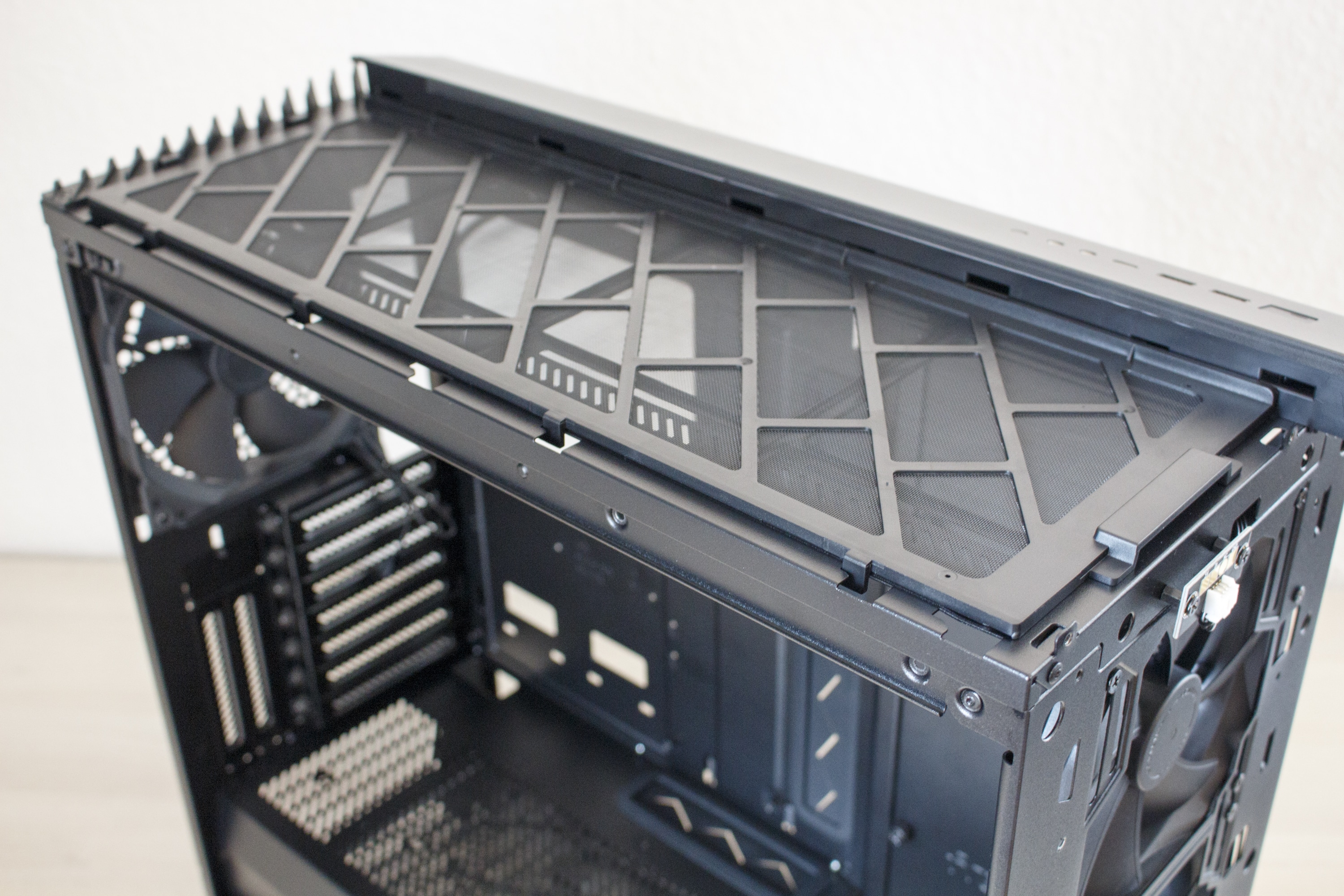 Mit einem kräftigen Ruck an den oberen beiden Seiten lässt sich das Element entfernen. Hinter dem 1,5 Kilogramm schweren Frontpanel verstecken sich die zwei vorinstallierten Lüfter mit einer Rahmenbreite von 140 Millimetern. Damit diese auch vor Staub geschützt sind, hat Fractal Design hinter den Lüftungsschlitzen zwei einfach zu entfernende Gewebefilter implementiert. Zuletzt dürfte jedem noch die Platine oberhalb der Lüfter ins Auge fallen. Wofür diese Platine gedacht ist, verraten wir aber erst in einem späteren Abschnitt.