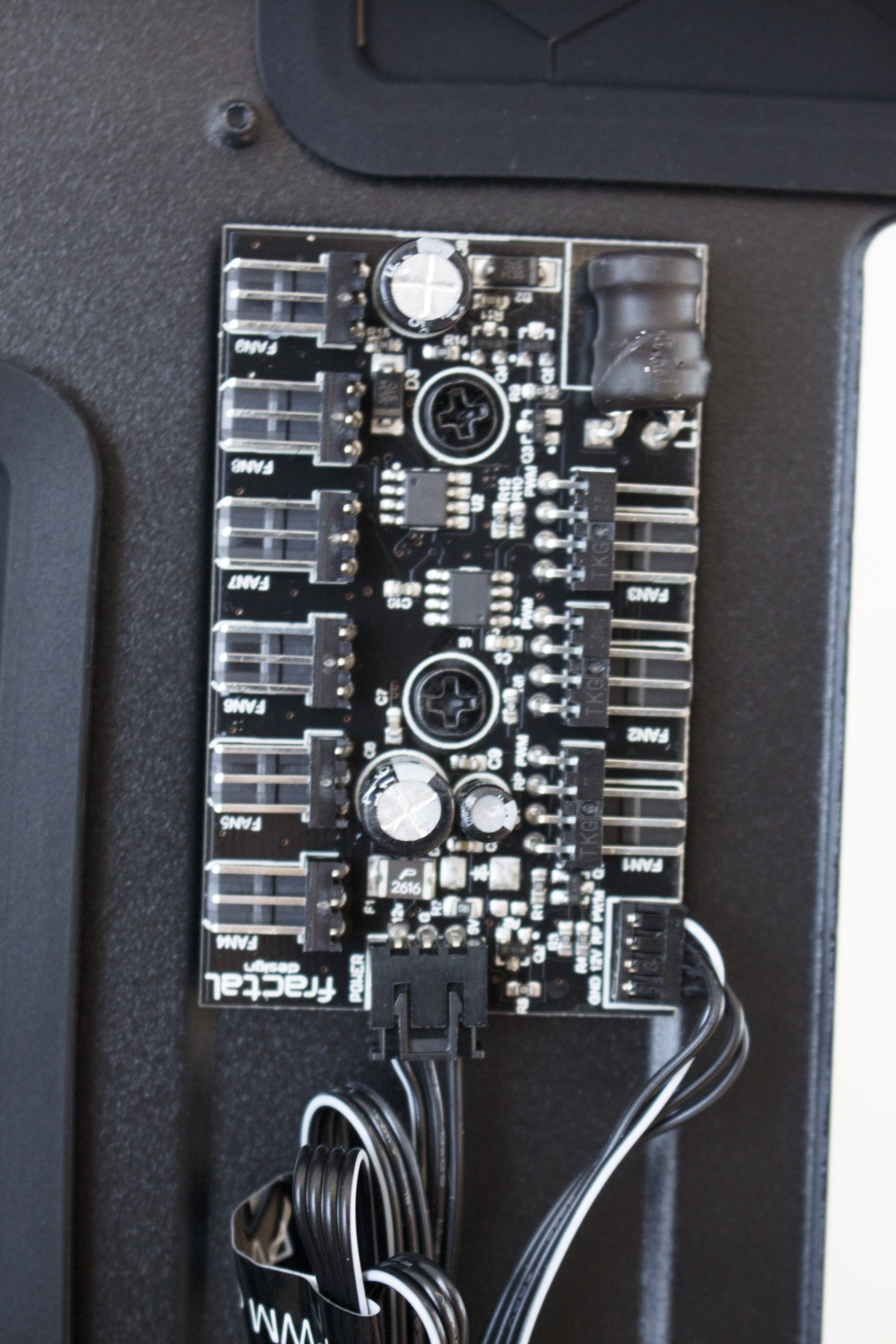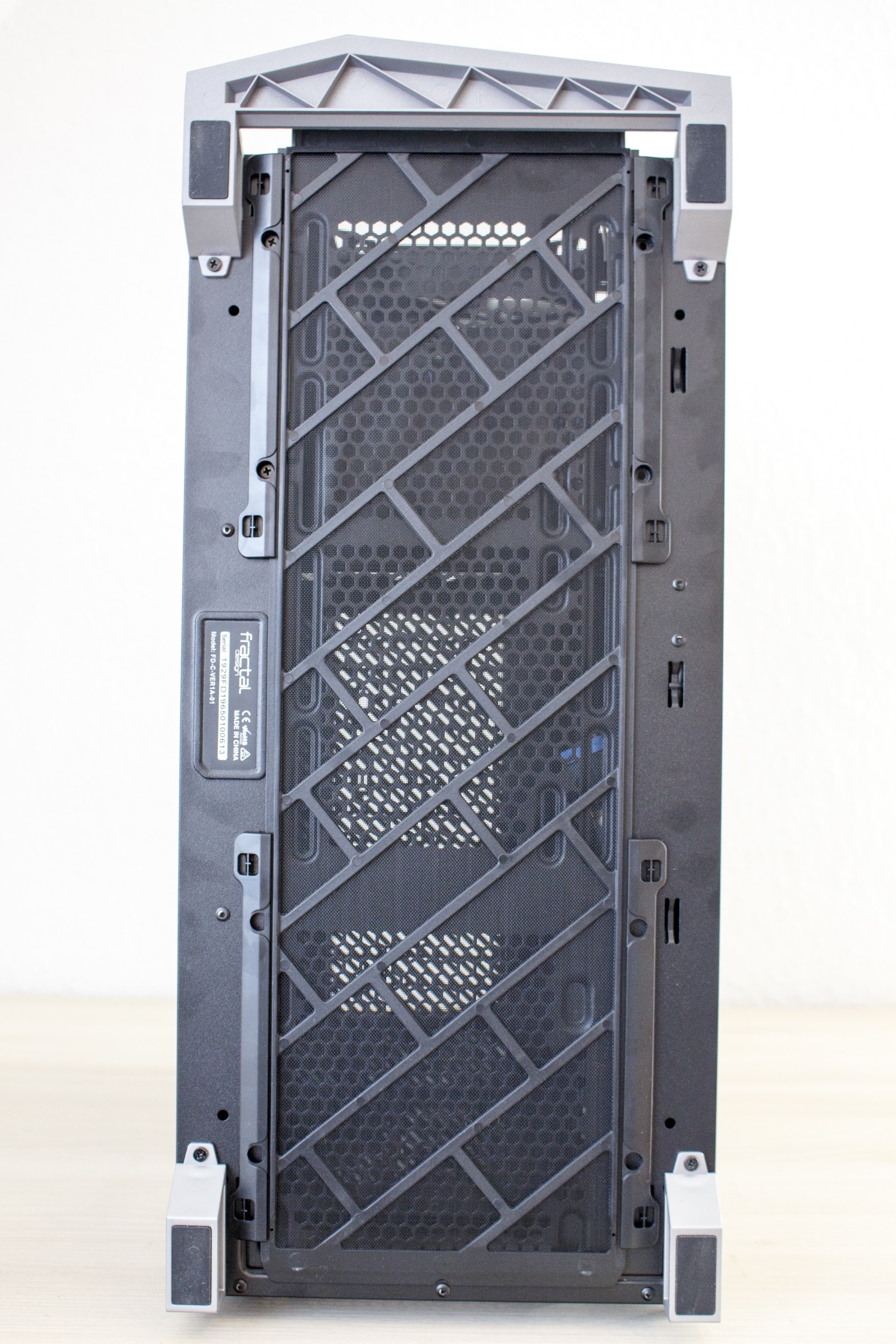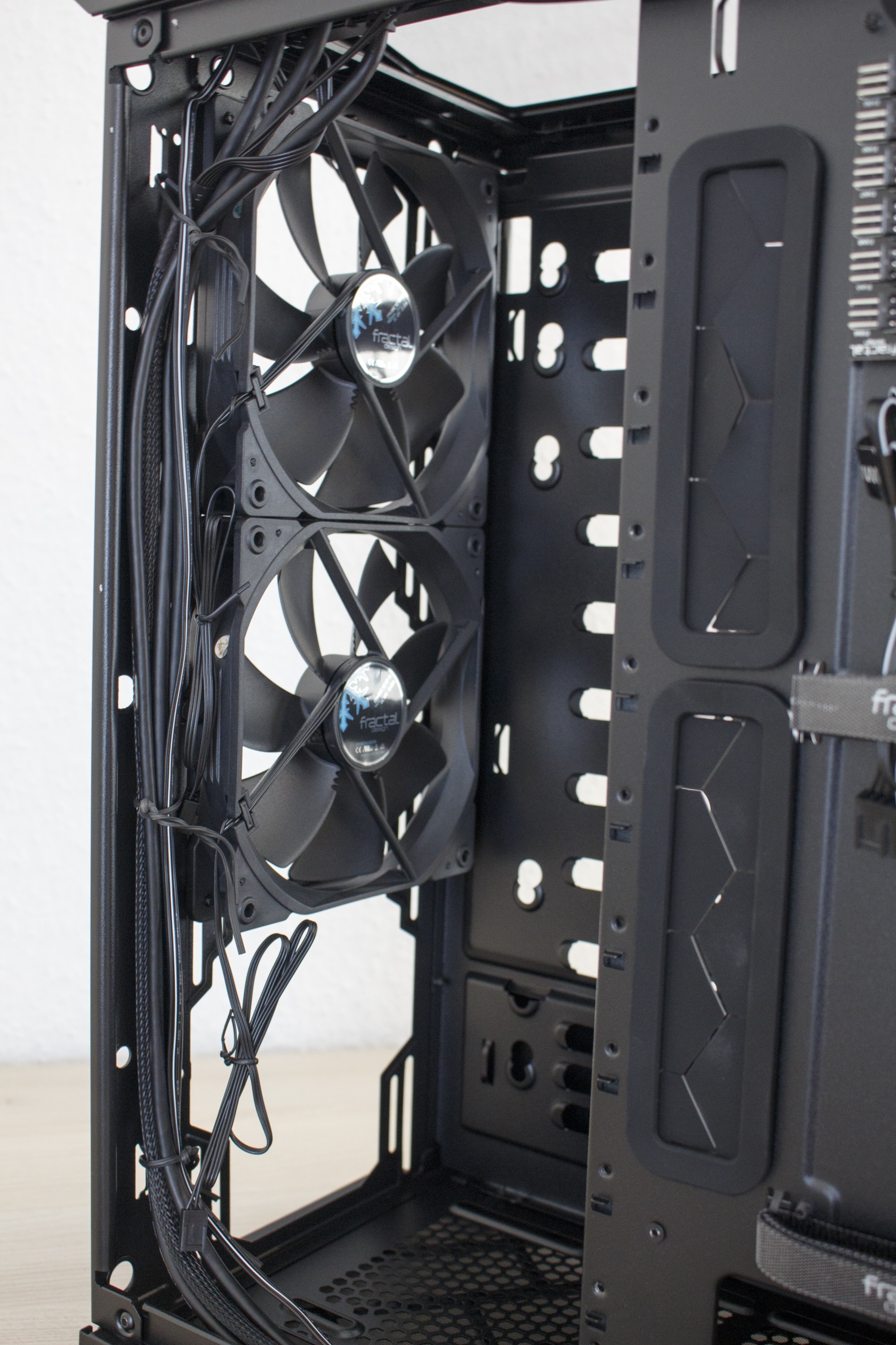 Mit einem kräftigen Ruck an den oberen beiden Seiten lässt sich das Element entfernen. Hinter dem 1,5 Kilogramm schweren Frontpanel verstecken sich die zwei vorinstallierten Lüfter mit einer Rahmenbreite von 140 Millimetern. Damit diese auch vor Staub geschützt sind, hat Fractal Design hinter den Lüftungsschlitzen zwei einfach zu entfernende Gewebefilter implementiert. Zuletzt dürfte jedem noch die Platine oberhalb der Lüfter ins Auge fallen. Wofür diese Platine gedacht ist, verraten wir aber erst in einem späteren Abschnitt.
