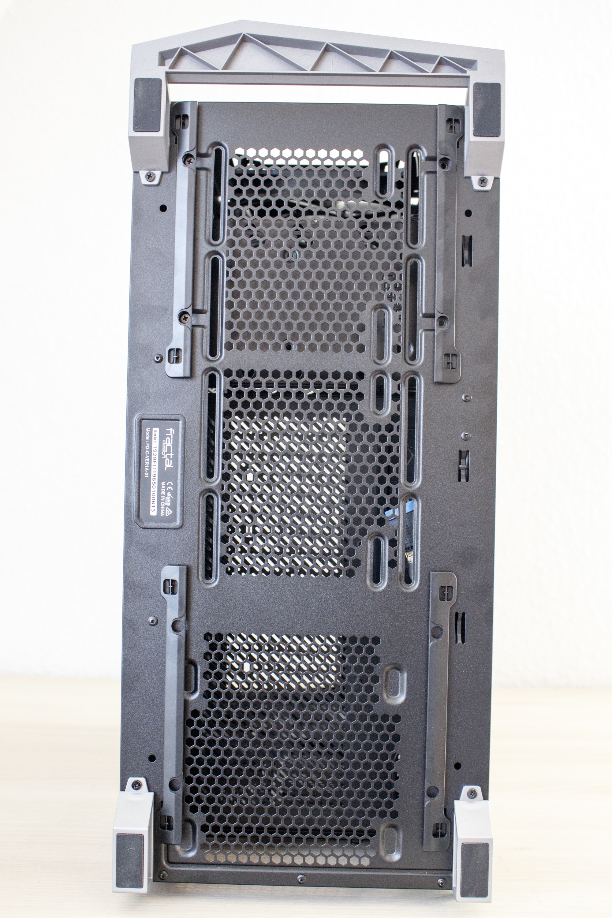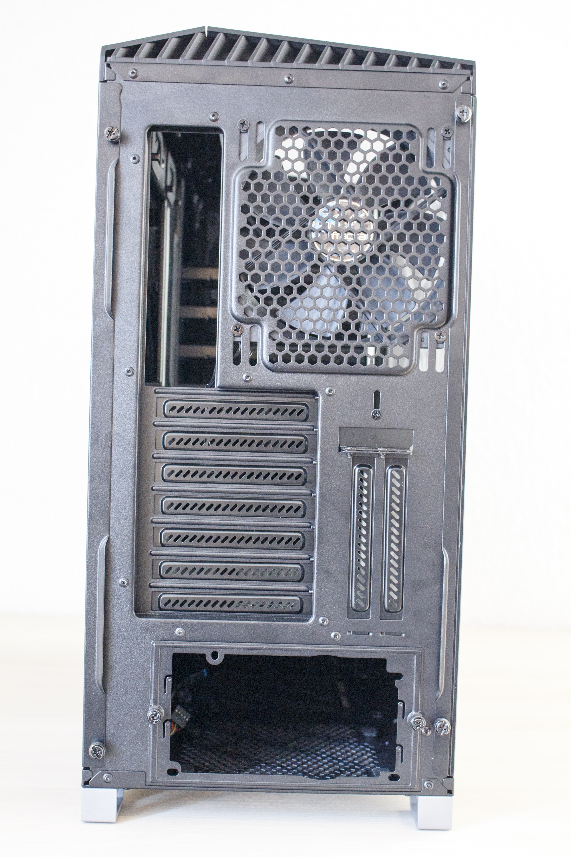 An der Rückseite lässt sich kein Unterschied zum Define R6 oder Define S2 erkennen. Das Netzteil wird unten montiert. Darüber finden sich sieben horizontale und zwei vertikale PCI-Slotblenden. Letztere sind natürlich dazu gedacht, um eine Grafikkarte vertikal montieren zu können. Außerdem hat Fractal Design das Vector RS im Heck mit einem dritten 140 mm-Lüfter ausgestattet.