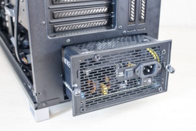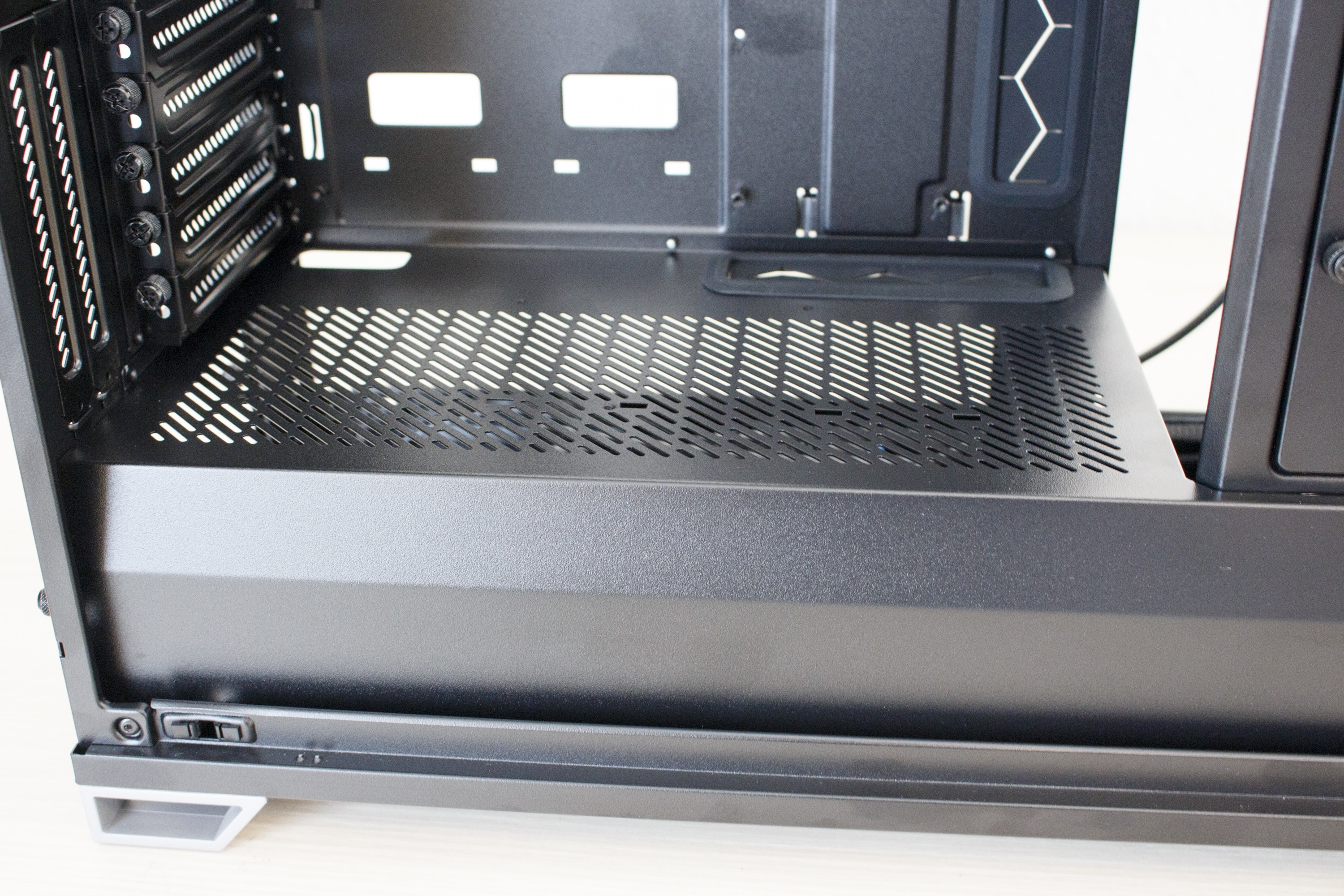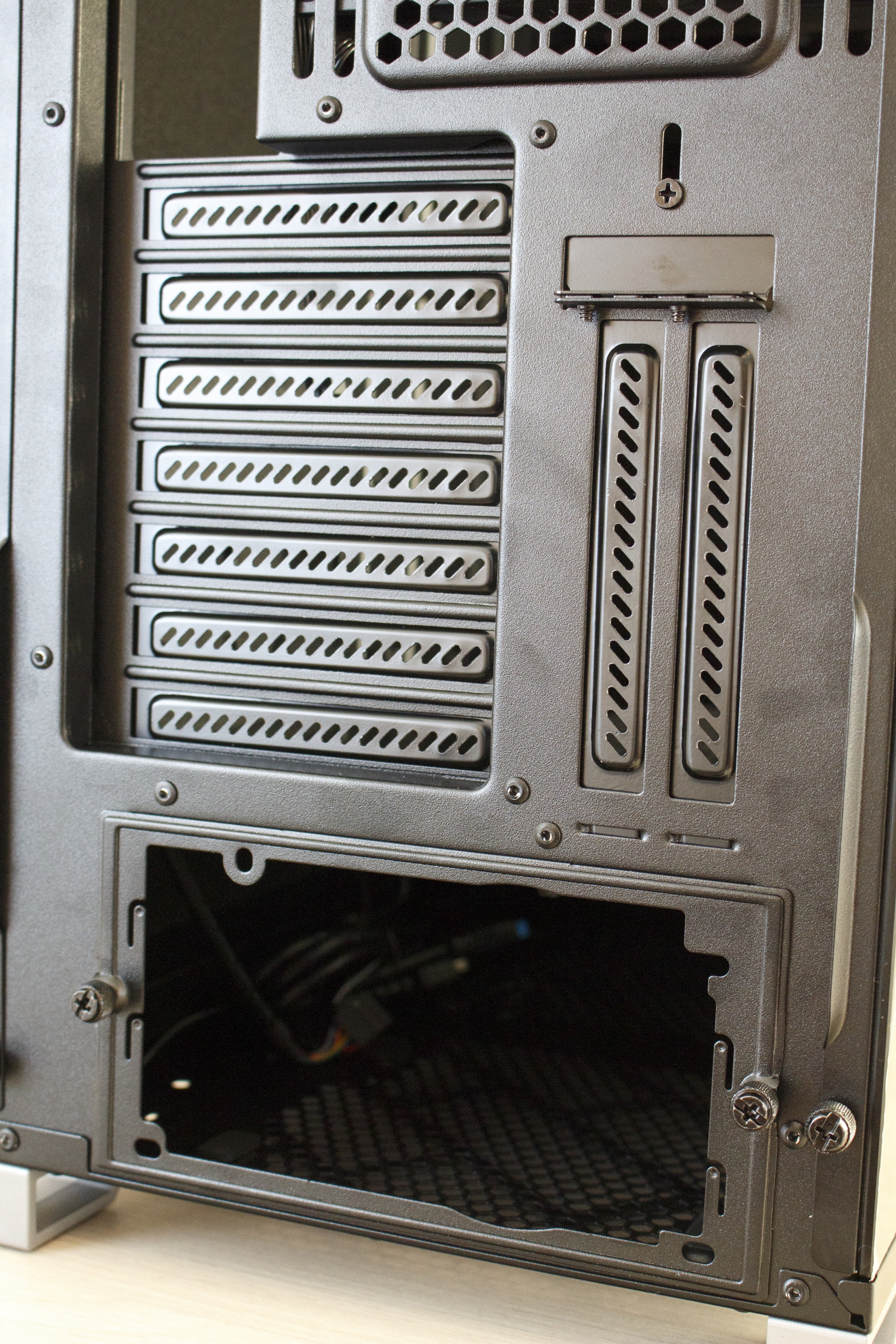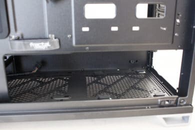 Auch bei diesem Gehäuse darf die stylische und gleichzeitig praktische Netzteilabdeckung natürlich nicht fehlen. Sie dient zur Verdeckung des Netzteils und der Anschlusskabel. Der vertikale Teil der Abdeckung verdeckt den ganzen unteren Bereich, horizontal reicht die Abdeckung allerdings nur bis zum Ende des Mainboard-Trays. Und das hat einen ganz einfach Grund. Denn im Gegensatz zu vielen anderen aktuellen Gehäuse, können im Vector RS immernoch zahlreiche Festplatten im 3,5″-Format verbaut werden.