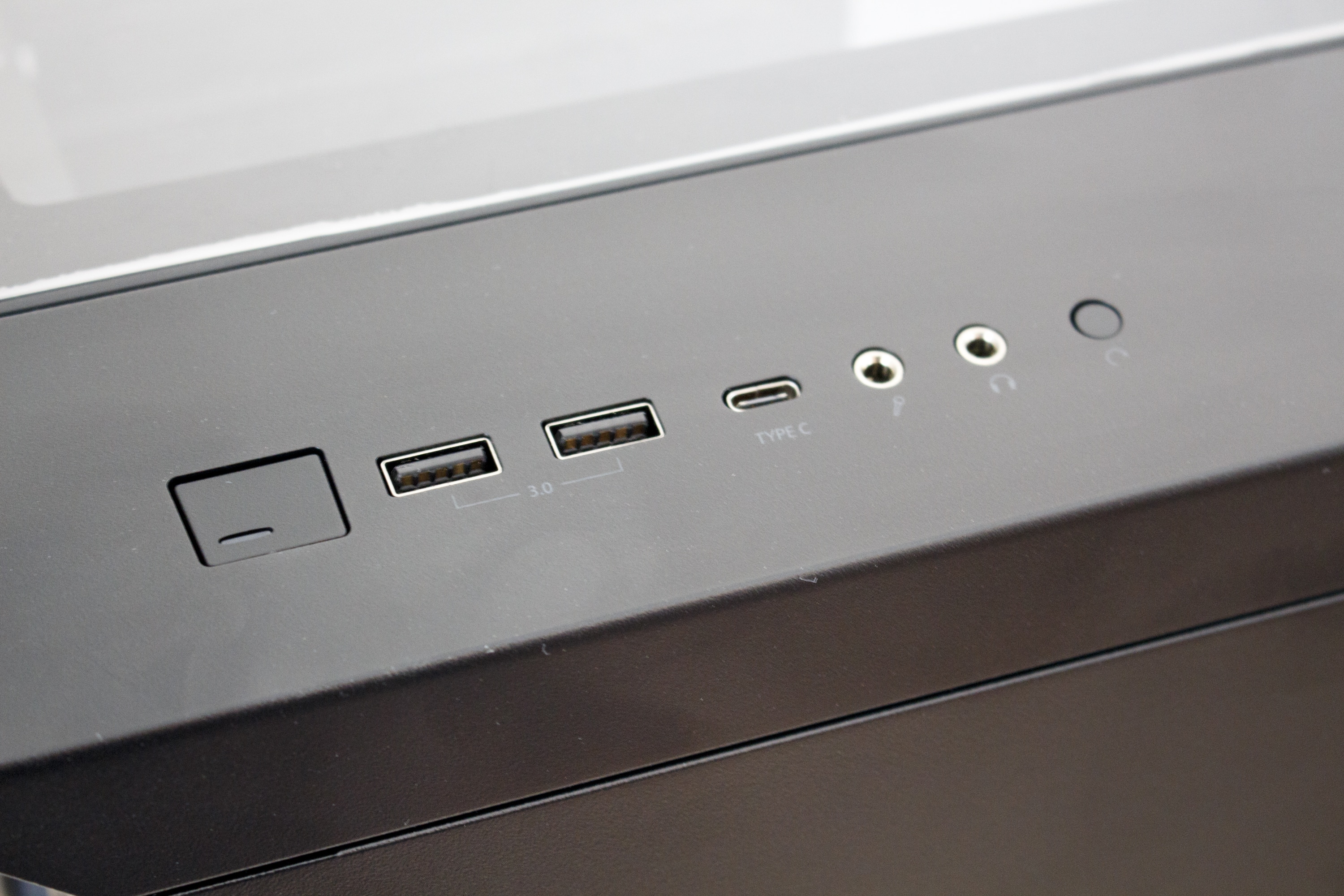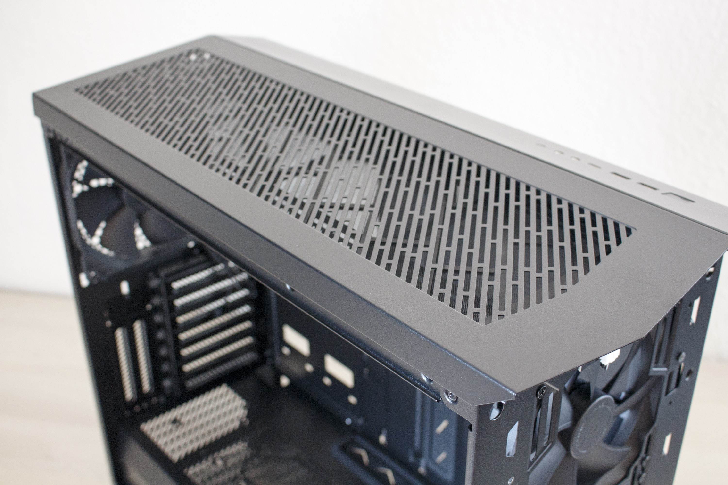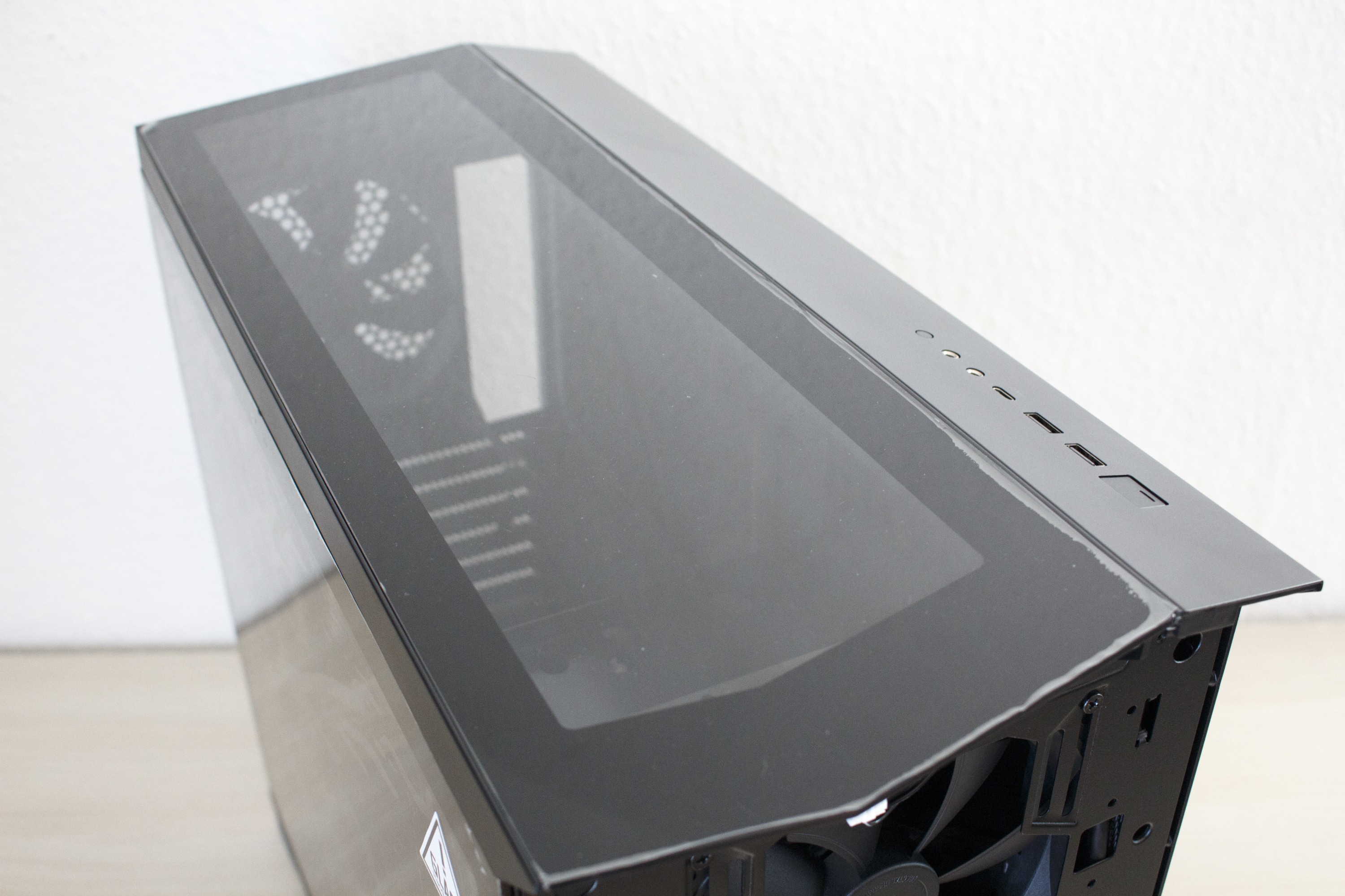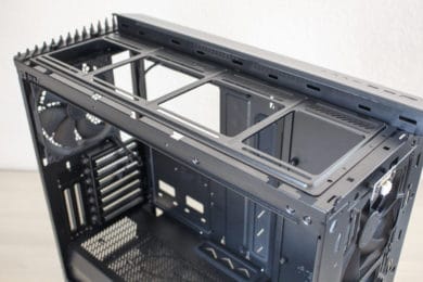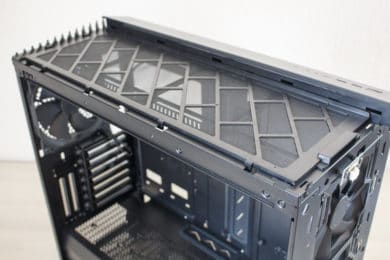 Lässt man den Blick in Richtung Deckel wandern, sticht einem hier auch wieder ein sehr großes Glaselement ins Auge. Auch dieses wurde mit einer Schutzfolie beklebt. Insgesamt stellt der Deckel designtechnisch das genaue Gegenteil zum Frontelement dar. Hier besteht nämlich nur ein Drittel aus Stahl und die restlichen zwei Drittel aus Glas. Um aber auch die Montage von Lüftern oder Radiatoren im Deckel zu ermöglichen, legt Fractal Design dem Vector RS ein zweites Top-Panel und einen Lüfterrahmen bei. Dieses besteht komplett aus Stahl und dürfte durch die Öffnungen den Airflow im Inneraum messbar verbessern. Zum Umbau reicht es, lediglich zwei Kreuzschlitzschrauben zu entfernen und das Glaselement nach vorne abzuziehen. „As easy as pie“ wie der Amerikaner zu sagen pflegt. Zuletzt findet man im Deckel noch das I/O-Panel. Dieses verfügt über zwei Typ-A USB 3.0-Anschlüsse, einen Typ-C USB 3.0-Anschluss mit internem Stecker, Mikrofon- bzw. Kopfhörer-Anschluss und einen Power- bzw. Reset-Knopf.