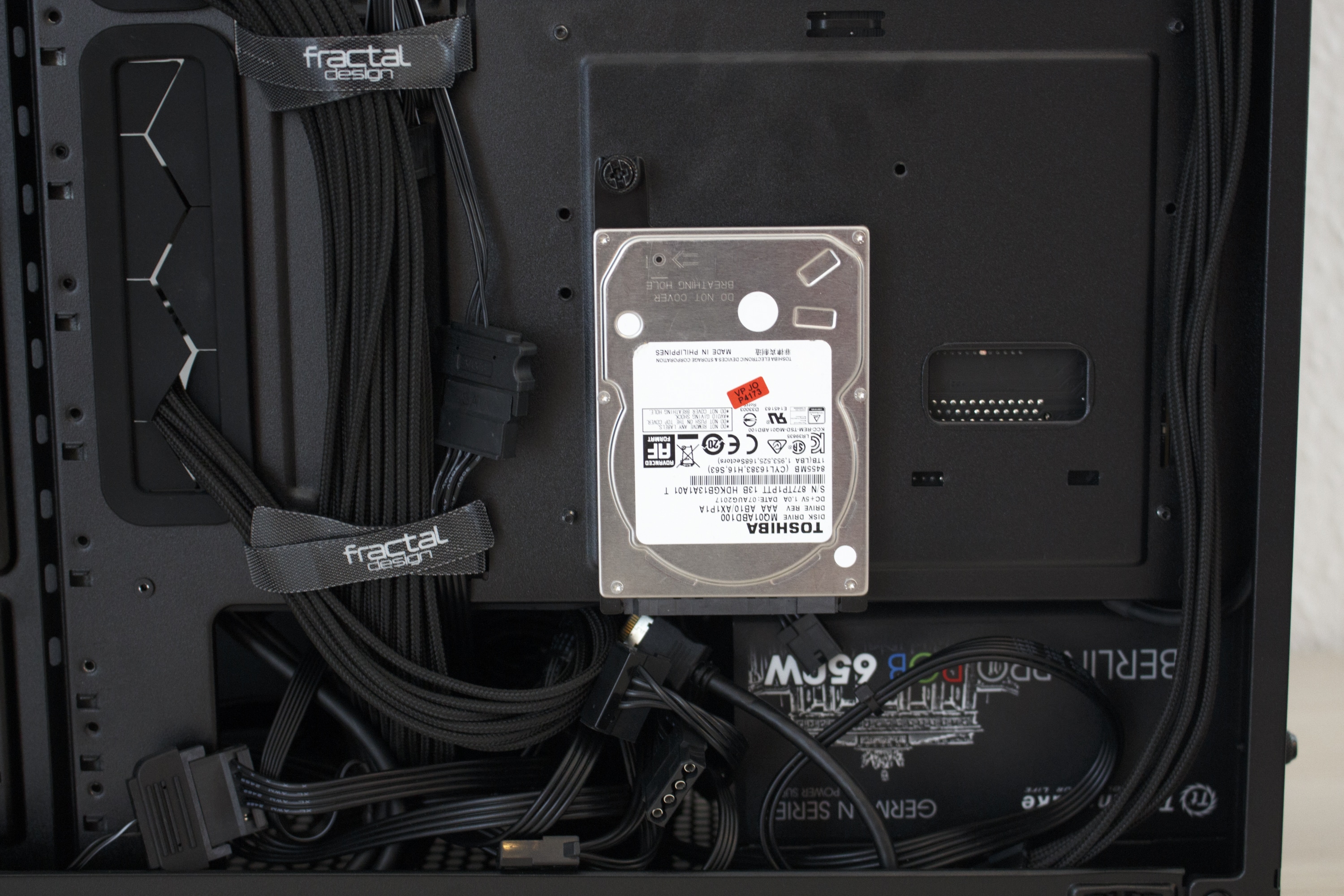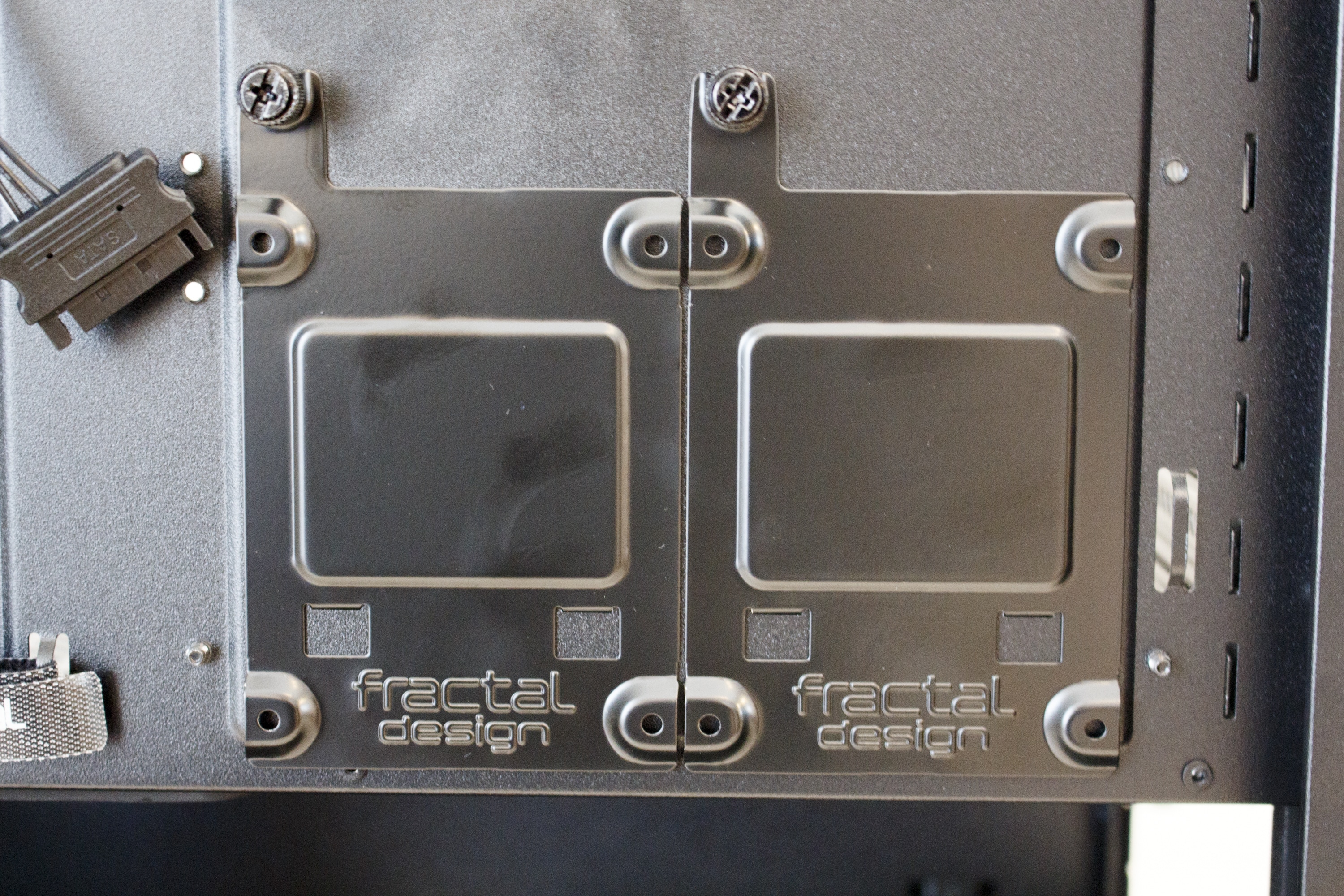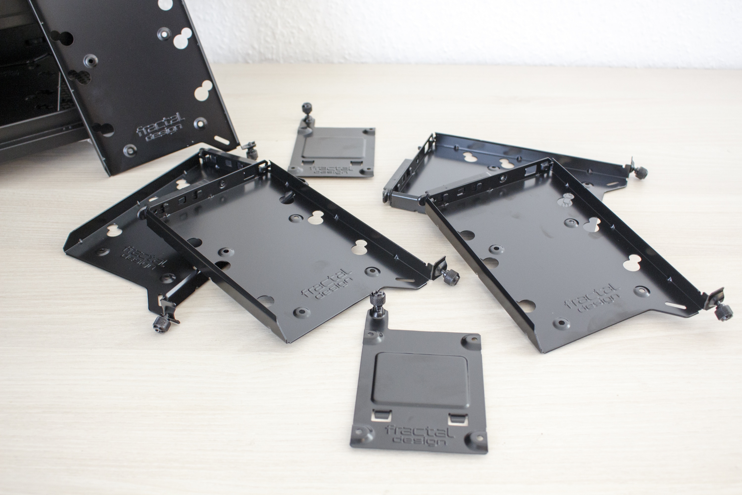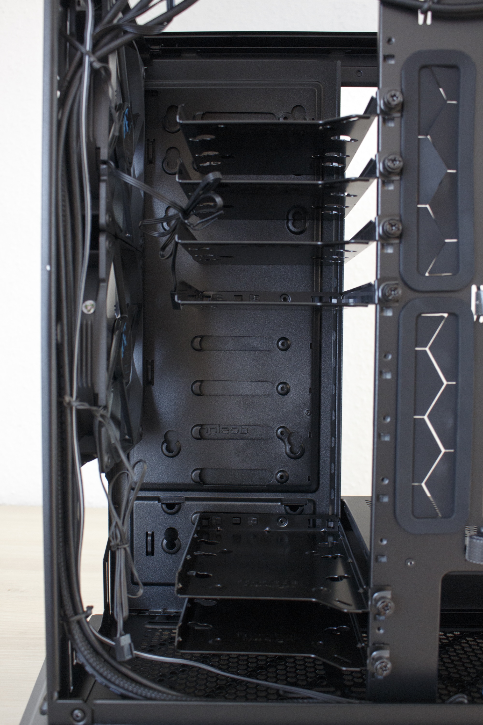 Dazu kommen wieder hochwertige Rahmen aus Stahl zum Einsatz auf denen die Festplatten entkoppelt ruhen können. Damit diese Eigenschaft das saubere Erscheinungsbild im Innenraum nicht zerstört, verfügt dieser Midi-Tower auf der rechten Seite über eine große Abdeckung welche die Festplatten-Schlitten und die optisch nicht so ansprechenden Haltepunkte der HDD-Schlitten verdeckt. Wer keine großen Festplatten und stattdessen eine Wasserkühlung verbauen möchte, der kann die Abdeckplatte auch auf Höhe des Mainboard-Trays umschrauben, um so Platz für sehr tiefe Frontradiatoren zu schaffen. Diese elegante und durchdachte Variabilität des Innenraums hat uns schon beim Define R6 sehr gut gefallen.
