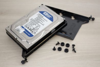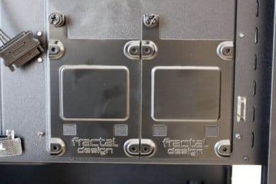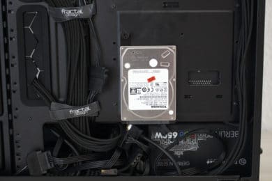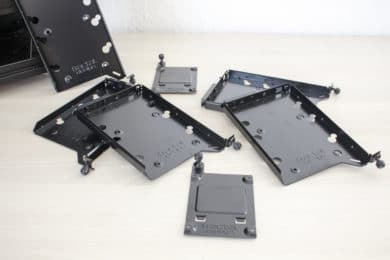 Die Montage der Festplatten ist einer der wenigen Fälle, wo ein Schraubendreher zum Einsatz kommen muss. Die Befestigung der SSDs an den Rahmen erfolgt über vier Schrauben. Der Rahmen selber wird mittels einer Rändelschraube mit dem Mainboard-Tray verbunden. Wer seine SSDs lieber präsentieren möchte, kann diese aber auch oberhalb der Netzteilabdeckung anbringen. Auch der Einbau von 3,5″-HDDs benötigt die Verwendung eines Schraubendrehers. Mithilfe von länglichen Schrauben werden Gummiringe unter die Festplatte geschraubt. Anschließend kann man den Datenträger entkoppelt am Rahmen befestigen und diesen wieder in den Schacht schieben.