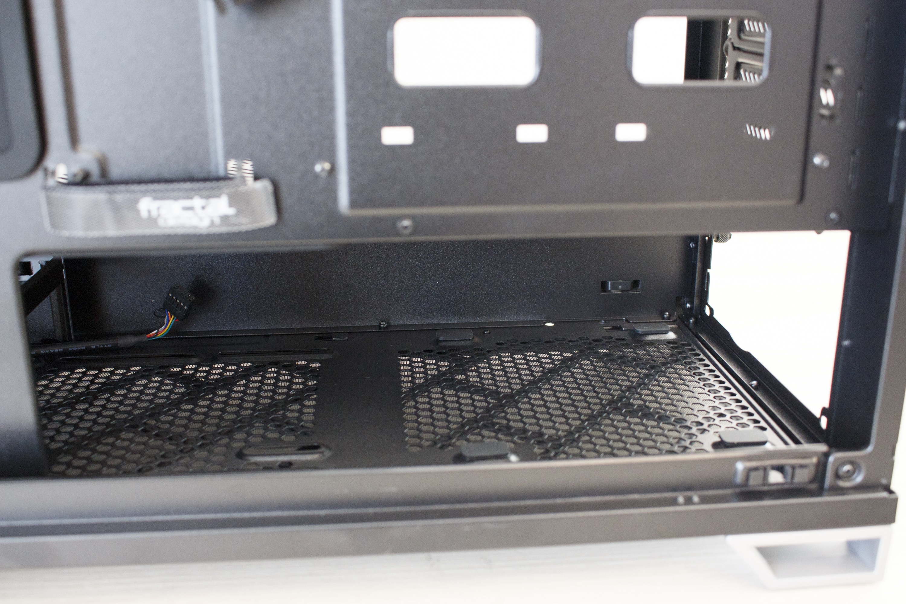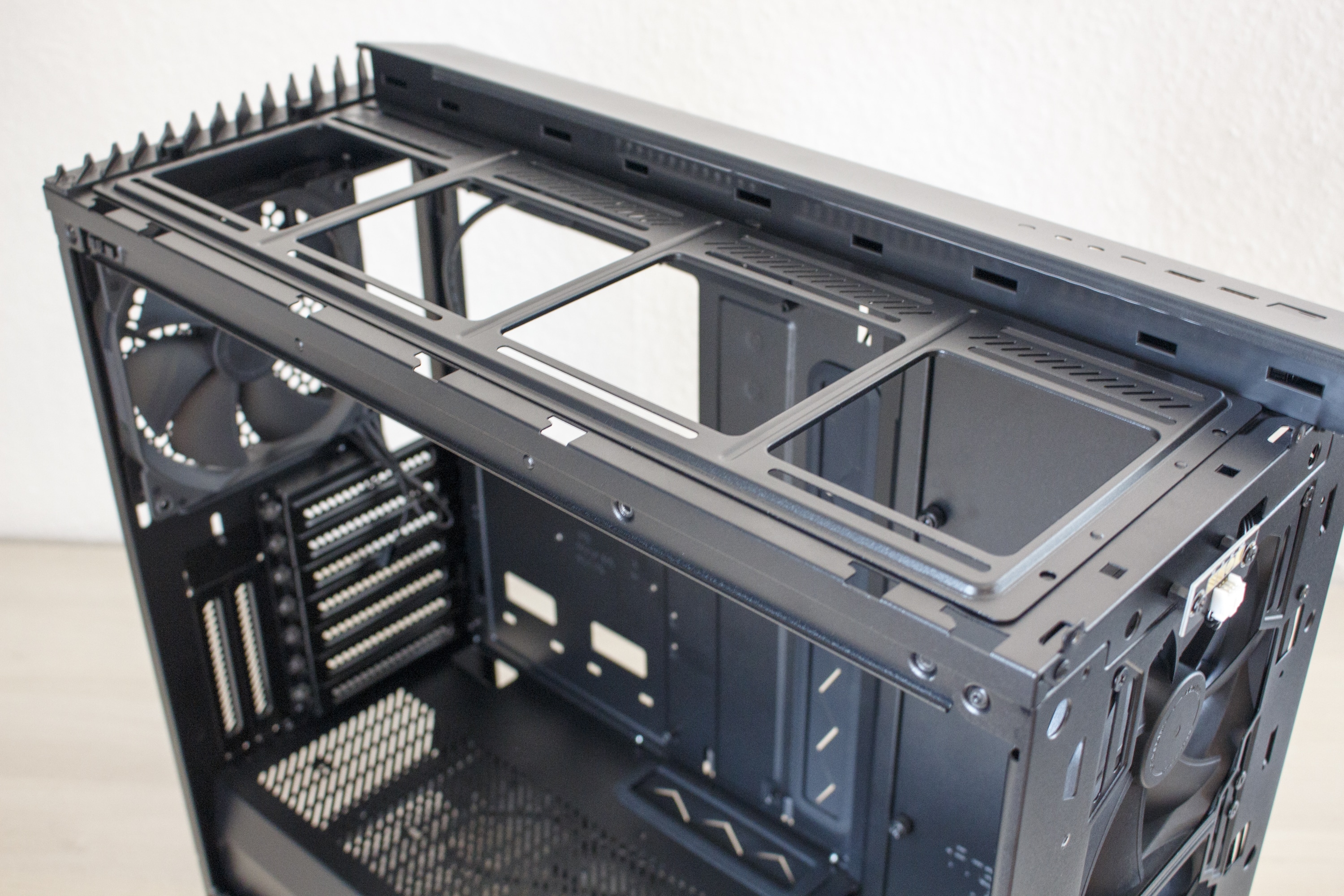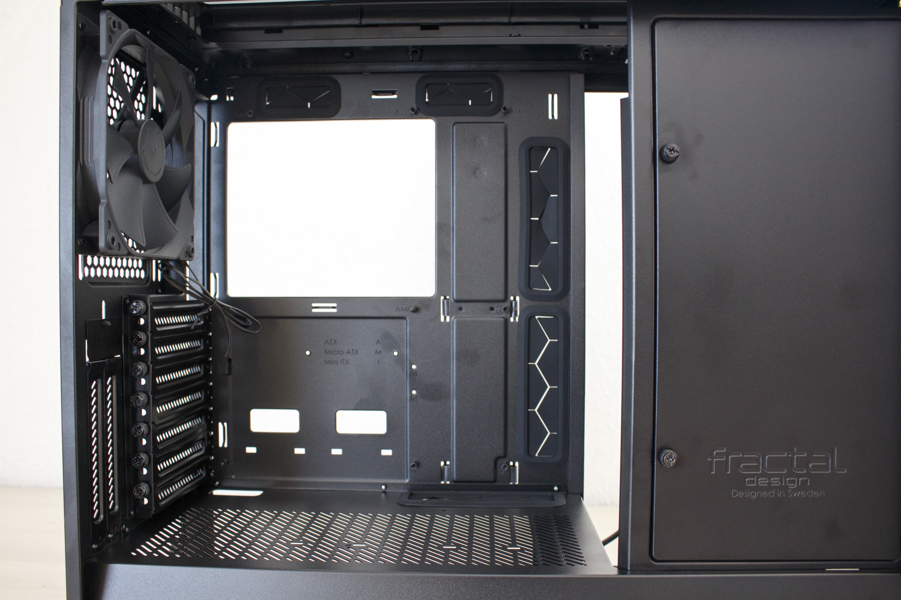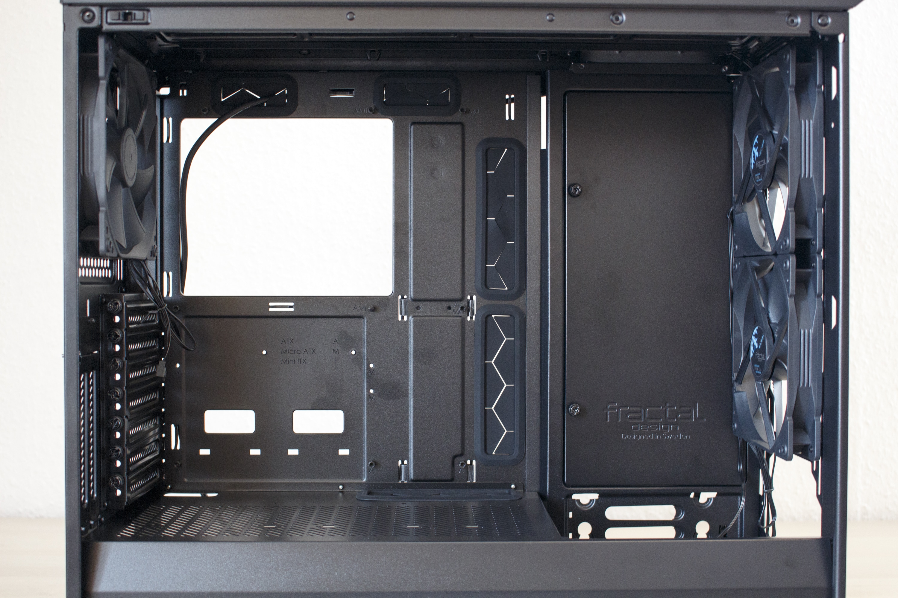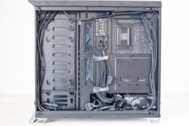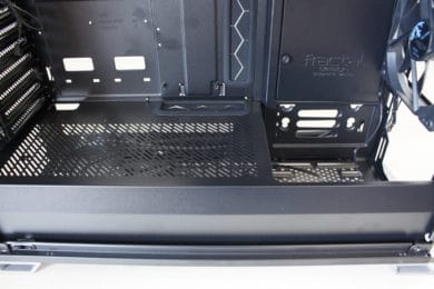 Wer eines der aktuellen Fractal Design schon mal von innen gesehen hat, dem dürfte der Innenraum des Vector RS nicht wirklich unbekannt vorkommen. Der Grundkorpus ist nämlich zu 100% mit dem Define R6 oder dem Define S2 identisch. Das bedeutet, dass Fractal Design auch bei seiner neuesten Kreation die strikte Innenraumtrennung in Netzteil-Kammer und Mainboard-Kammer beibehält. Im zweiten Bereich finden, wie man es vielleicht auch schon erahnen kann, das Mainboard und die Erweiterungskarten einen Platz. Außerdem hat Fractal Design das Motherboard-Tray ringsherum mit großen und gummierten Öffnungen für Kabel ausgestattet.