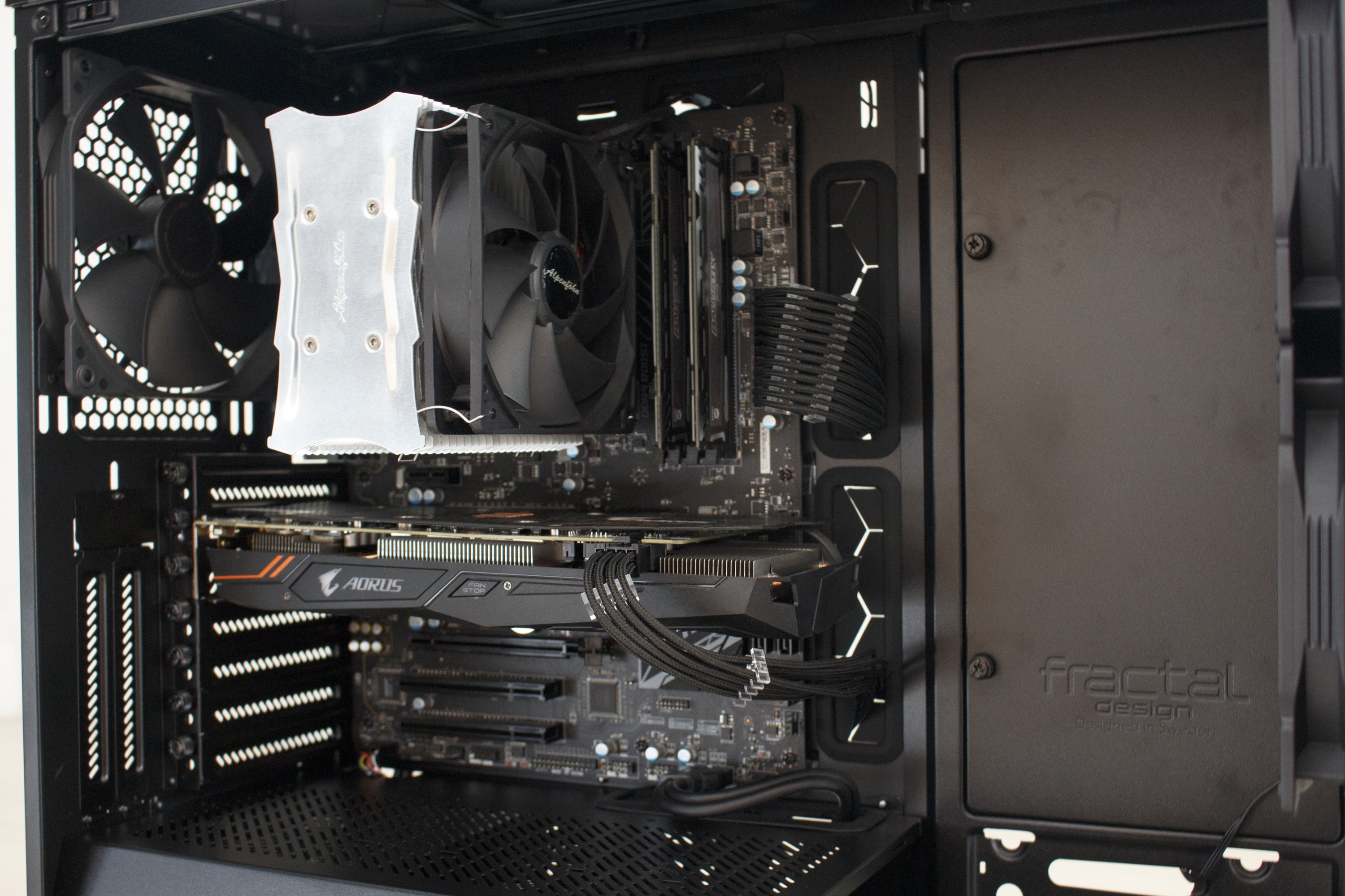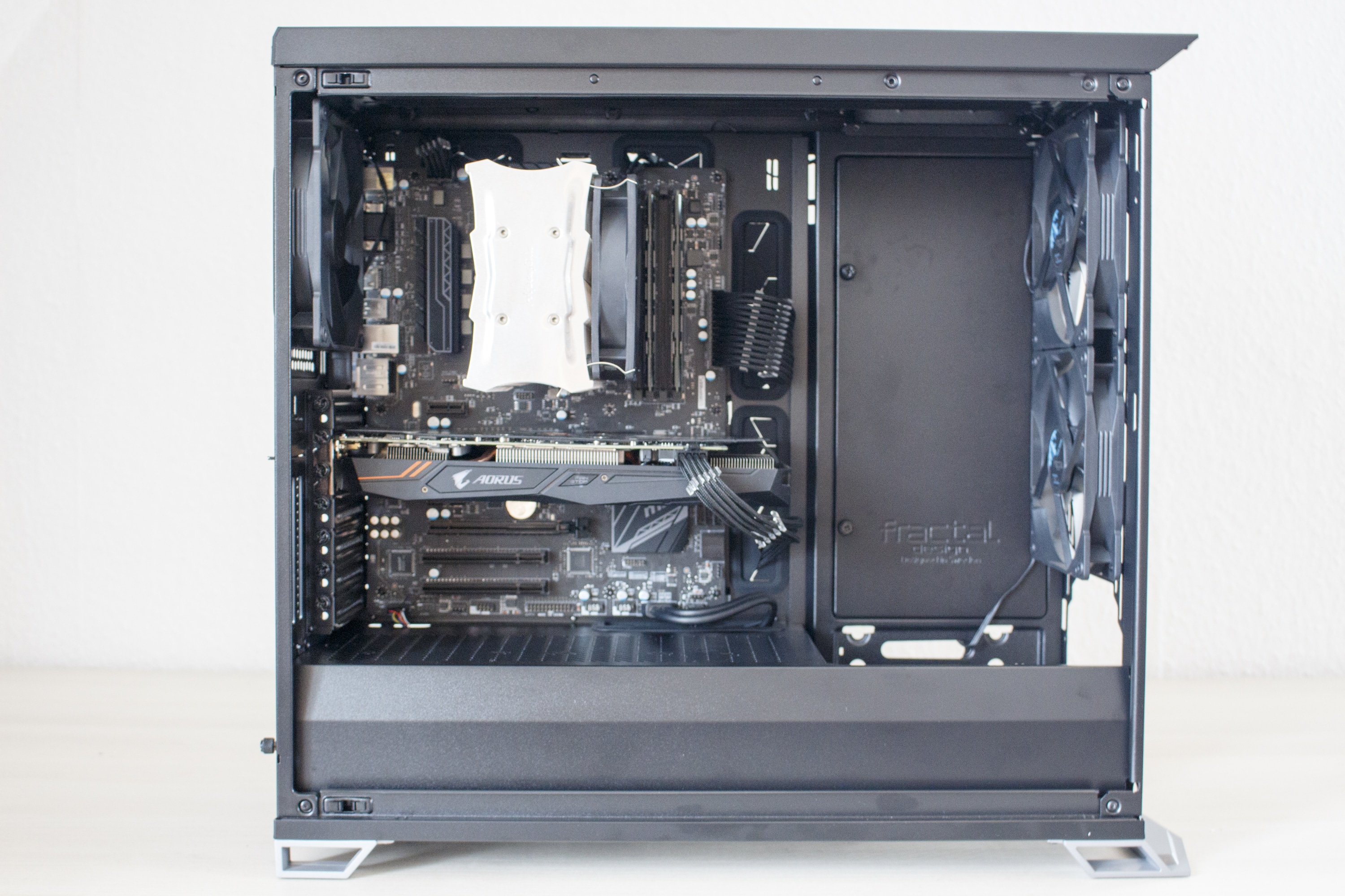 Nun kommen wir zum Systemeinbau. Als Hardware verwenden wir einen AMD Ryzen 5 1400 auf einem MSI B350 PC Mate mit 16GB Crucial Ballistix Sport LT grau DDR4-2666. Der Prozessor wurde auf 3,8 Ghz übertaktet und wird mit einem Alpenföhn Matterhorn Pure gekühlt. Für die Bildausgabe ist eine GTX 1060 6GB von Gigabte AORUS zuständig. Die Stromversorgung erledigt das nichtmodulare Berlin Pro RGB 650W mit RGB-Lüfter. Um die Verkabelung optisch noch etwas aufzuwerten, wurden zudem einzeln gesleevte Kabelverlängerungen von Phanteks verwendet.