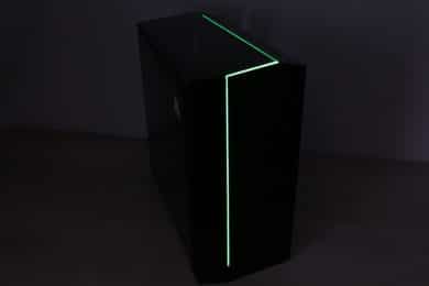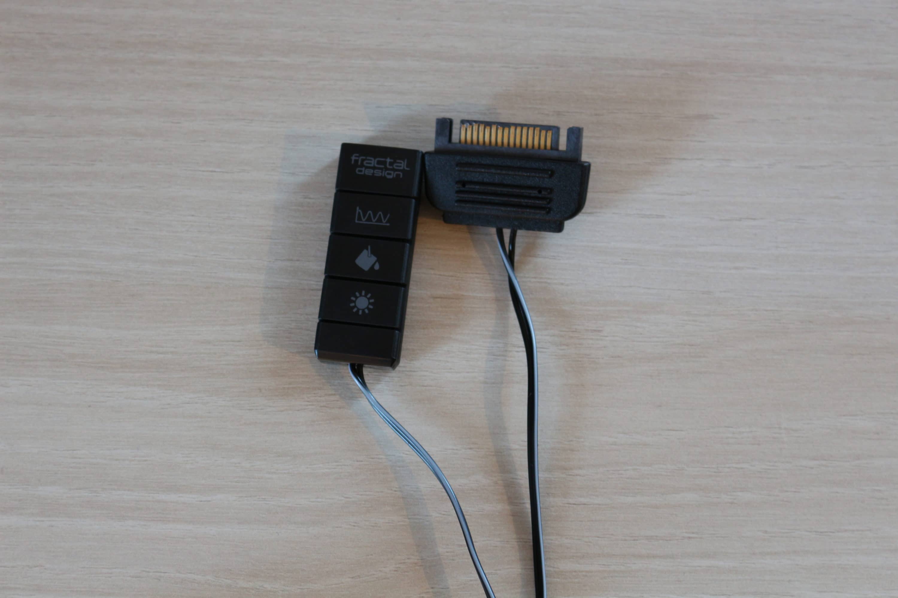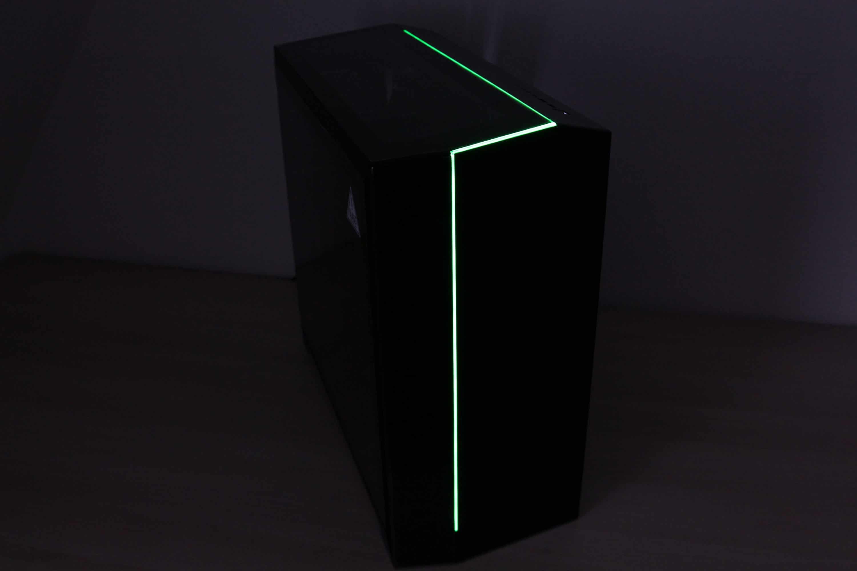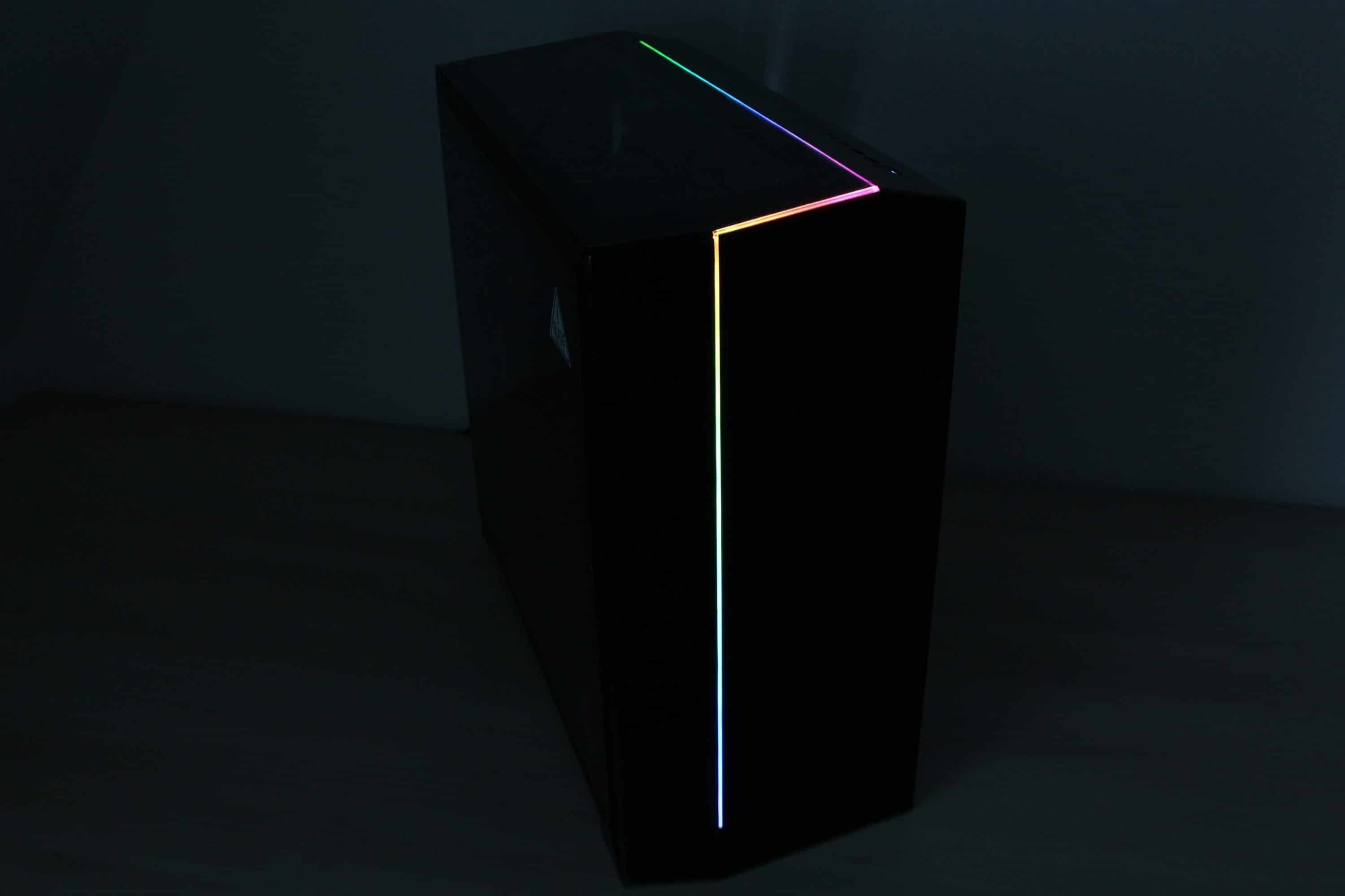 Natürlich dürfen im Fractal Design Vector RS auch ein paar Beleuchtungsakzente nicht fehlen. Dazu hat der Hersteller in der Front und im Deckel dünne Leuchstreifen zwischen dem Glas und dem Stahlpanel angebracht. Die Ansteuerung der LED-Streifen übernimmt eine Platine die im Deckelelement versteckt ist. Die Verbindung mit dem Mainboard erfolgt über ein 5V-RGB-Anschluss mit drei Pins und ist somit vollständig digital adressierbar. Wenn das eigene Mainboard nicht über so einen Anschluss verfügt, kann man zur Steuerung auch das mitgelieferte Steuermodul verwenden. Dieses verfügt über drei Knöpfe für die Helligkeit, die Farbe und den Modus. Möglich sind zum Beispiel Rainbow, pulsierend oder auch einfach nur einfarbig. Um den Kabelsalat am Frontelement zu vermeiden, erfolgt die Strom- und Datenübertragung über eine weitere Platine mit vier Kontakten. Abschließend noch ein paar Impressionen zur Beleuchtung.