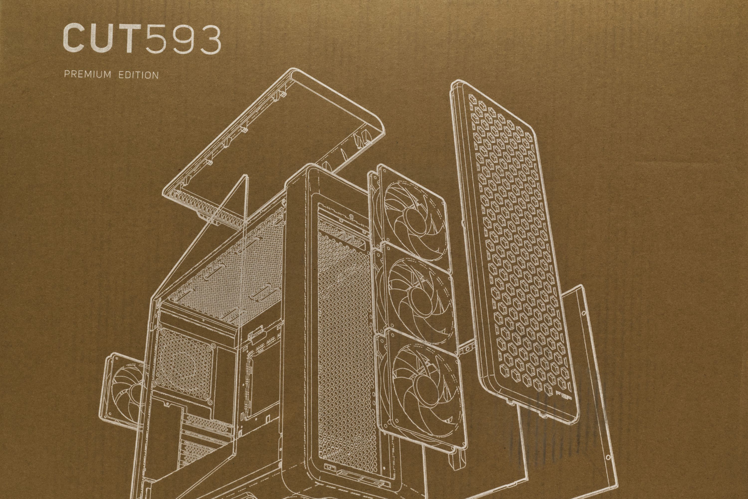 Der Karton, in dem das FSP CUT593 Premium Edition geliefert wird, ist braun mit einem weißen Druck. Auf einer Seite steht der Name im Vordergrund und auf der anderen Seite ist eine Explosionszeichnung des Gehäuses abgebildet. Eine Anleitung liegt nicht dabei, dafür jedoch ein QR-Code, der auf eine Online-Anleitung weiterleitet.