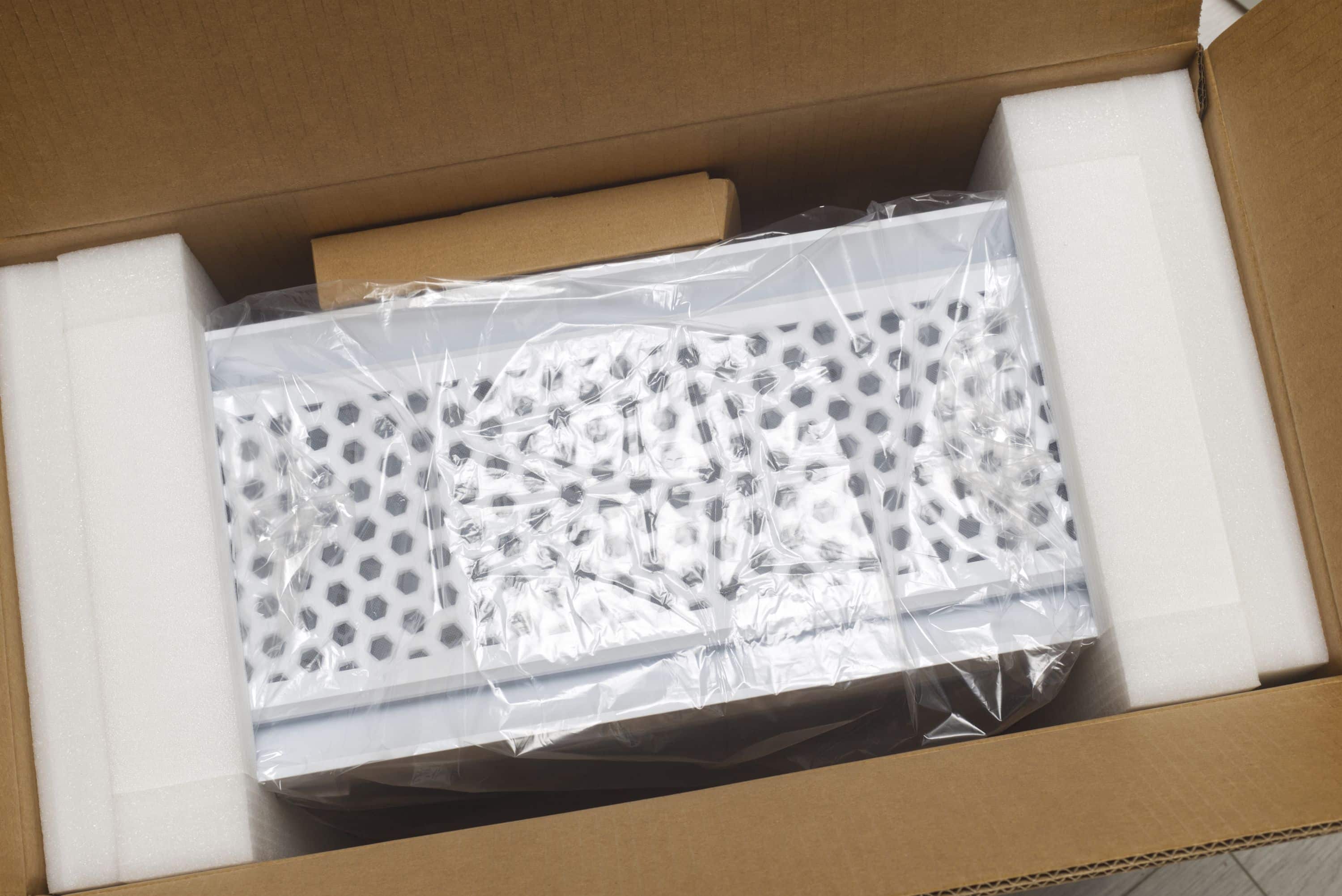 Das Gehäuse selbst steckt in einer Plastiktüte und wird von zwei Schaumstoffteilen gehalten. Das insgesamt nicht gerade kleine Case wird mit so viel Platz zum Rand gehalten, dass die Box insgesamt sehr groß ist.