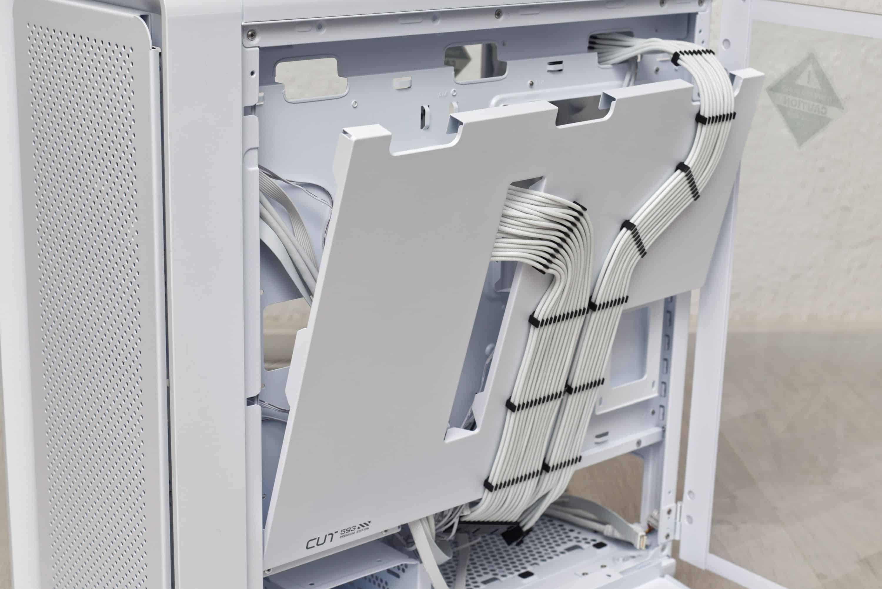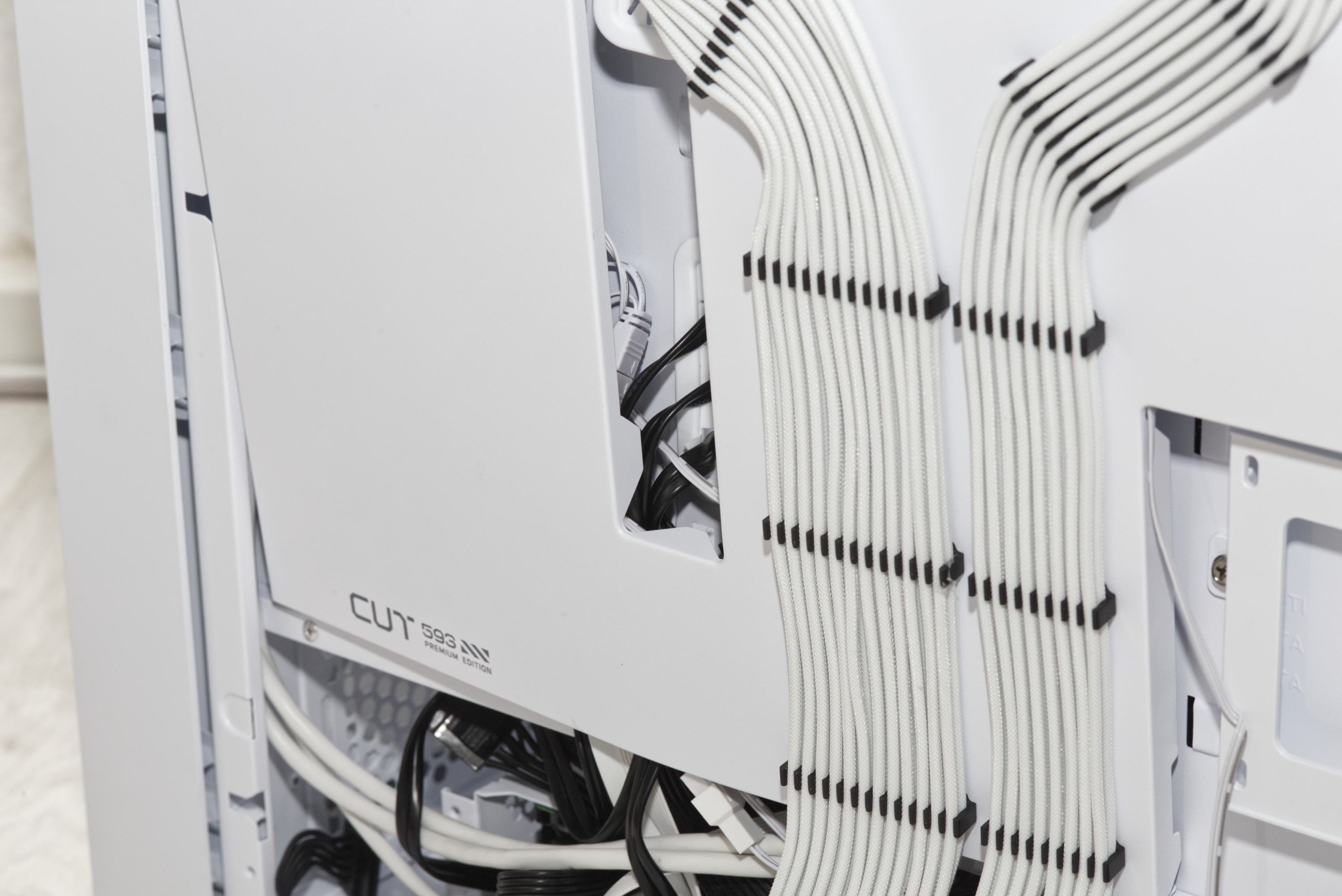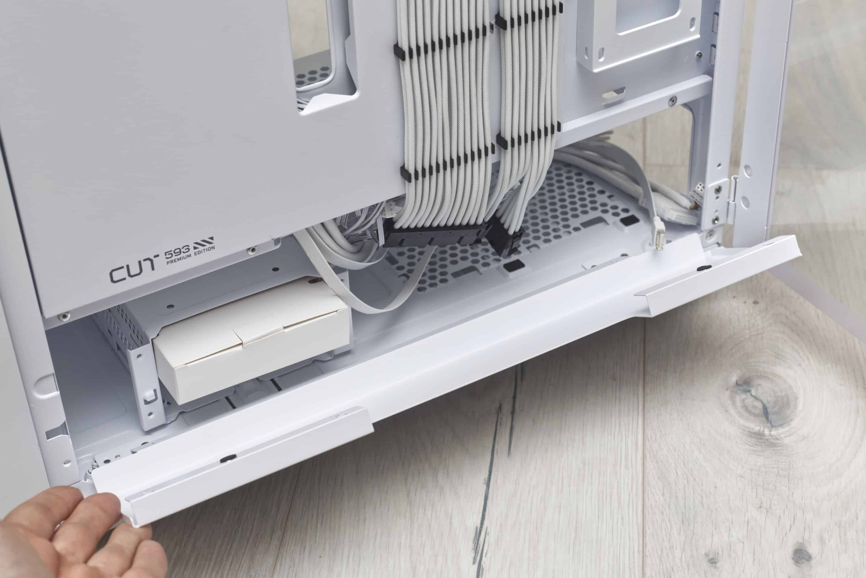 Was bei dieser Premium Edition des CUT593 allerdings besonders heraussticht, das ist, dass man nicht nur auf der linken Seite eine vollflächige Glasscheibe besitzt, um auf die Komponenten zu blicken, sondern auch auf der rechten Seite. Ja, dort, wo das Kabelmanagement durchgeführt wird. Und zu allem Überfluss sind hier schon Extensions mit ummantelten Kabeln und Kabelkämmen vorbereitet. Diese sitzen auf einer Abdeckung, die magnetisch über dem Mainboard-Blech sitzt, worunter weitere Kabel versteckt werden können. Auch die Netzteilabdeckung besitzt eine weitere Abdeckung auf der Rückseite, um die ganzen Überlängen der Kabel verstecken zu können. Wie gut das alles klappt, dazu kommen wir später, aber auf den ersten Blick sieht das schon sehr gut aus.