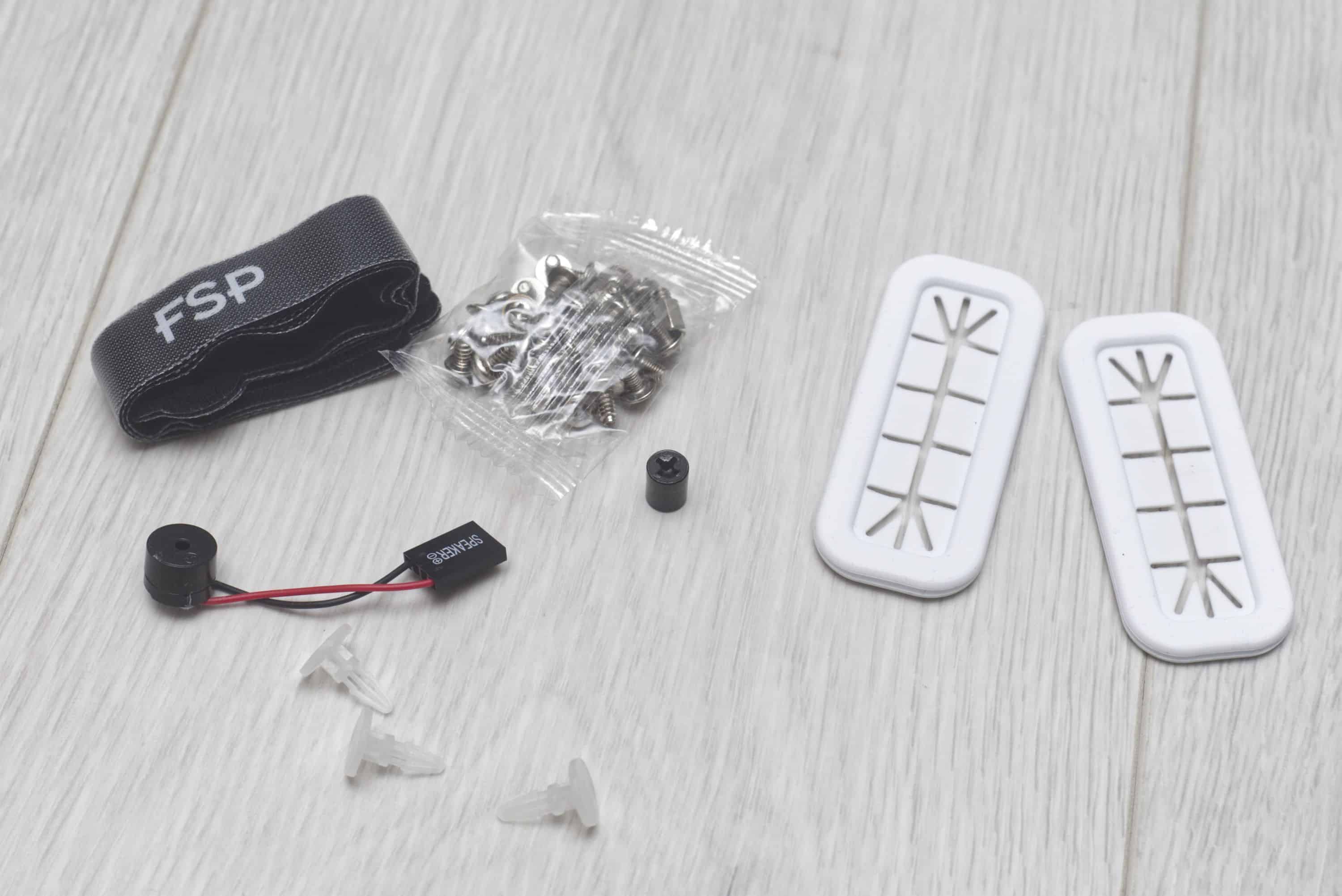 Im Festplattenkäfig steckt außerdem noch eine kleine Schachtel mit Zubehör: Silikon-Sichtschutz-Laschen, Klett-Kabelbindern, Schrauben und Abstandshaltern, einem Werkzeug zum Einschrauben von Abstandshaltern – und ein Mini-Speaker für das Mainboard. Gerade letzterer ist ein sehr ungewöhnliches Zubehörteil.