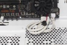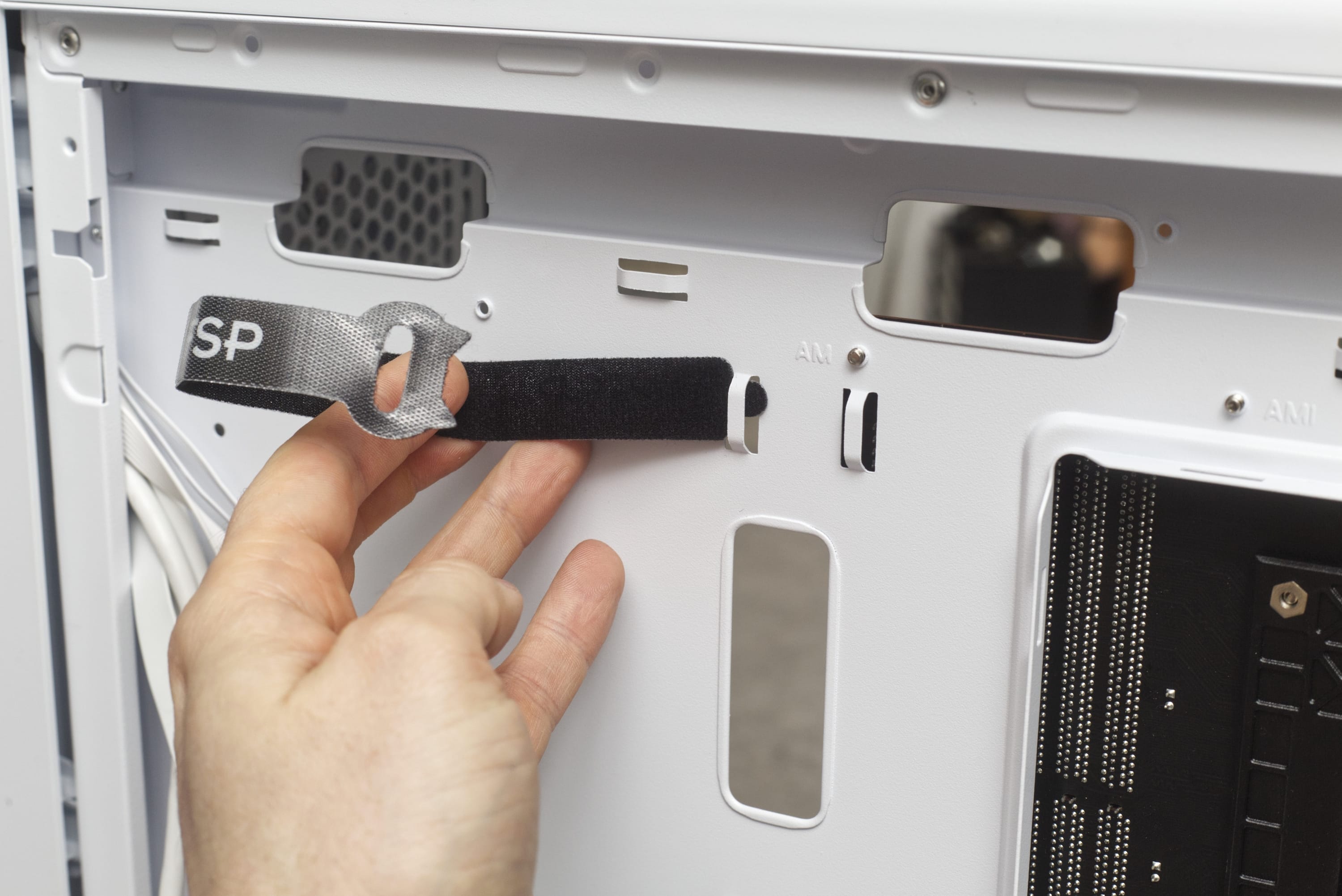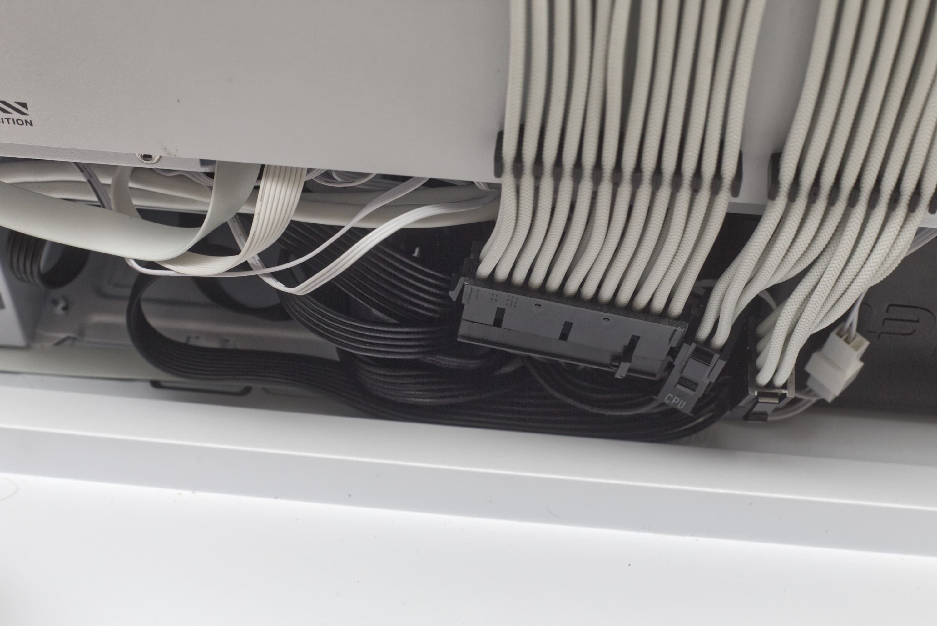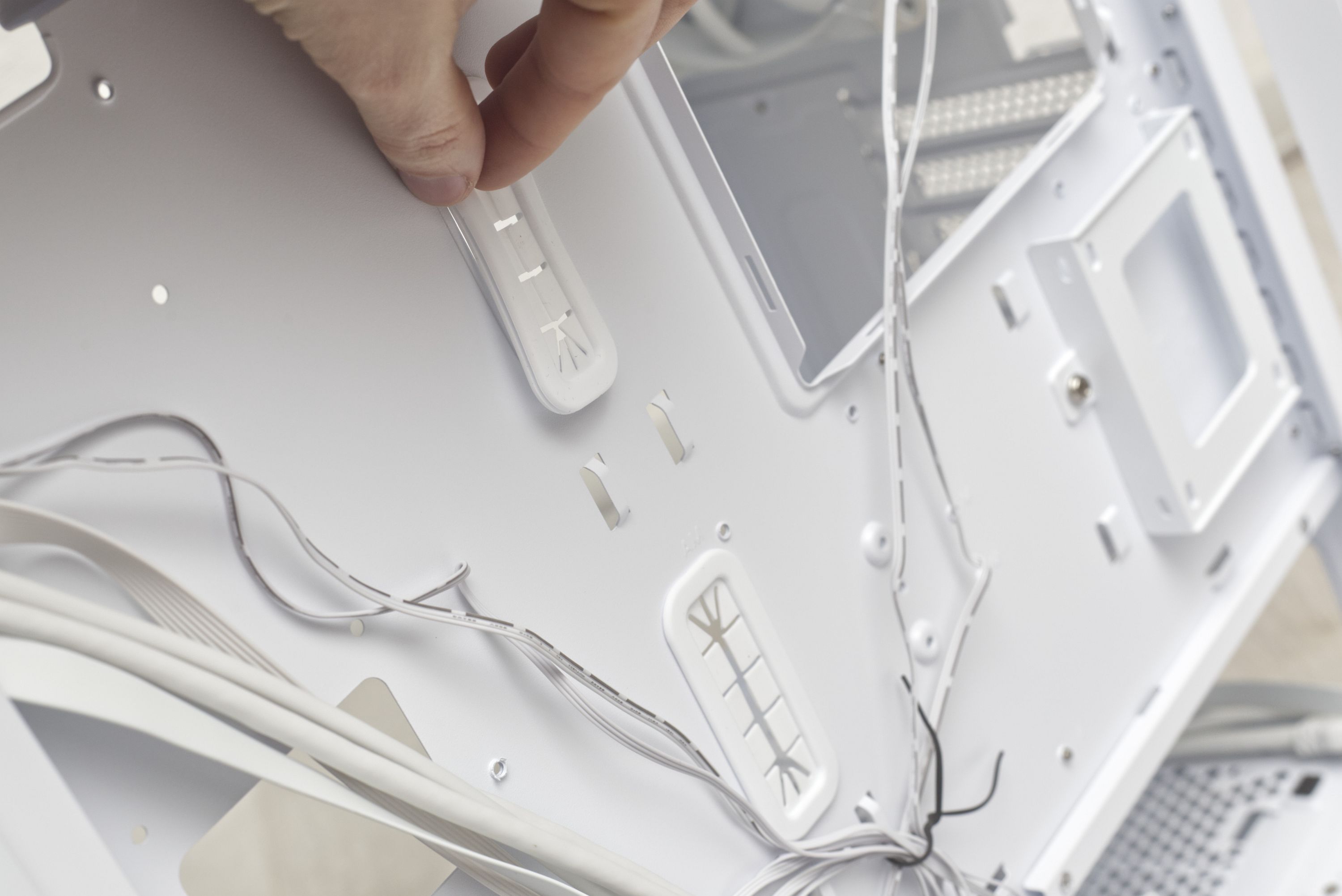 Kurzum: Was zunächst aussieht wie „Abdeckung drüber und die Kabelverlängerungen die Design-Magie übernehmen lassen“ ist letztendlich eine sehr haarige Kleinstarbeit beim Verlegen von Kabeln. Die mitgelieferten Kabelbinder erleichtern das nicht, denn diese sind offensichtlich nicht dazu gedacht, auf der Gehäuserückseite eingesetzt zu werden – sie sind zu breit, um in die Kabelmanagement-Halterungen eingeführt zu werden. Und überhaupt kollidieren die Befestigungspunkte mit der Abdeckung.