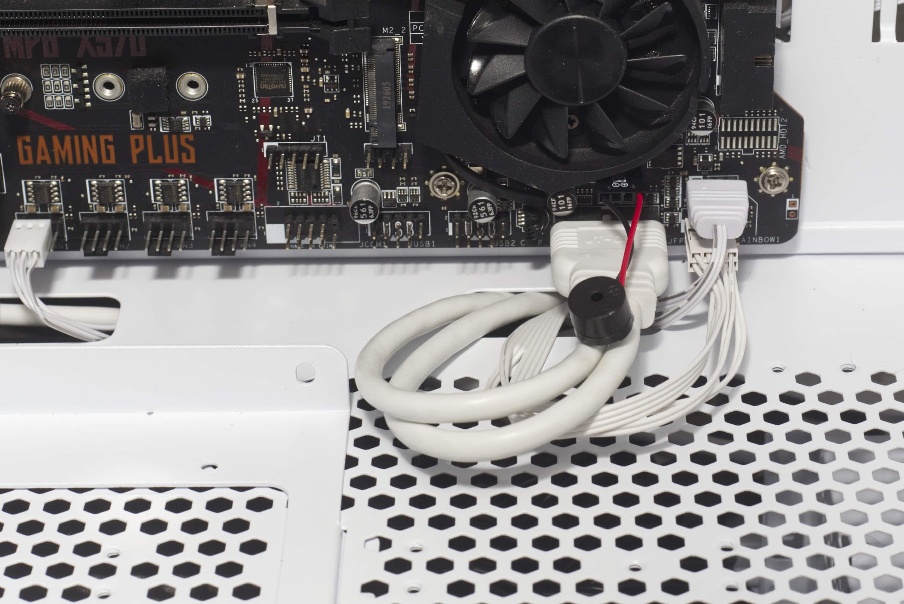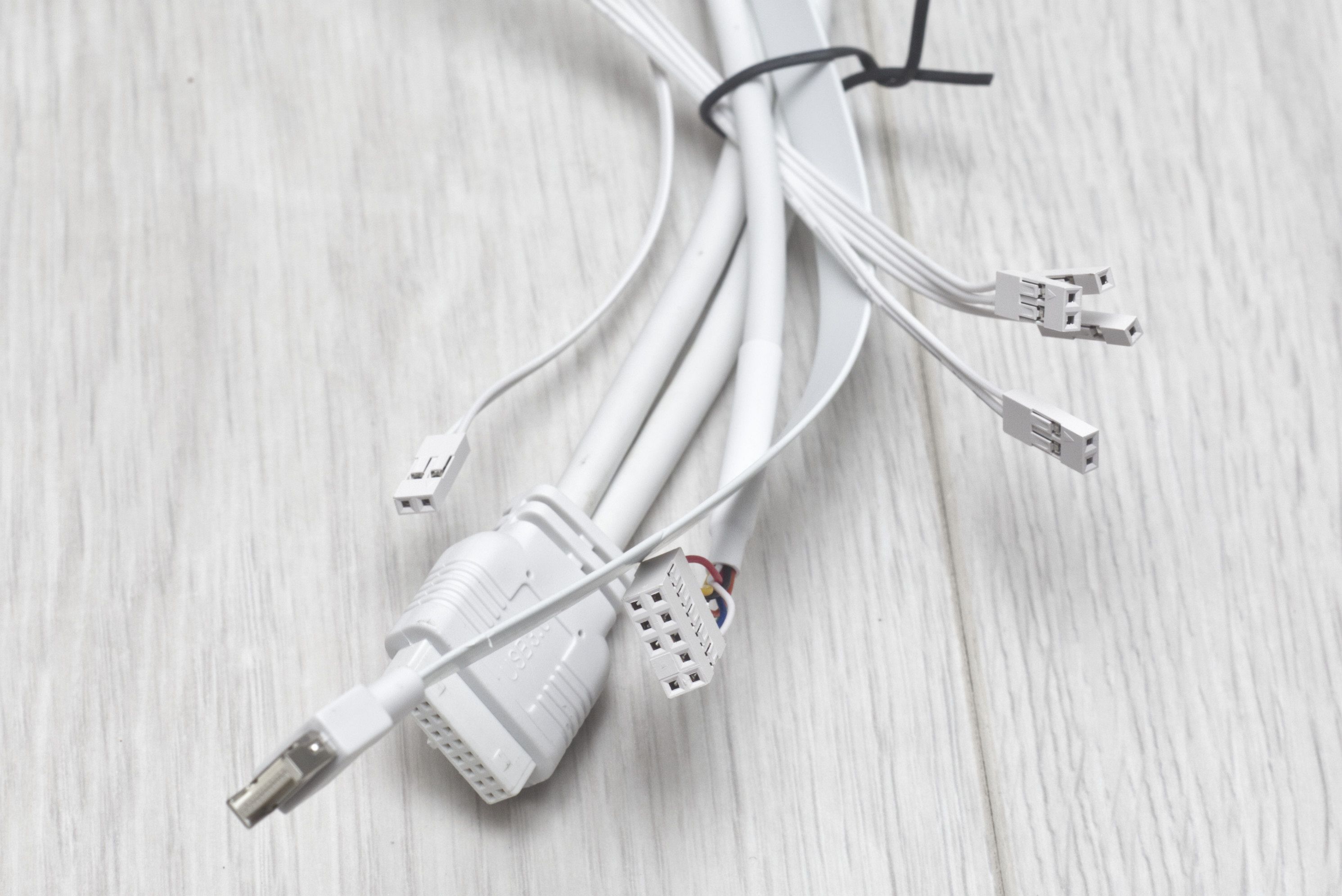 Dann gibt es keine Abstandshalter, die das Mainboard irgendwie in Position halten, ergo sollte das Gehäuse auf jeden Fall liegen, um das Mainboard ausrichten zu können. Auch die Frontpanel-Anschlüsse sind ein komplettes Set an getrennten Einzelsteckern, obwohl die Anschlussreihenfolge inzwischen durchaus standardisiert genannt werden kann. Dann gibt es auch keinen RGB-Controller, sodass das Mainboard für die Beleuchtung der Lüfter zwingend einen integrierten braucht, wenn man keinen zusätzlichen kauft.