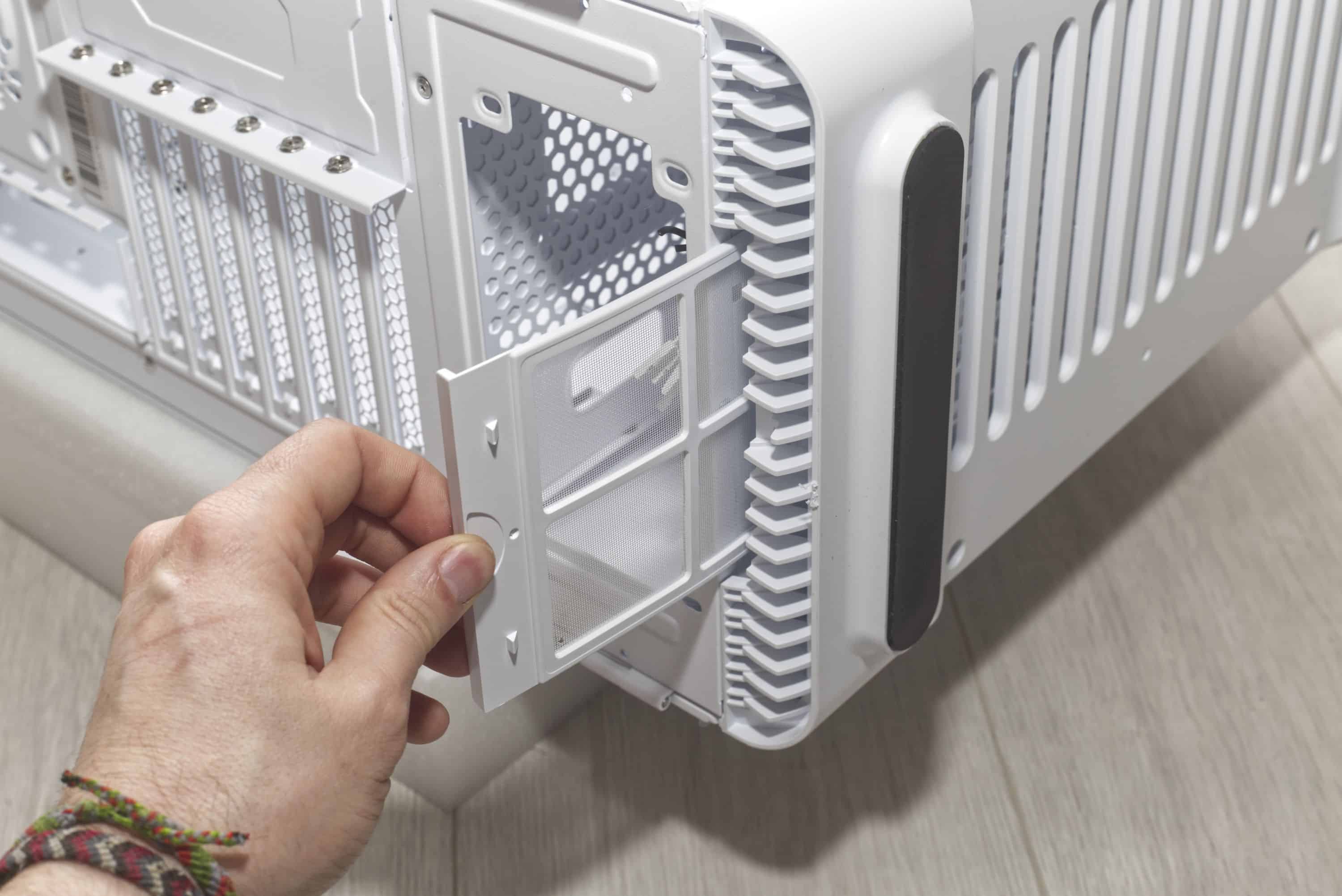 Auf den ersten Blick wirkt das FSP CUT593P wie ein Case mit einem sehr hohen Airflow durch die großen Löcher in der Front. Was allerdings den Luftfluss hierbei deutlich stört, das ist das durchsichtige Staubfilter-Gitter dahinter. Und dieses lässt sich auch nicht einfach entnehmen, sondern ist fest integriert. Das könnte im Laufe der Zeit auch die Reinigung etwas erschweren. Man könnte es vermutlich mit Gewalt und nicht-reversibel herausreißen. Aber das dürfte nicht gerade im Sinne des Erfinders sein.