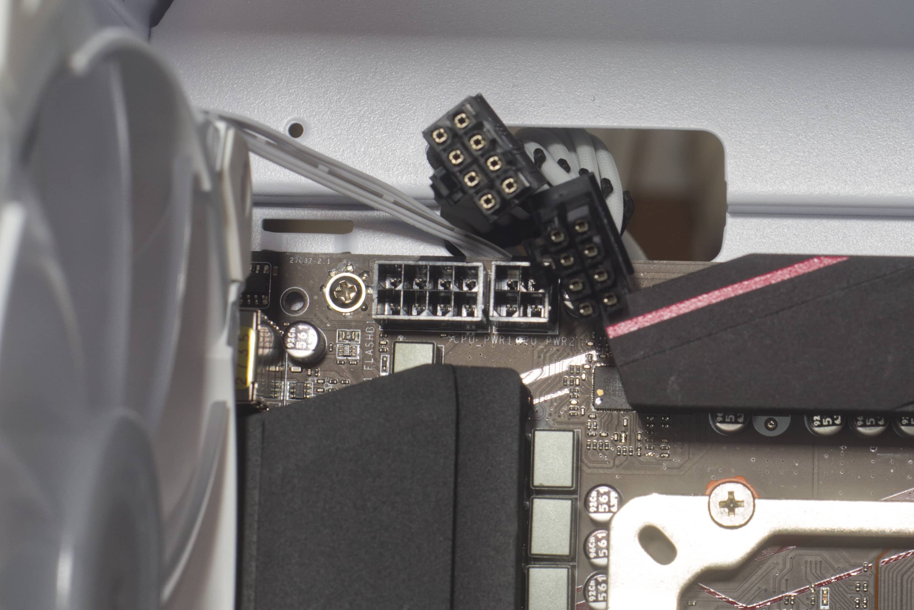 Und dann gibt es auch rein praktische Probleme: Die CPU-Stromkabel beispielsweise sind zwei 8-Pin-Kabel. Mein für den FSP CUT593P Test eingesetztes Mainboard ist ein MSI X570 Gaming Plus, das nur einen 8-Pin und einen 4-Pin-Anschluss besitzt. Wo die Anschlüsse von Netzteilen üblicherweise zu teilen sind in 4-Pin-Anschlüsse, ist das bei den Verlängerungen am FSP CUT503 Premium Edition nicht vorgesehen. Ergo kann ich hier lediglich einen 8-Pin-Stecker anschließen und muss den zweiten irgendwie optisch unauffällig daneben legen. Der 4-Pin-Anschluss bleibt komplett frei – das 8-Pin-Kabel passt rein physisch nicht.