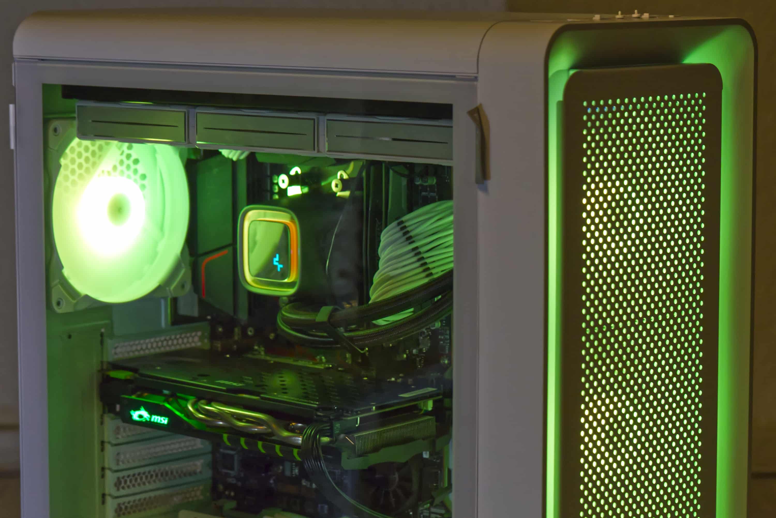 Im FSP CUT593P Test zeigt sich das Gehäuse als ziemlich geräumig. Um die in der Front montierten 140-mm-Lüfter so beibehalten zu können, denn so viele RGB-Lüfter sind ab Werk schon eine durchaus solide Ausstattung – gerade in der Größe, habe ich die 360-mm-AIO DeepCool LS720 in der Oberseite untergebracht, was weitestgehend problemlos umzusetzen war. Auch die darauf verwendeten, etwas dickeren Lüfter Lian Li Uni Fan P28 kollidieren nicht mit irgendwelchen Komponenten. Alternativ wäre auch die Nutzung eines Luftkühlers jeglicher handelsüblicher Größe möglich und selbst bei den Grafikkarten kann man die längsten Modelle einsetzen. Kurzum: Platz ist durchaus vorhanden.