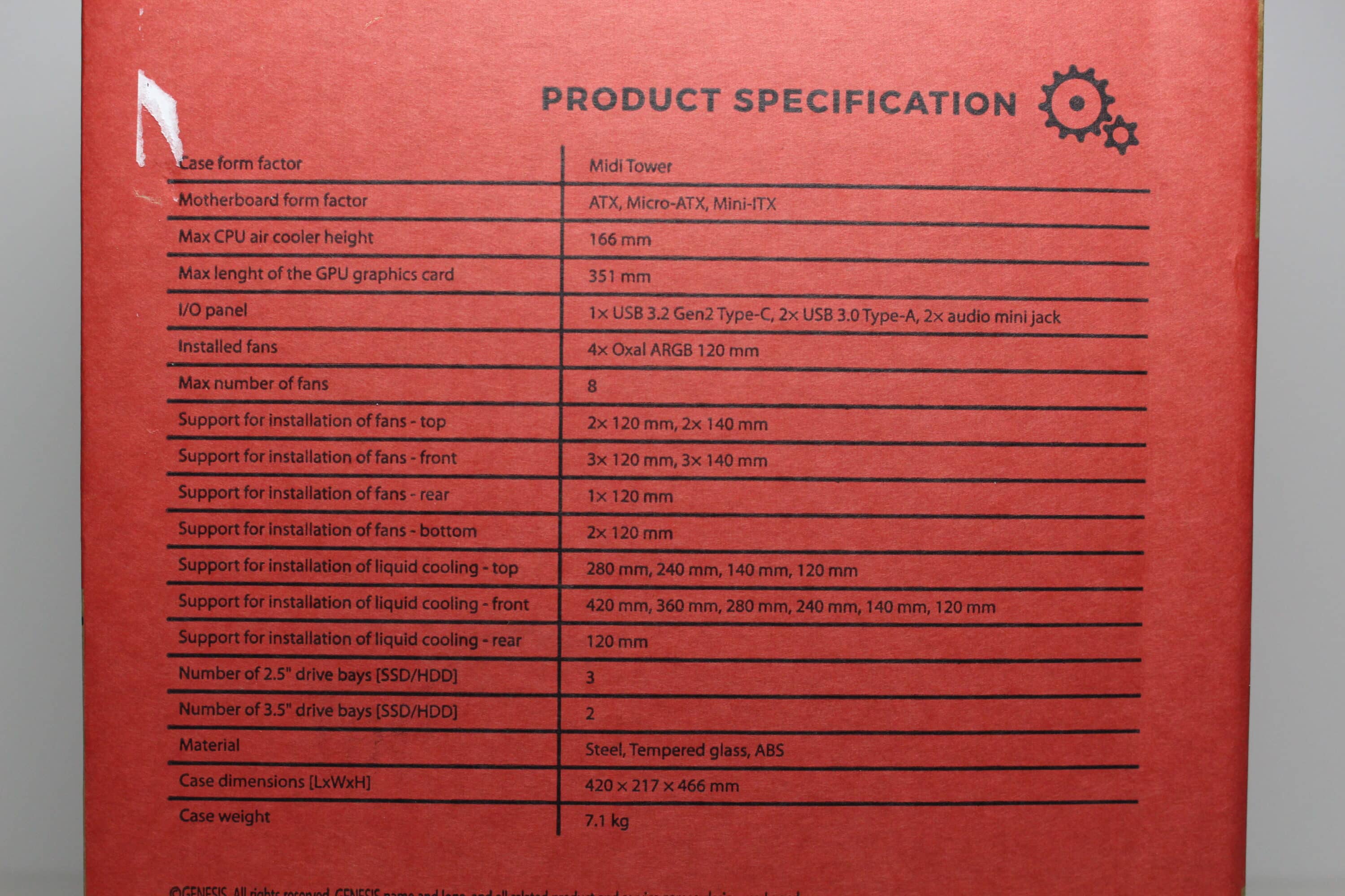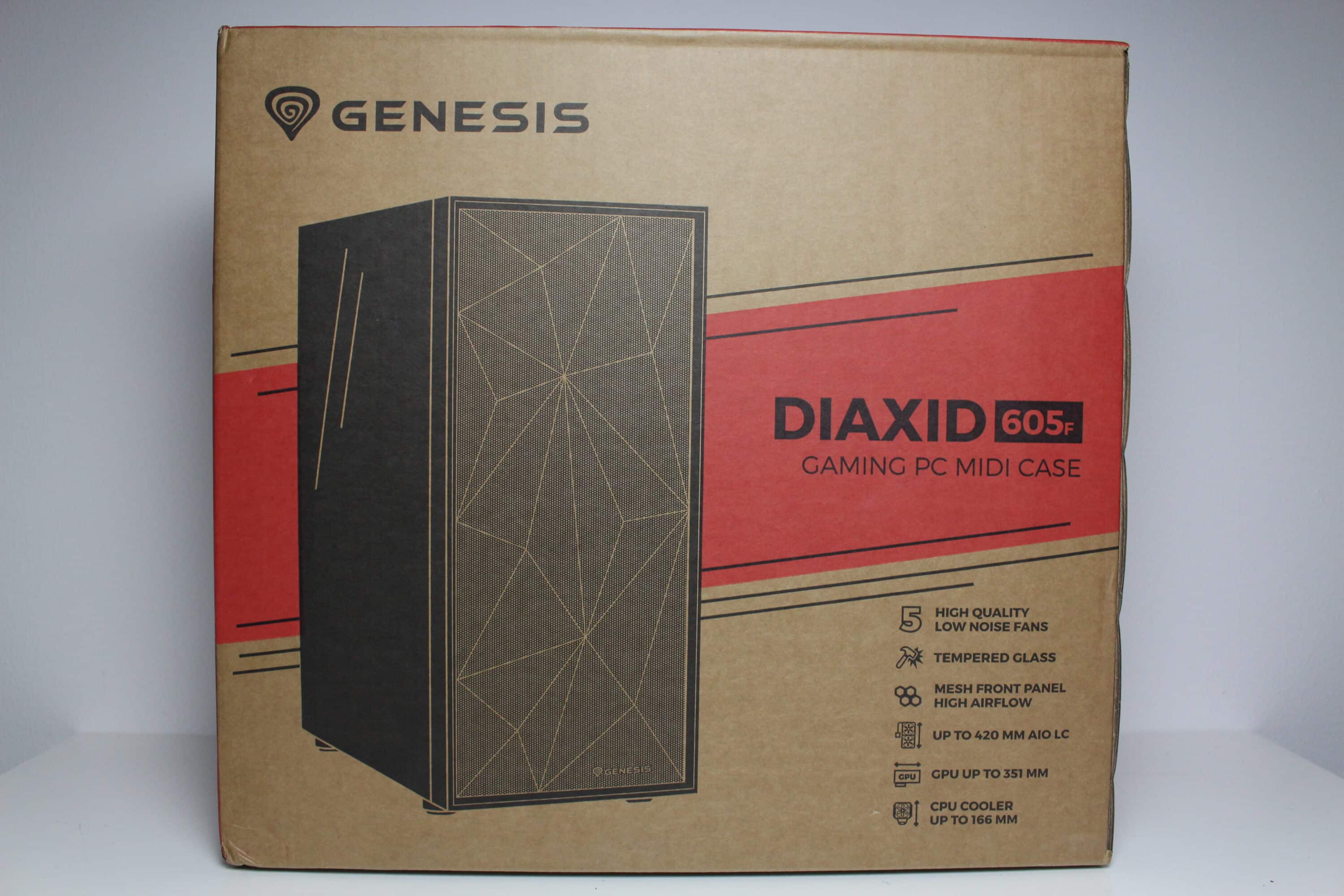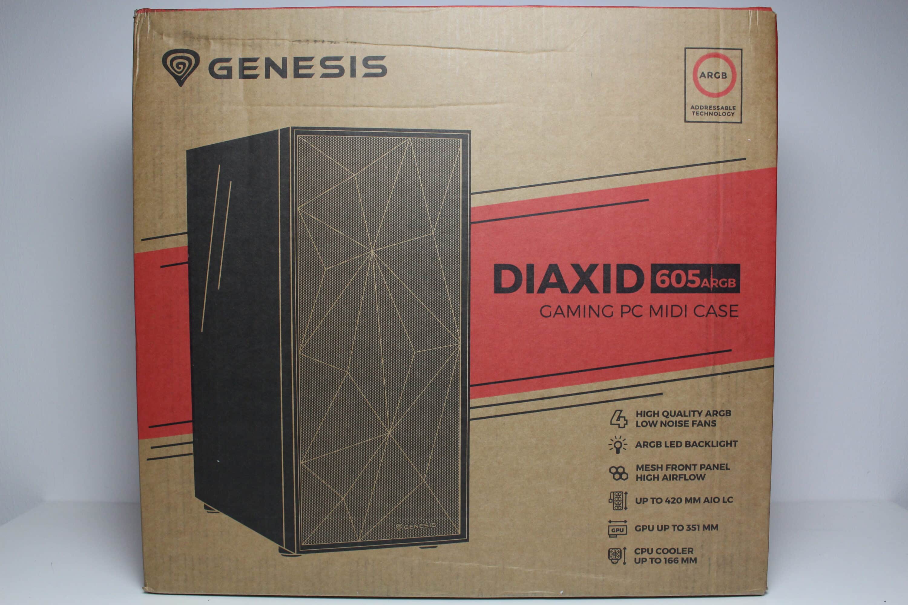 GENESIS verpackt beide Versionen des Diaxid 605 in einem verhältnismäßig schlichten Karton aus Pappe. Neben schwarz gedruckten Abbildungen des Diaxid 605 lassen sich auf der Verpackung zahlreiche rot bedruckte Flächen erkennen. Zusätzlich sind auf der Kartonage auch das Herstellerlogo sowie eine Auflistung der wichtigsten Features und eine Tabelle zu sehen, die alle wichtigen technischen Daten aufzeigt. Beim Diaxid 605 ARGB gibt es zusätzlich noch kleinere Hinweise auf die im Inneren verbauten ARGB-Lüfter.