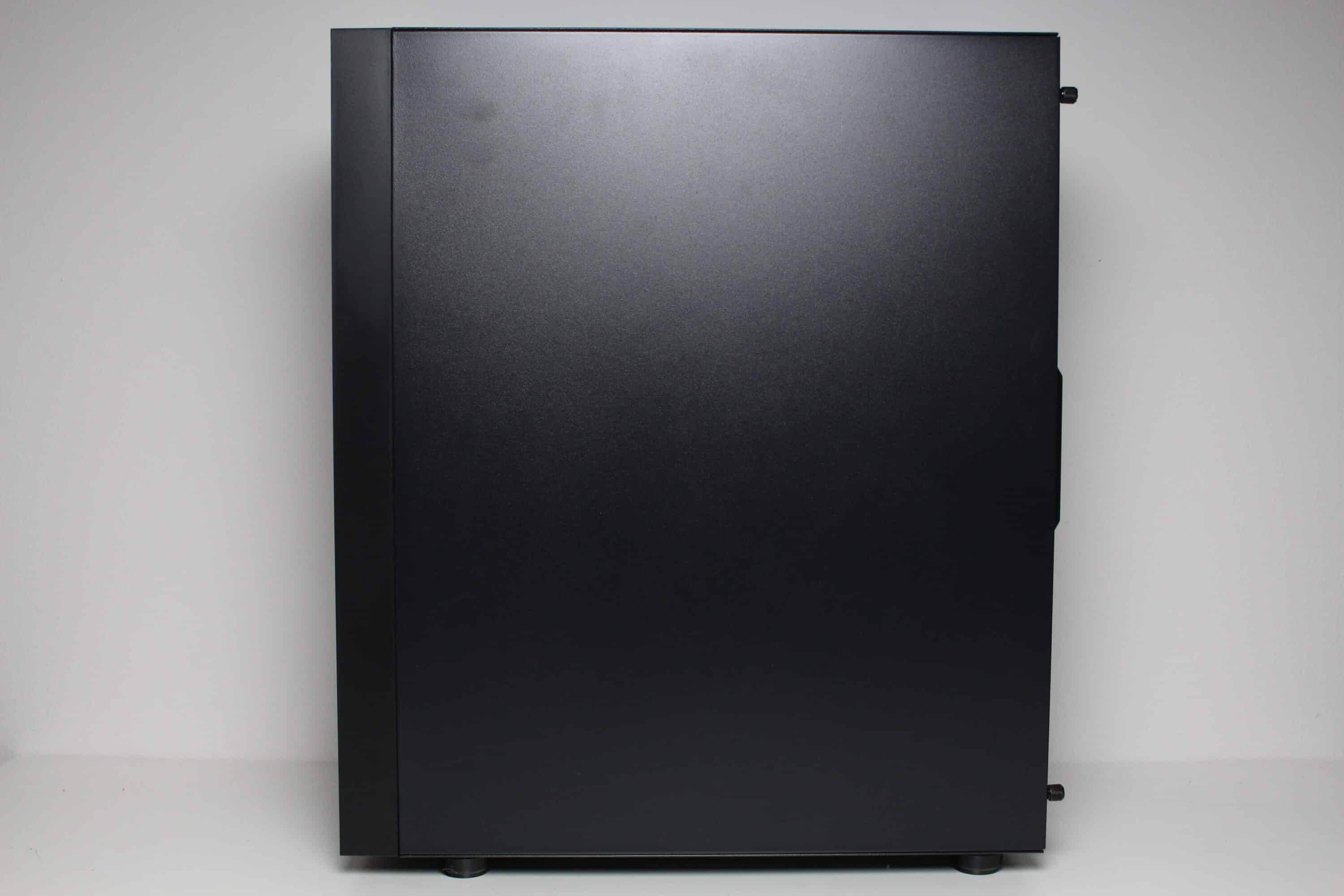 Wie es sich für ein modernes Gehäuse gehört, besteht das linke Seitenteil natürlich aus einem 4 mm starken Tempered Glass, welches zudem leicht getönt wurde. Zur Vereinfachung der Montage wurde die Glasscheibe zudem auf einen Stahlrahmen geklebt, der am Heck des Midi-Towers mit zwei Rändelschrauben befestigt werden kann. Das rechte Seitenteil besteht klassisch aus einem 0,7 mm dicken Stahlpanel, das neben Rändelschrauben auch über eine Griffmulde verfügt.