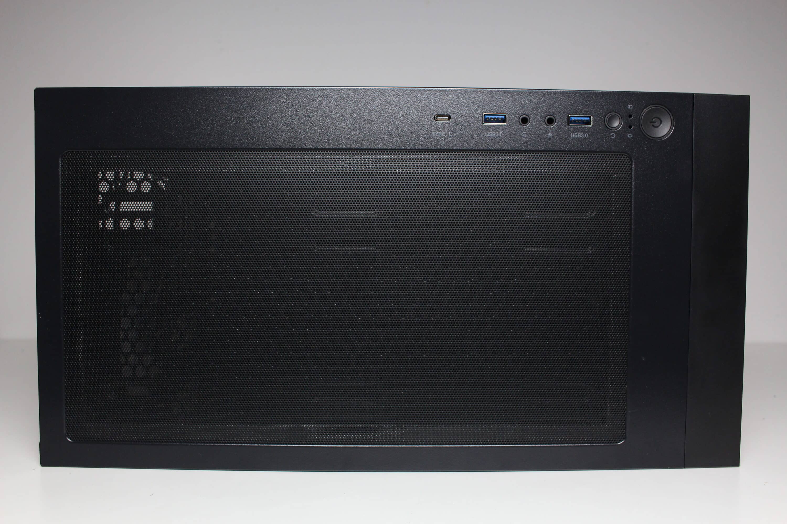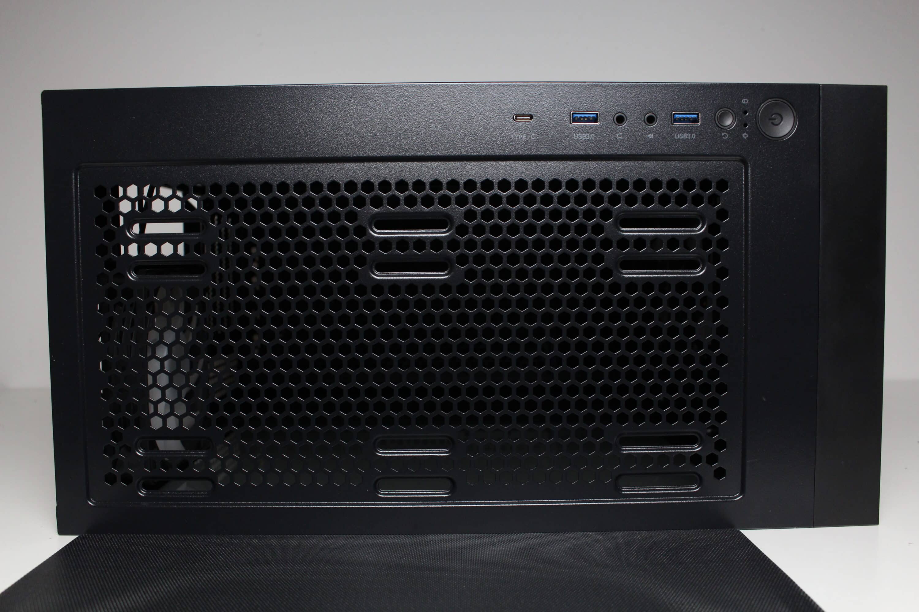 Auch wenn Genesis von einer einzigartigen Optik spricht, hat gerade das Frontpanel, aus unserer Sicht, optisch eine starke Ähnlichkeit mit dem Fractal Design Meshify bzw. dem Montech X3. So dominiert an der Front eine große Fläche aus Mesh, die mit einigen Ausbuchtungen versehen wurde. Dadurch wirkt das Gehäuse auch unbeleuchtet bereits etwas auffälliger bzw. verspielter. Löst man das Frontpanel mit Kunststoffrahmen vom Korpus, lassen sich dahinter Montageschienen für bis zu drei 120-mm (vorinstalliert) oder drei 140-mm-Lüfter erkennen. Einen zusätzlichen Staubfilter gibt es an der Front nicht, da die Rundungen des Meshgitters einen Durchmesser von 0,8 mm haben. Diese Struktur soll einen hohen Airflow gewährleisten und gleichzeitig groben Staub fern halten.